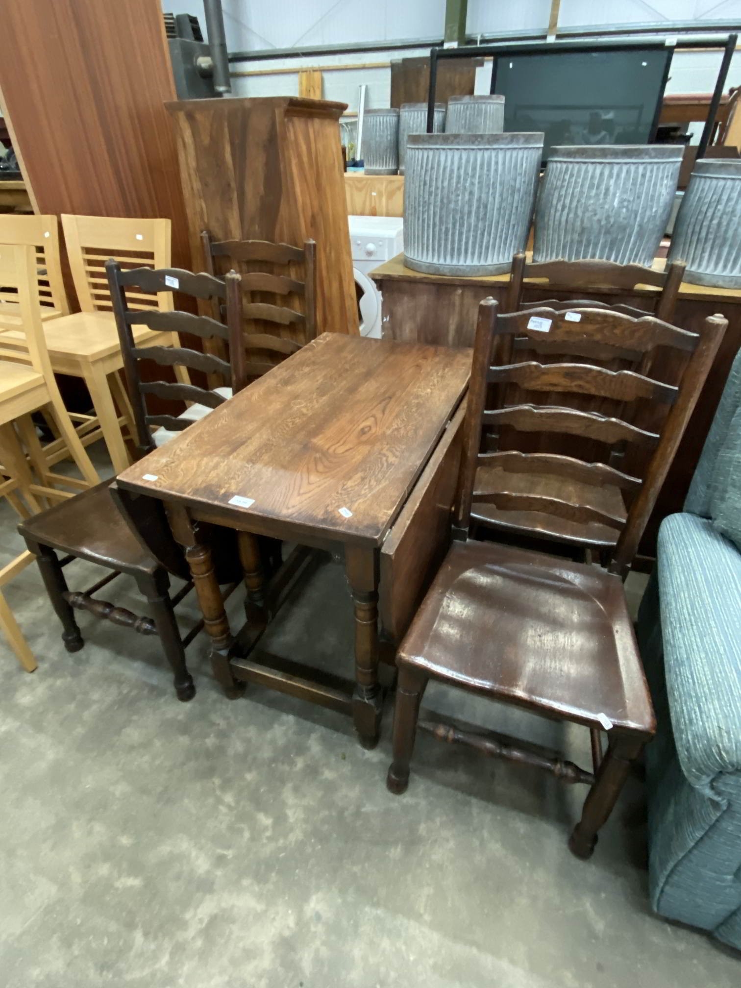 Oak drop leaf table 73H 150W 91D and 4 ladderback chairs