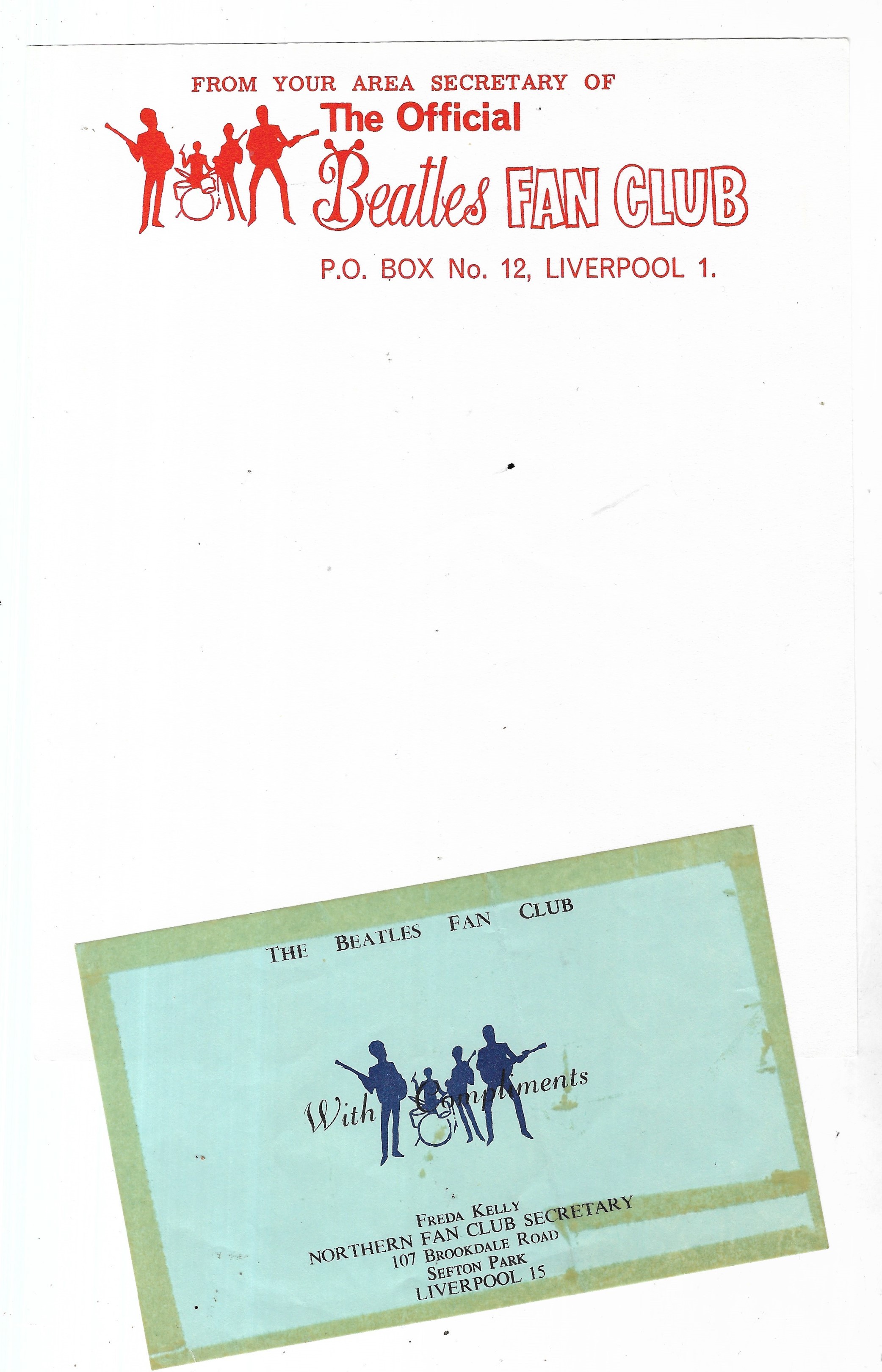 One sheet of Official Beatles Fan Club head paper and a compliments slip. These items are formerly the property of Beatles Fan Club secretary, Freda Kelly included a letter of authenticity signed by Freda