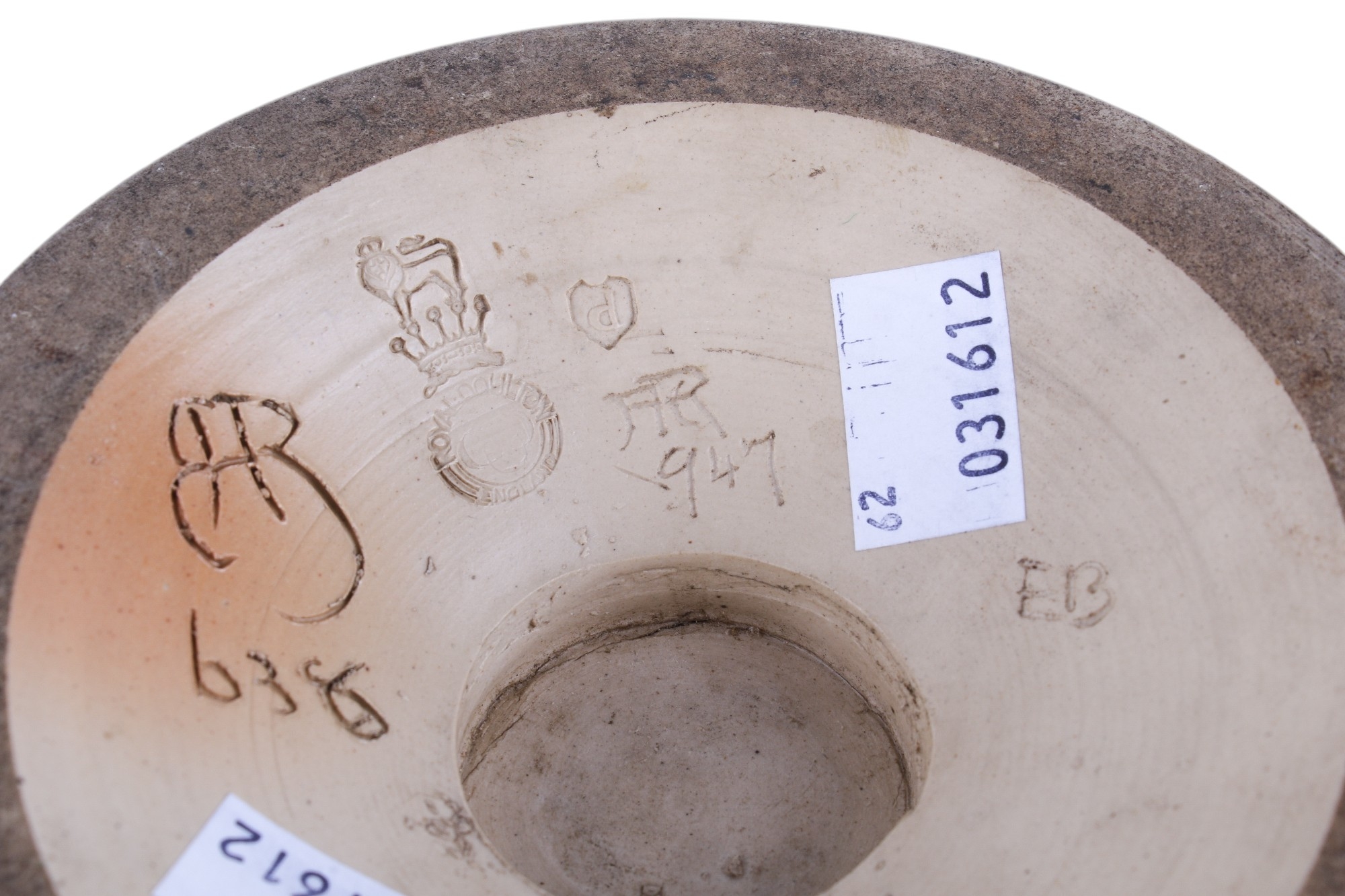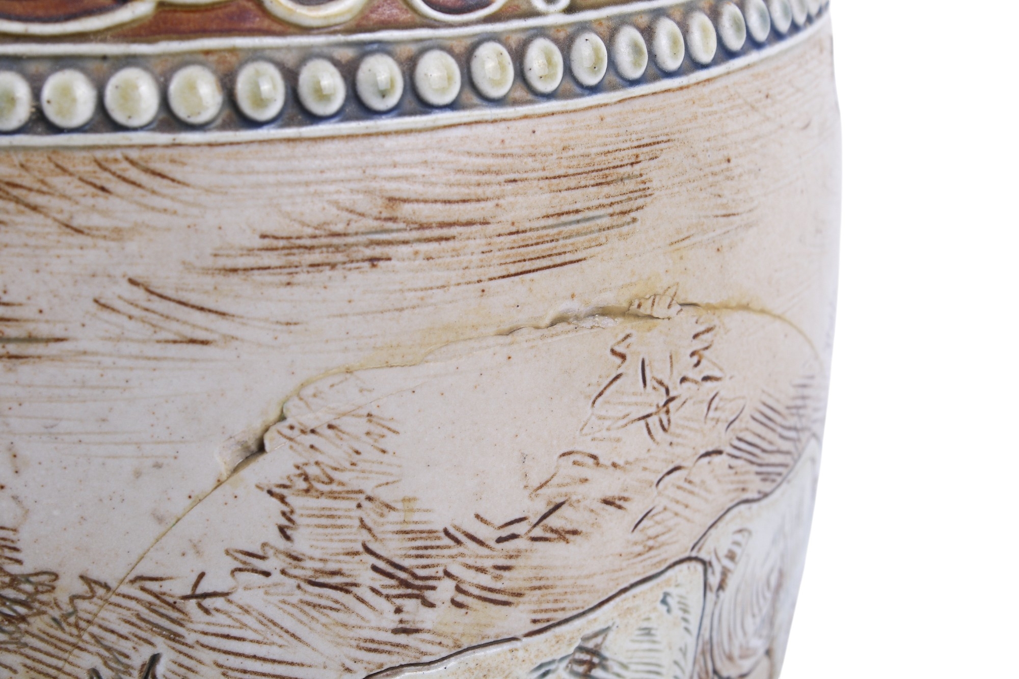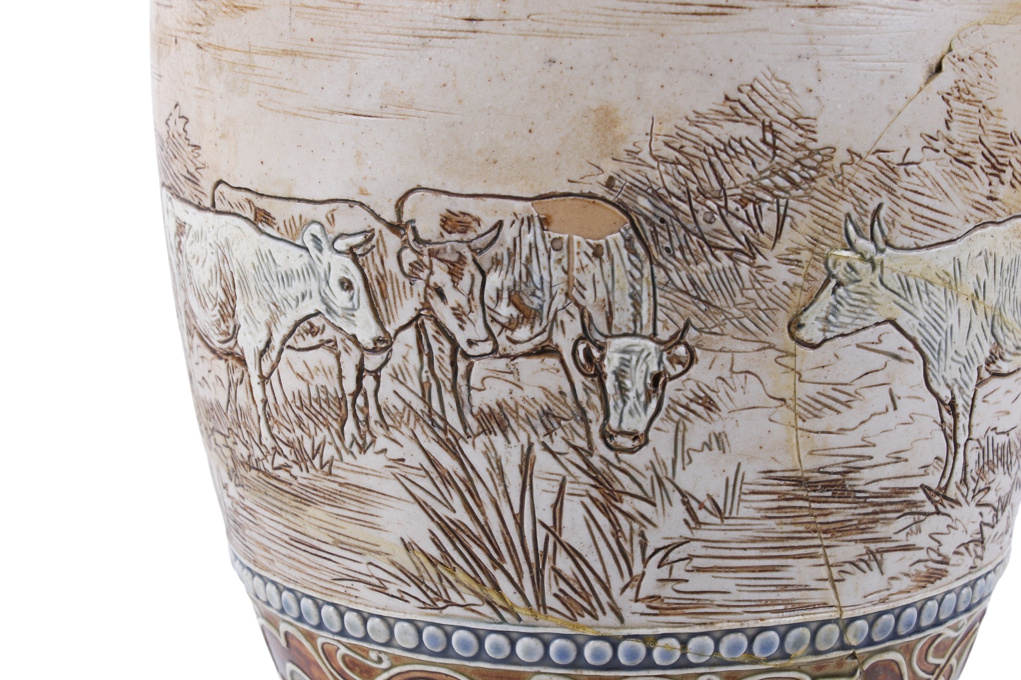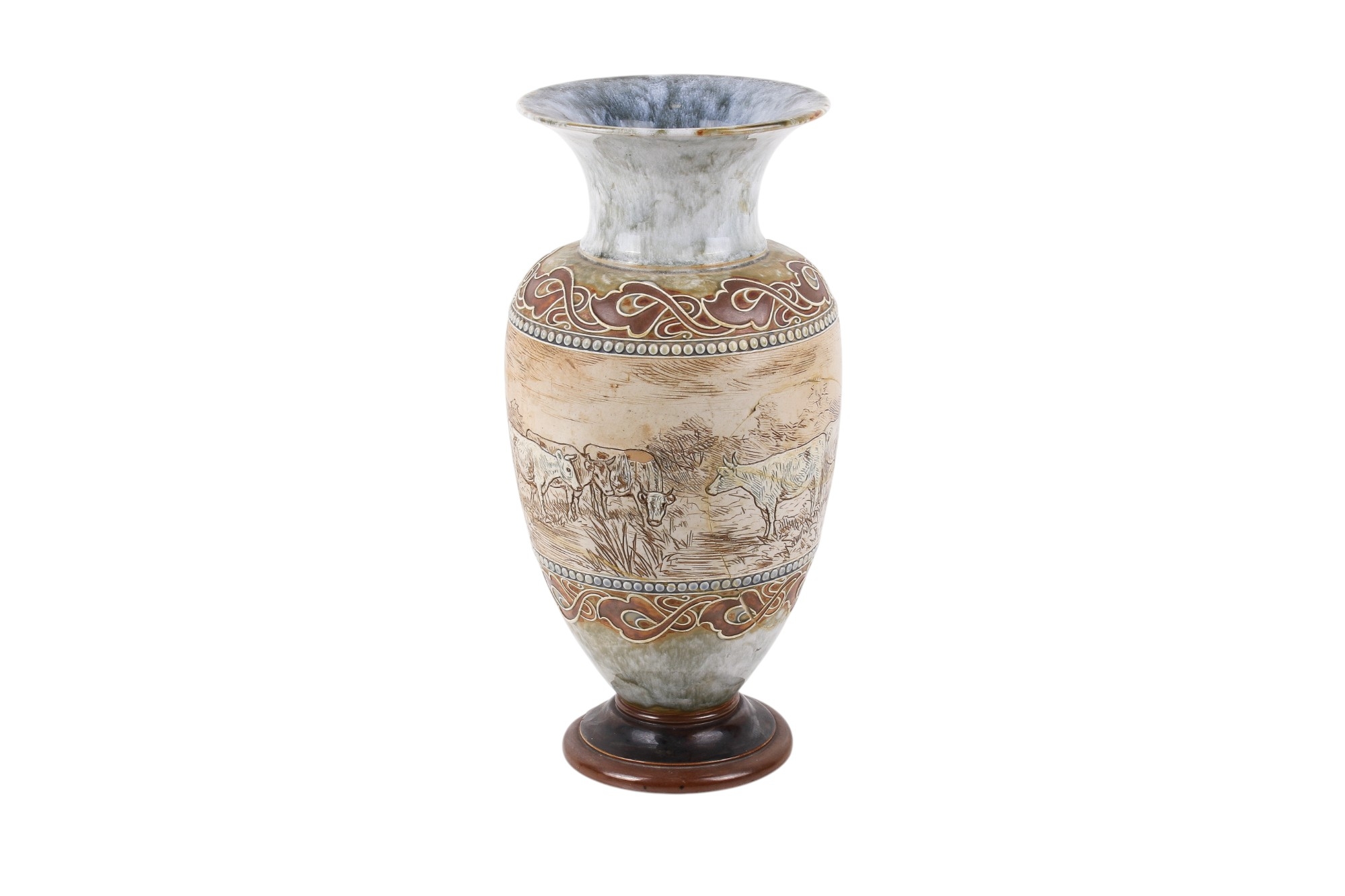A Royal Doulton stoneware baluster vase. Sgraffito decorated with horses and a foal in a leafy landscape within tube lined bands of scrollwork and flowerheads in the Art Nouveau manner, impressed Royal Doulton factory mark, various incised marks and numerals including the artist's monogram for Hannah Barlow assisted by Florence E Roberts and Ethel Beard, H38.5cm