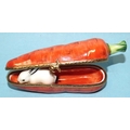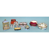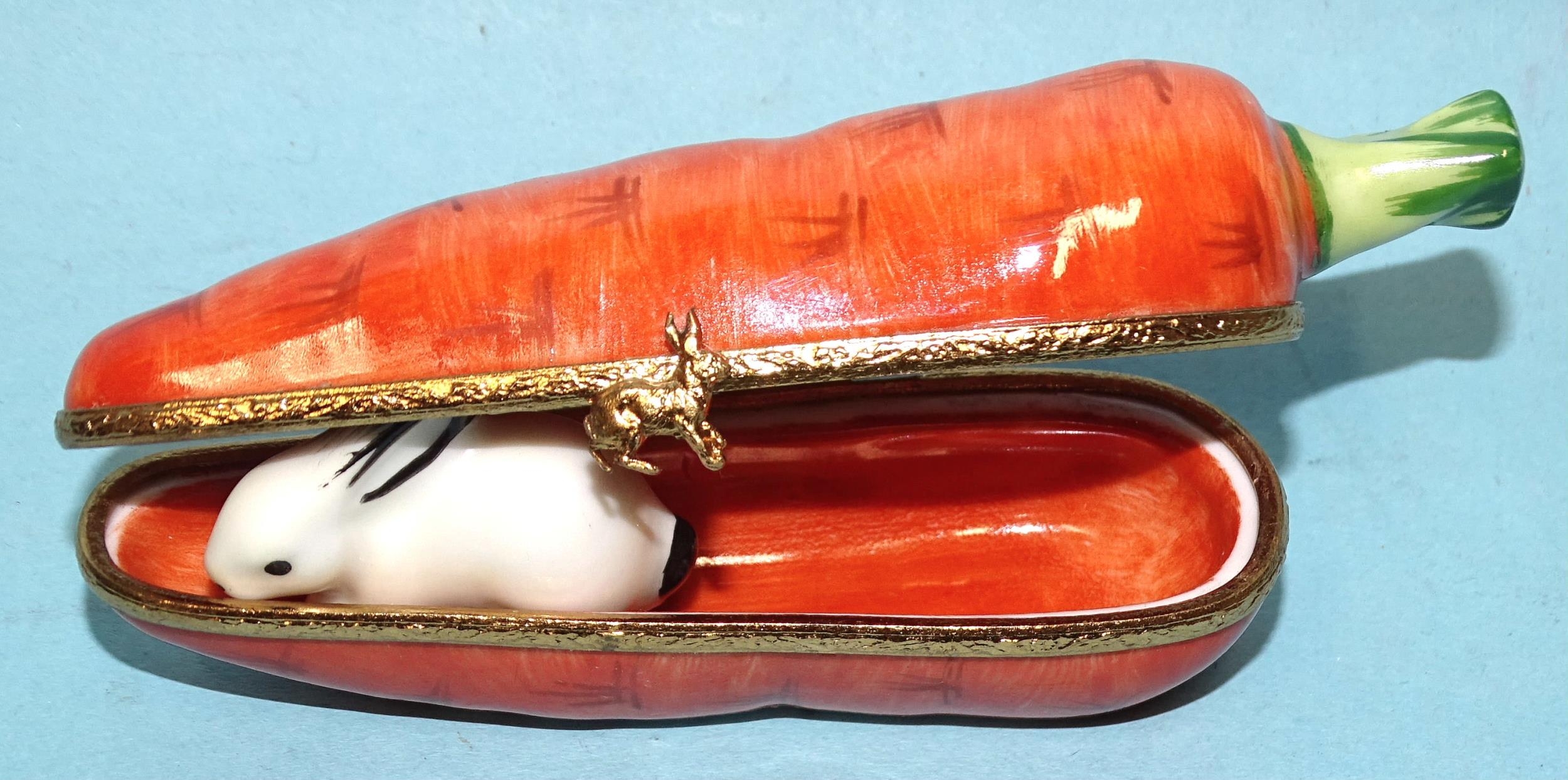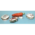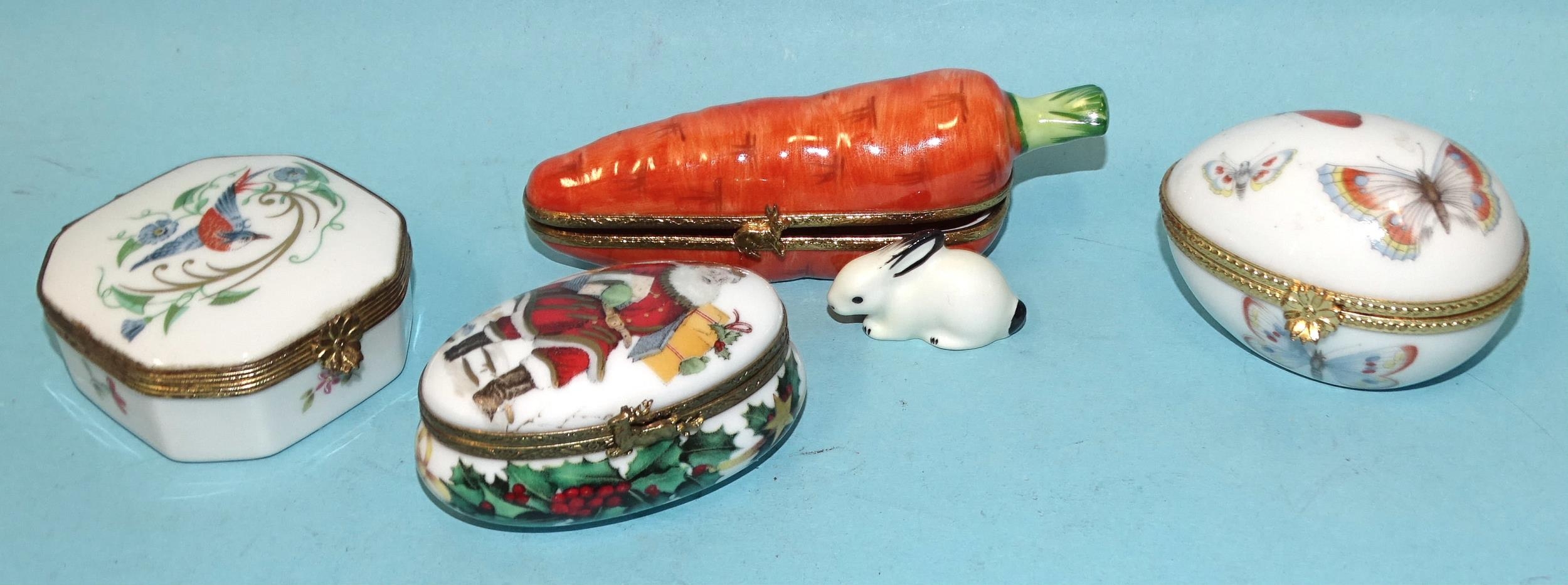 An Artoria Limoges Dubarry limited-edition porcelain carrot box containing black and white rabbit inside, no.65/1000, 10.5cm long, a Dubarry Limoges France oval-shaped porcelain box decorated with butterflies and two other boxes marked Limoges, France, one of Christmas theme with reindeer clasp, the other with transfer-printed bird and foliage design, (4).