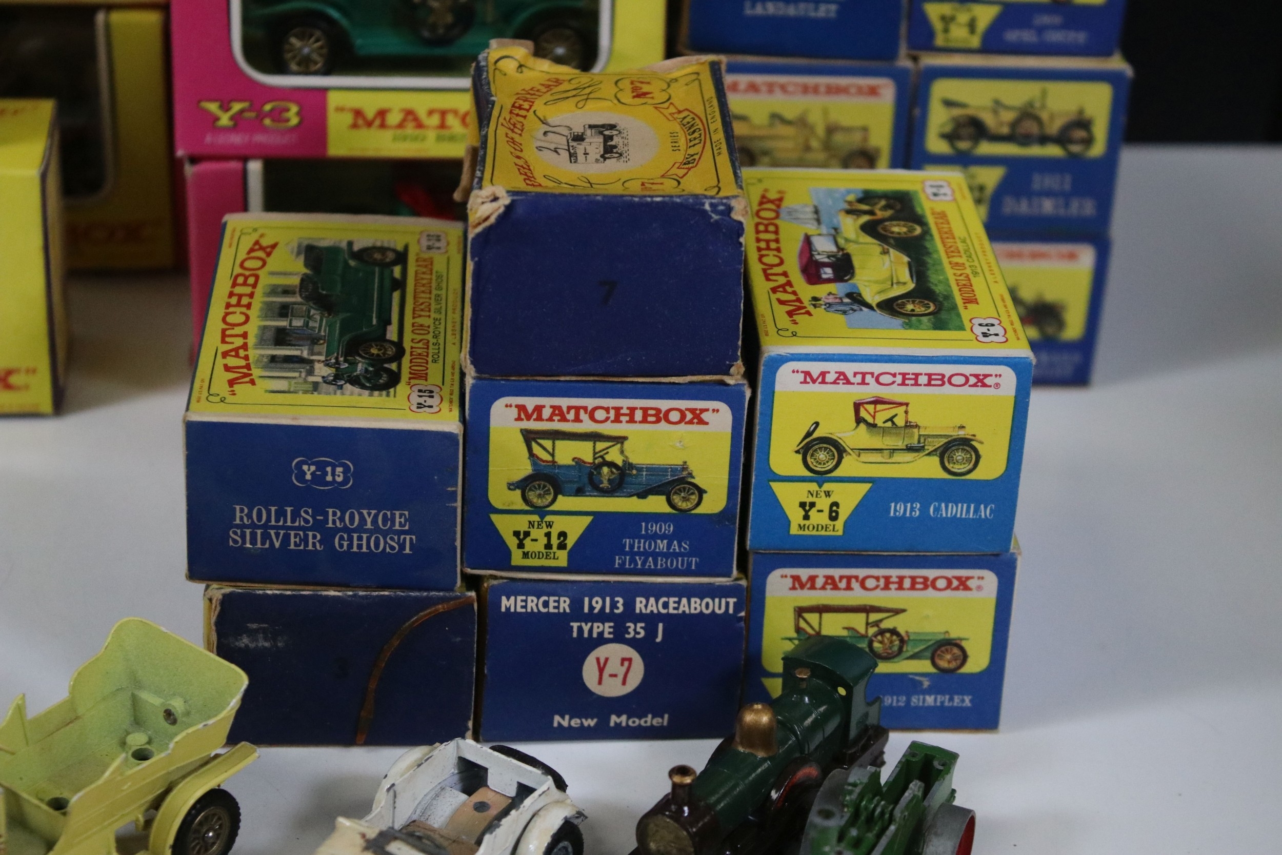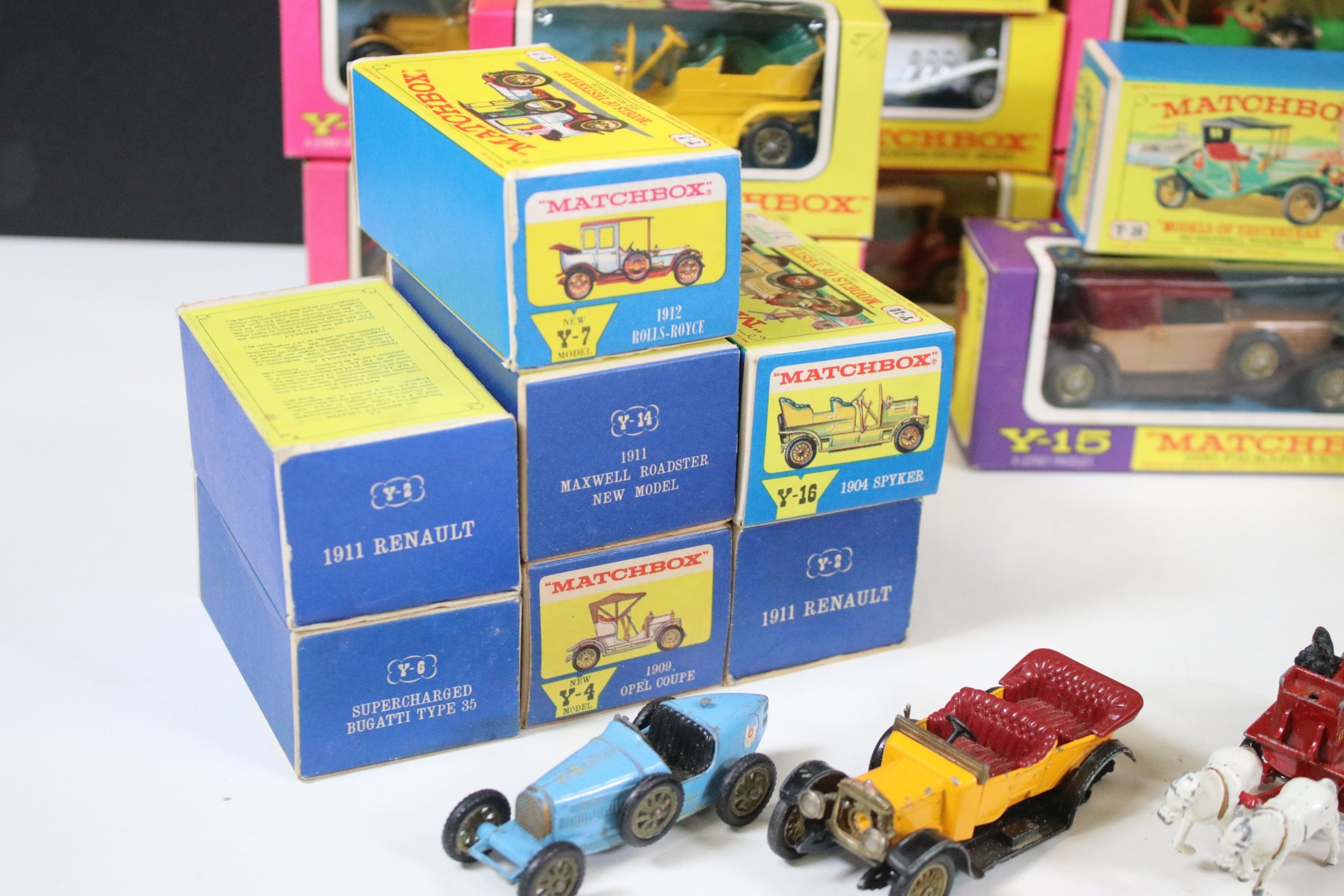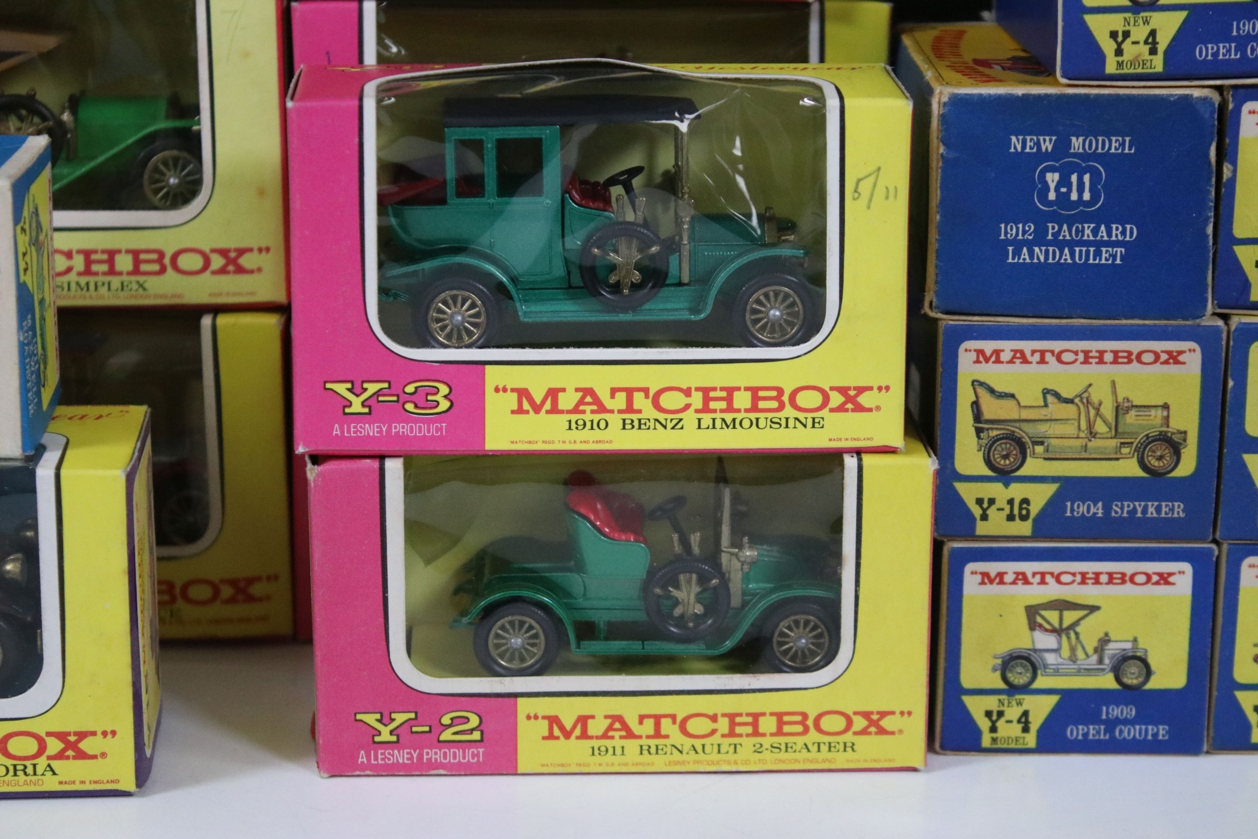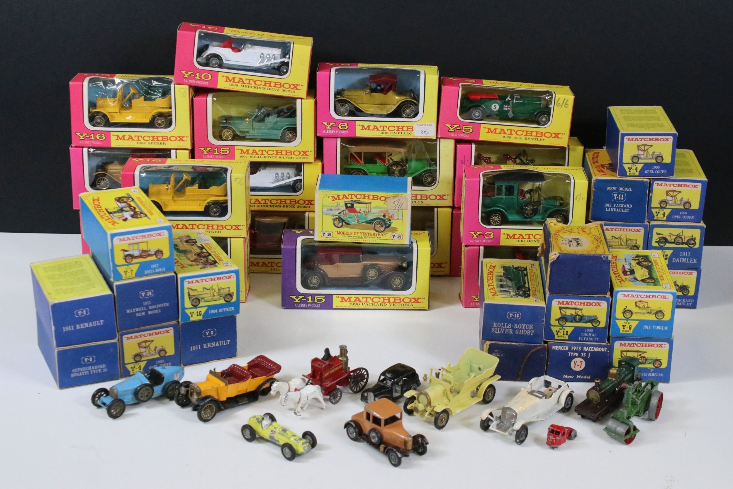 39 Boxed Matchbox Models Of Yesteryear diecast models to include Y-15 1930 Packard Victoria, Y-9 1912 Simplex, Y-16 1904 Spyker, Y-7 1912 Rolls Royce, Y-10 1928 Mercedes-Benz 36/220, Y-2 1911 Renault, Y-4 1909 Opel Coupe, etc, all diecast ex, boxes vg overall, plus a small quantity of unboxed Matchbox examples