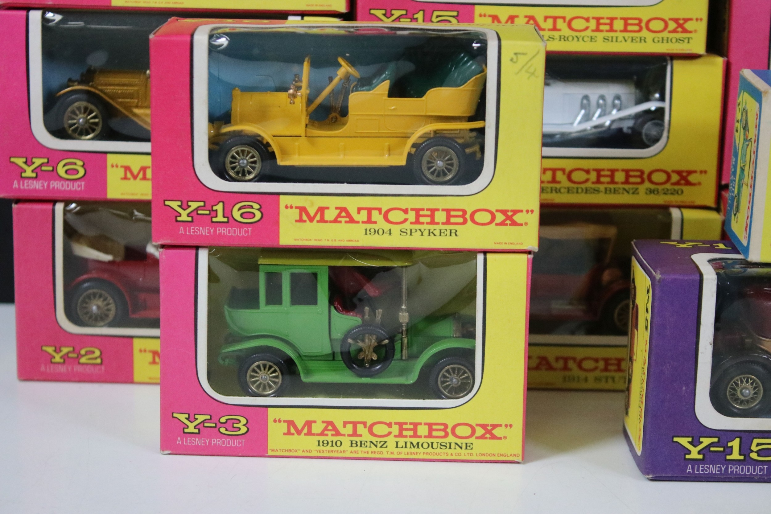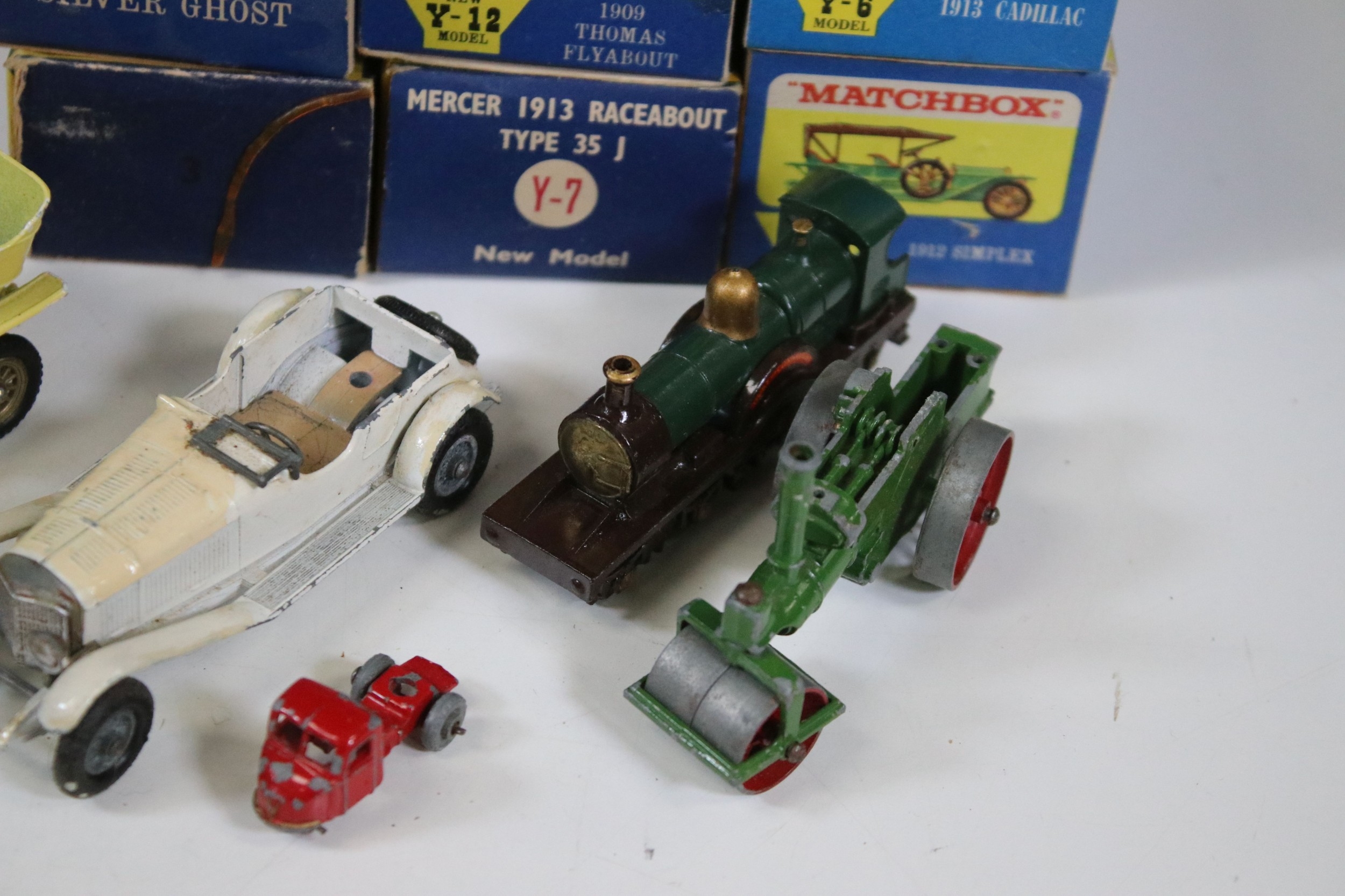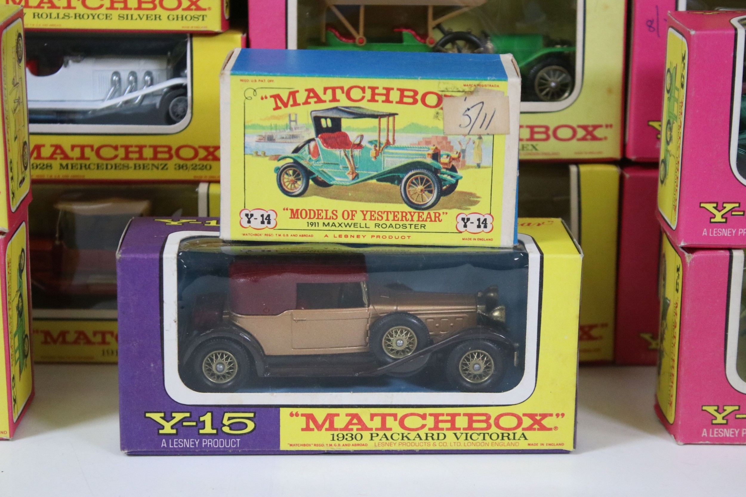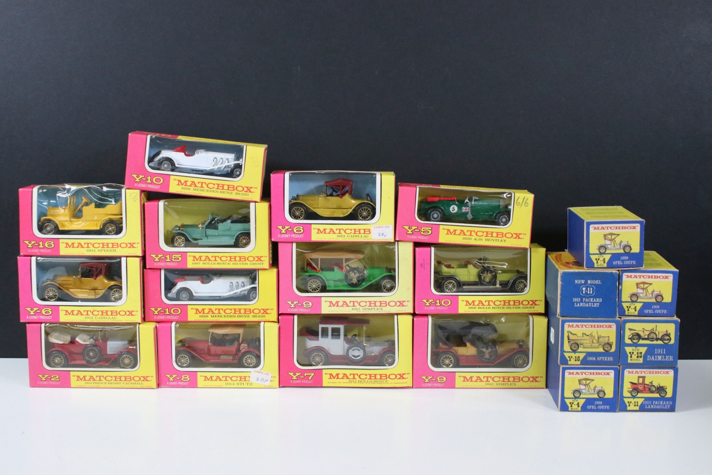 39 Boxed Matchbox Models Of Yesteryear diecast models to include Y-15 1930 Packard Victoria, Y-9 1912 Simplex, Y-16 1904 Spyker, Y-7 1912 Rolls Royce, Y-10 1928 Mercedes-Benz 36/220, Y-2 1911 Renault, Y-4 1909 Opel Coupe, etc, all diecast ex, boxes vg overall, plus a small quantity of unboxed Matchbox examples