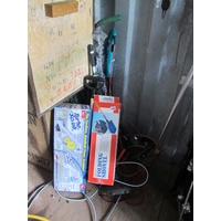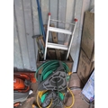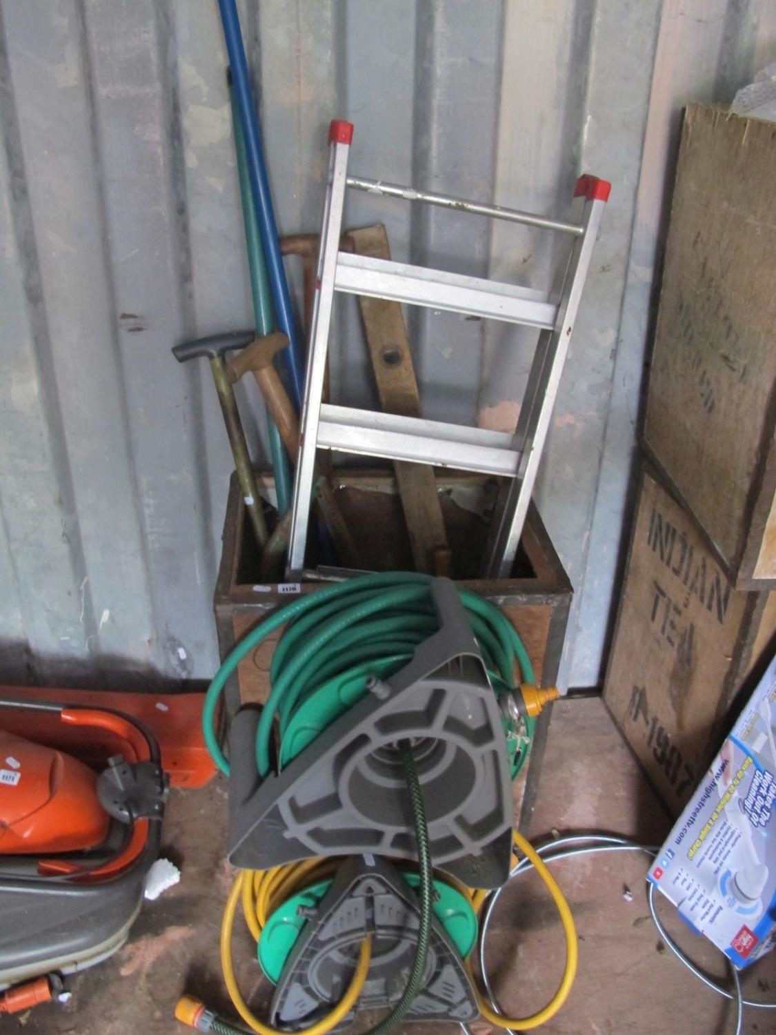 Quantity of Garden Tools, spades, rakes, steps, etc; plus two wind-up hoses, shears, etc. (3)