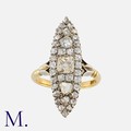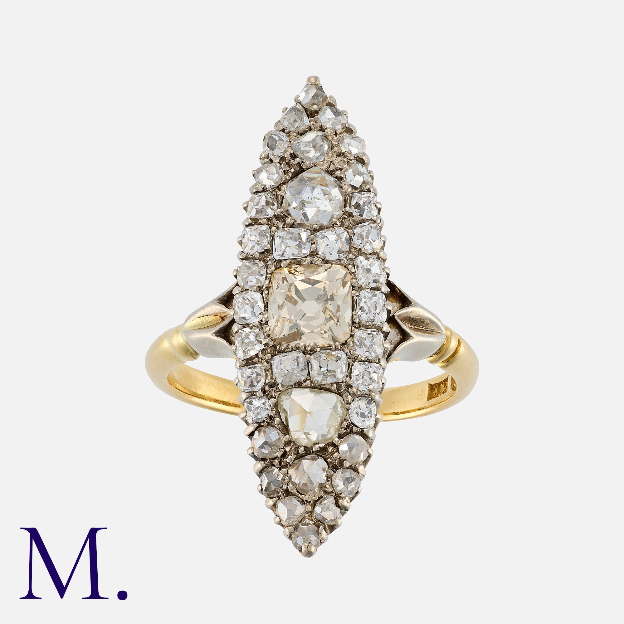 An Antique Diamond Navette Ring in yellow gold and silver, the navette shaped body set with a principal square-cushion shaped old cut diamond of approximately 0.65 carats, accented with further rose cut diamonds and old cut diamonds, all diamonds totalling approximate 1.25 carat. Marked 18ct, H&S Maker's mark.