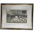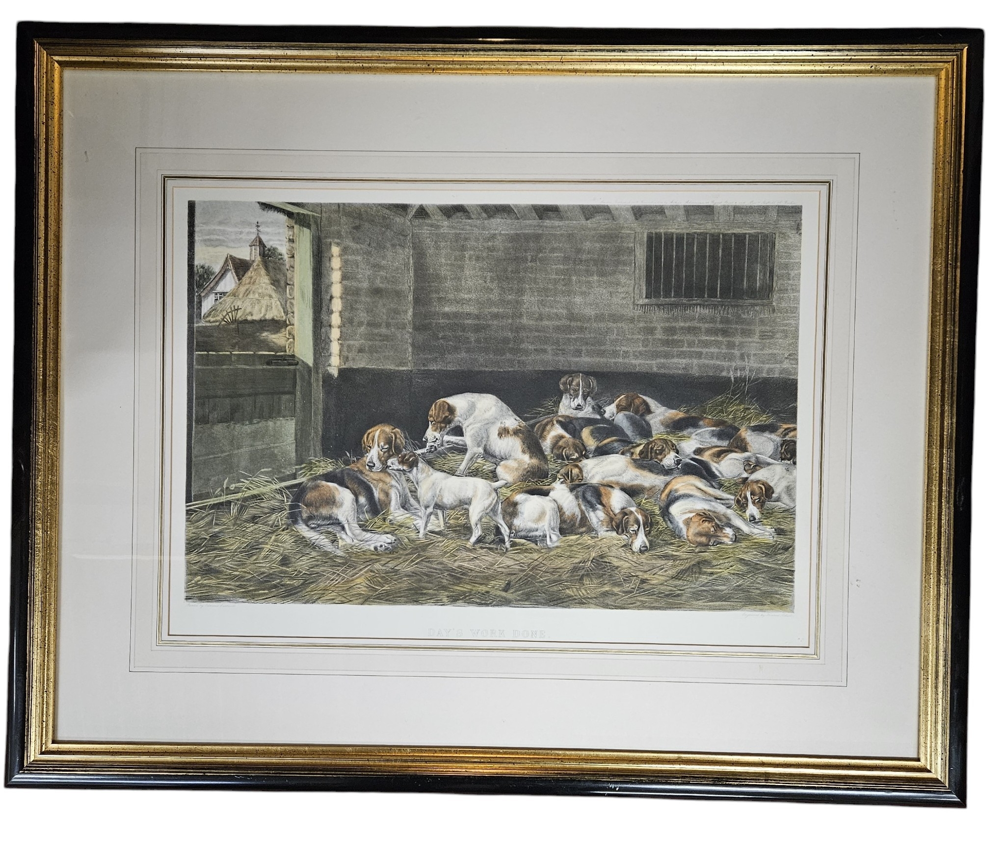 After Edmund Cauldwell. Depiction 'Days Work Done' a 19th Century hand coloured Engraving of a group of Hounds relaxing after a hunt in a well ebonised and gilt frame. 65 x 83 cm approx.