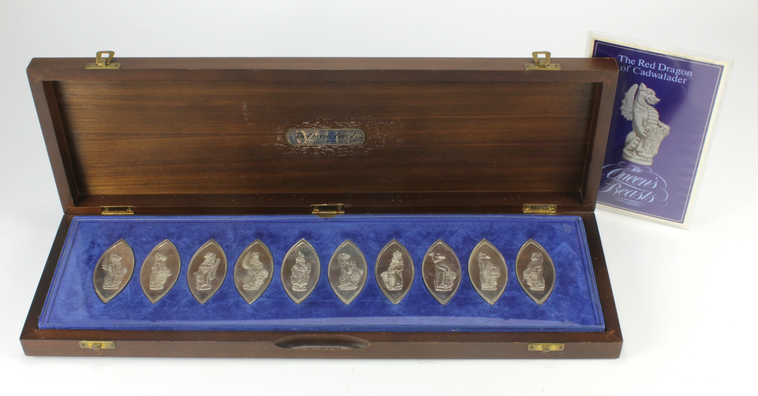 British Commemorative Medals/Ingots (10) hallmarked sterling silver: The Queen's Beasts, The Queen's Silver Jubilee 1977 by the Danbury Mint, GEF cased with certs. Contains 14.4 troy oz actual silver weight.