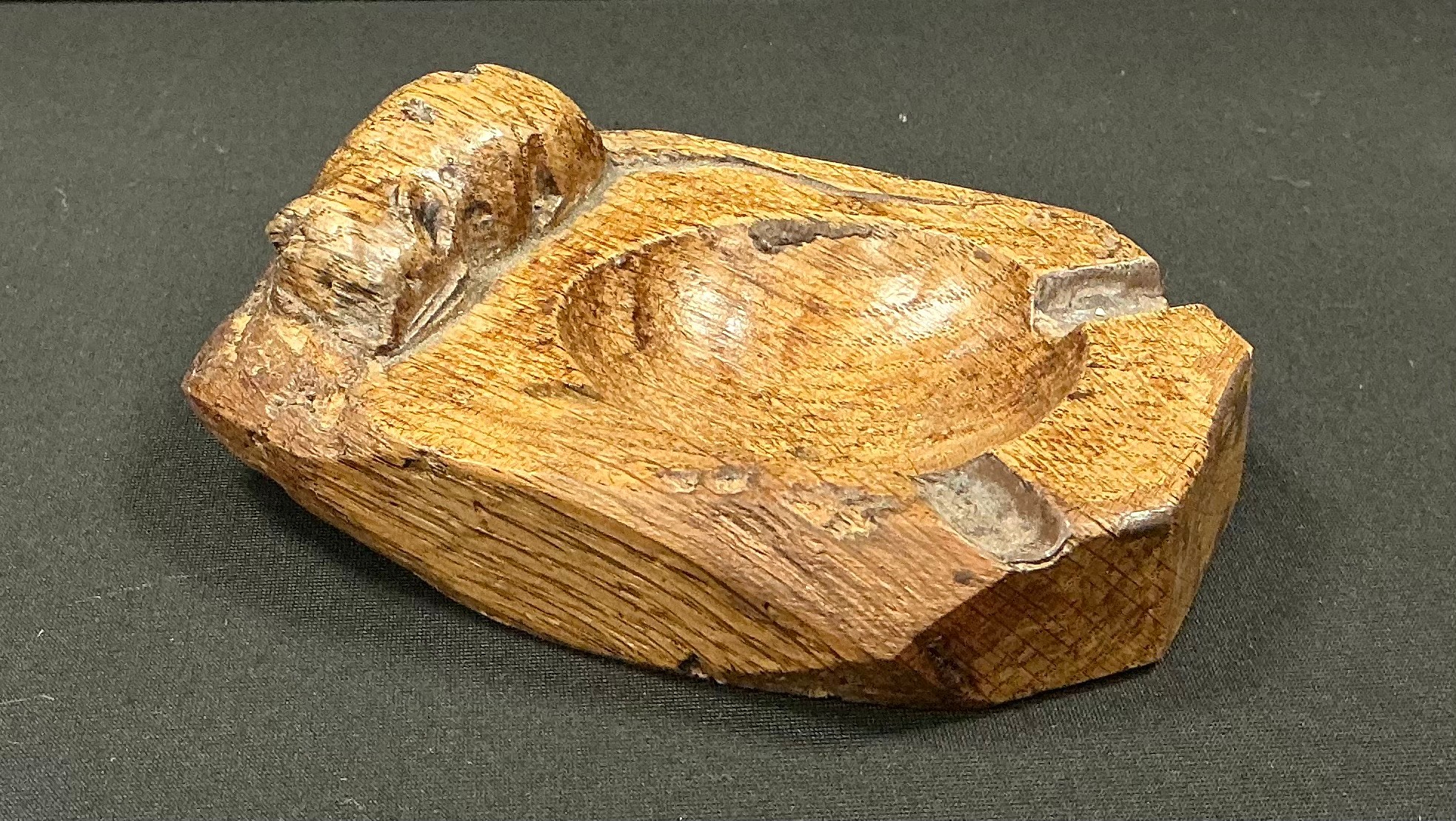 Robert Mouseman Thompson of Kilburn (1876-1955) - a carved oak rectangular ashtray, with signature mouse, 10cm x 7.5cm