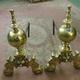 Brass & Iron Andirons C17th Style with lions mask centres, ball & claw feet & large turned Orb & spire, 19'H x 22'D approx.