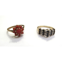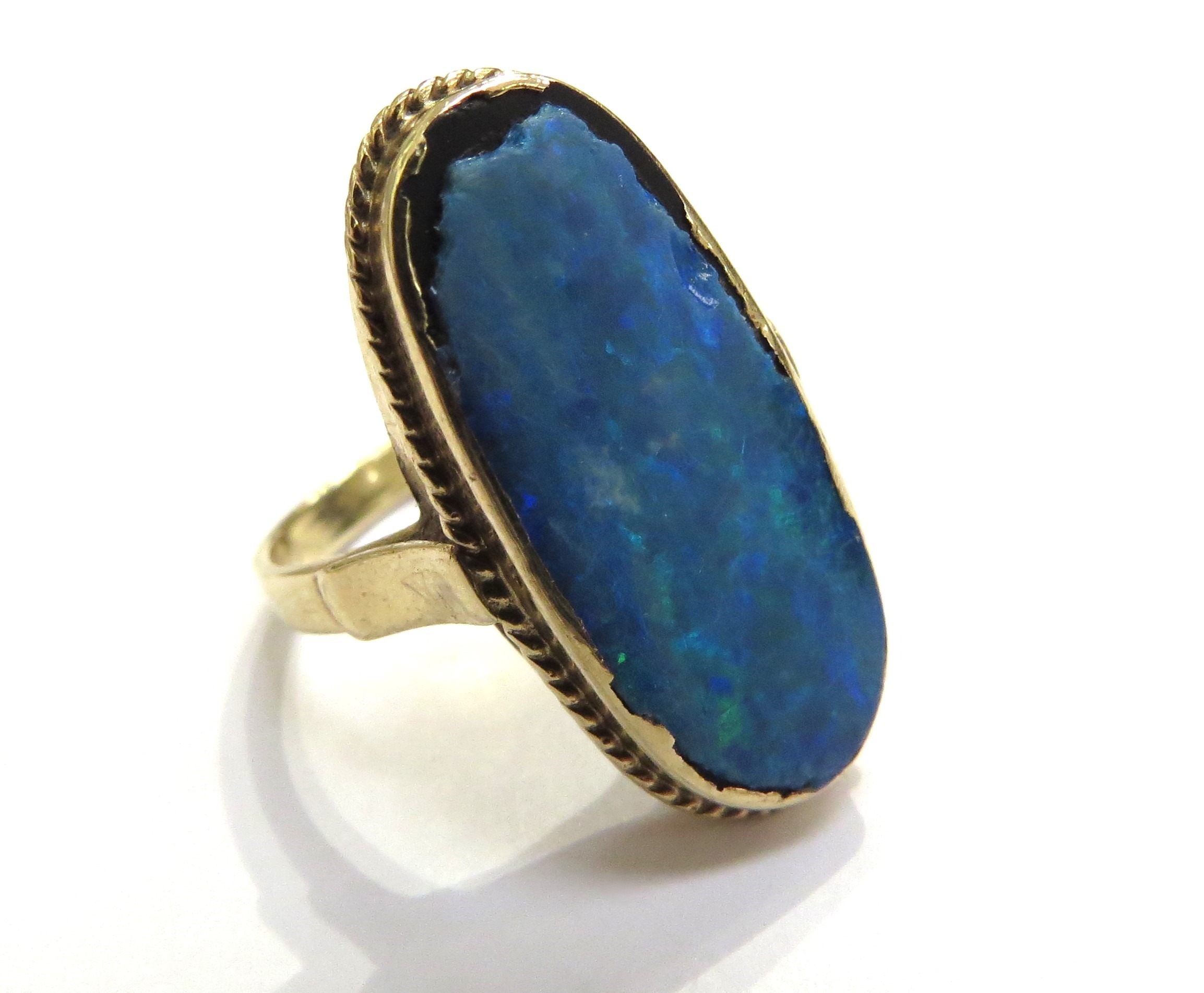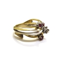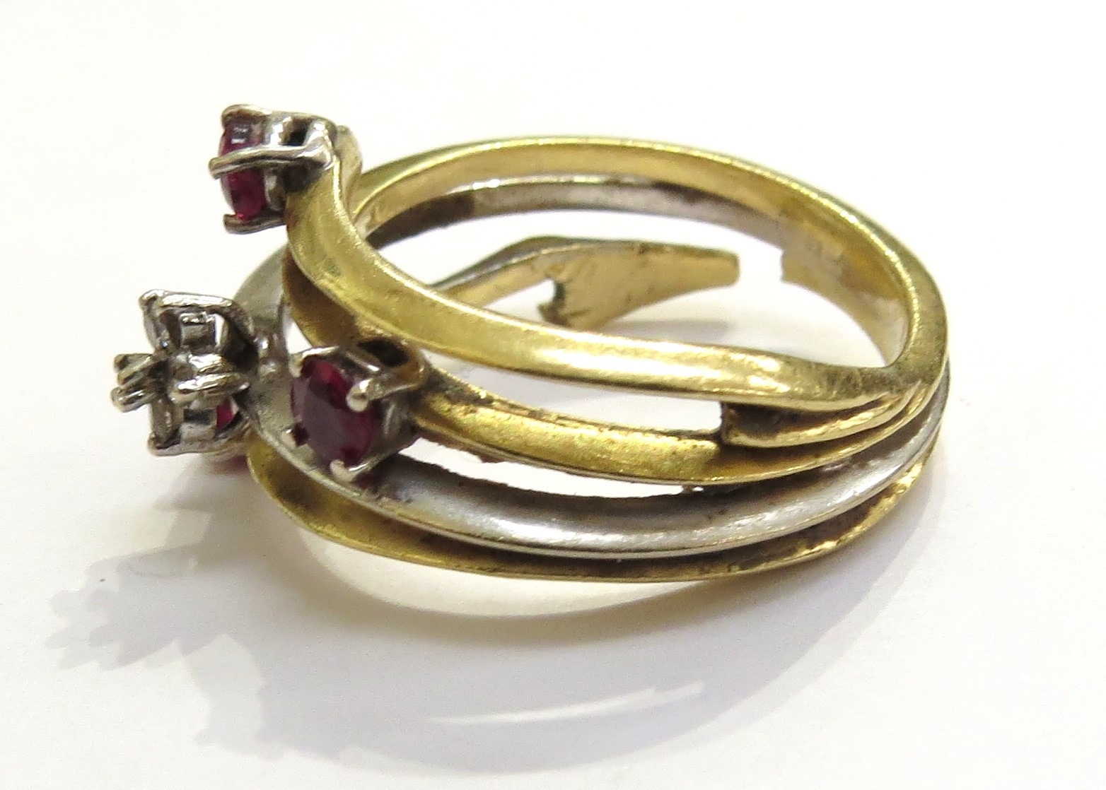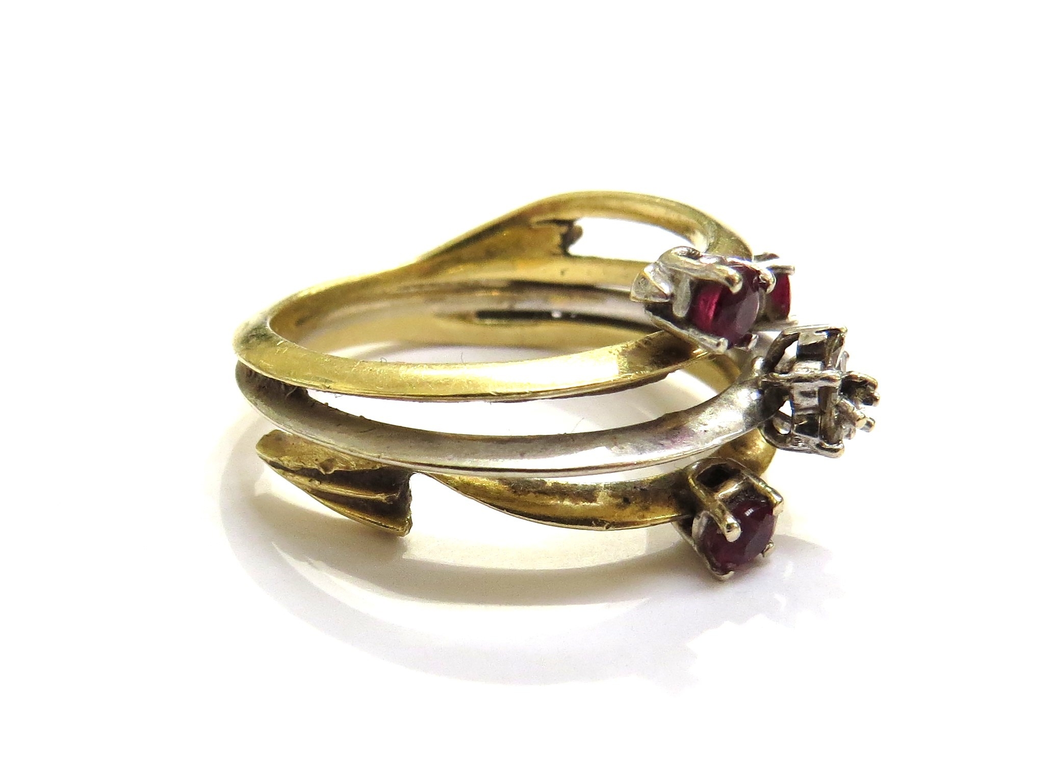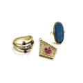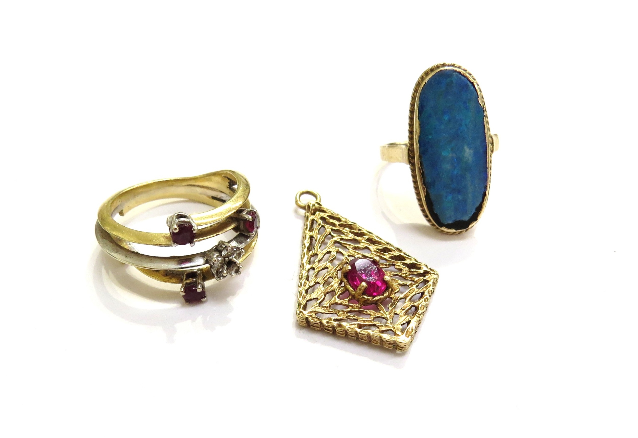 A gold two tone ring a/f, a gold ring with an thin opal slice a/f and an unmarked pendant (3), 15.6g total weight