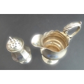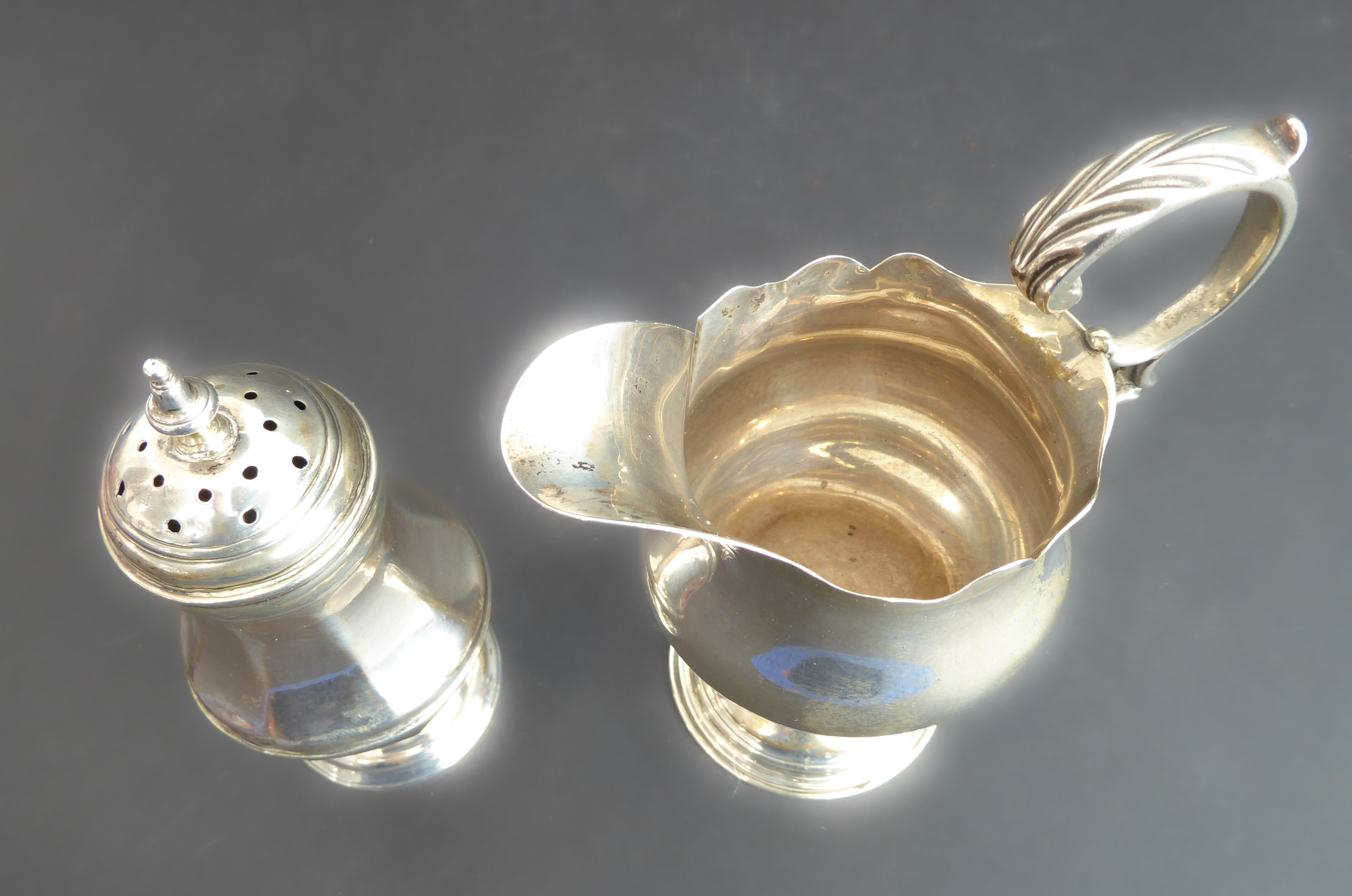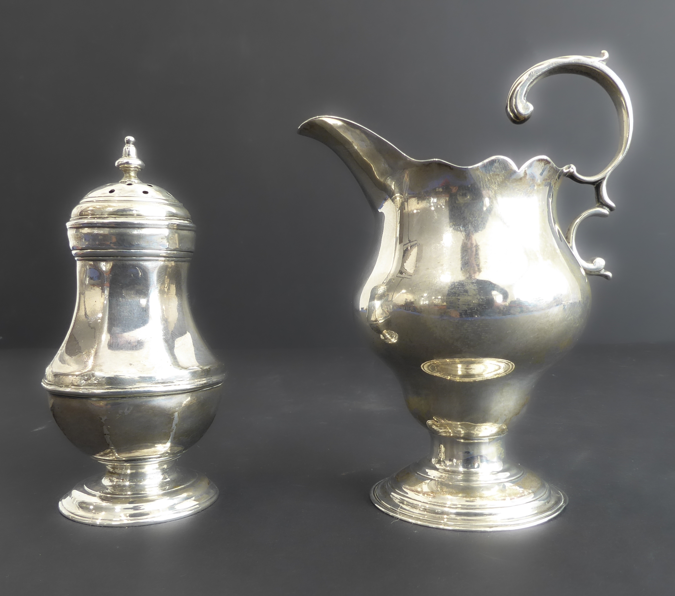 An 18th century hallmarked-silver caster of faceted baluster form, on slightly spreading circular foot, London hallmarks to underside and engraved M.T.. Together with an 18th century hallmarked-silver cream jug (probably London 1768). (Total gross weight approx. 188 g) (2)
