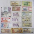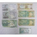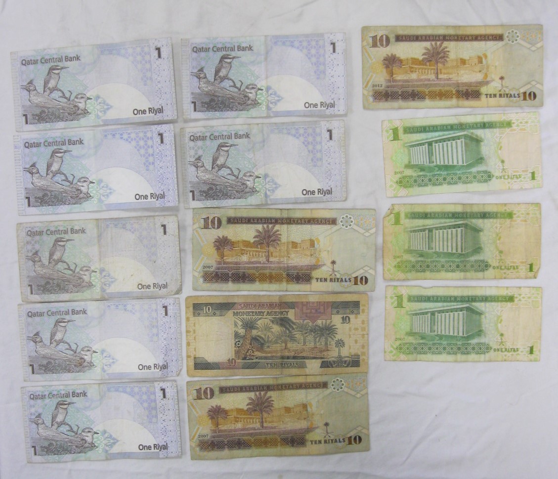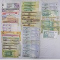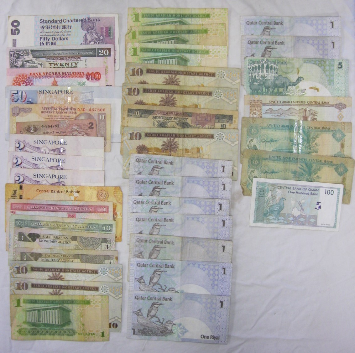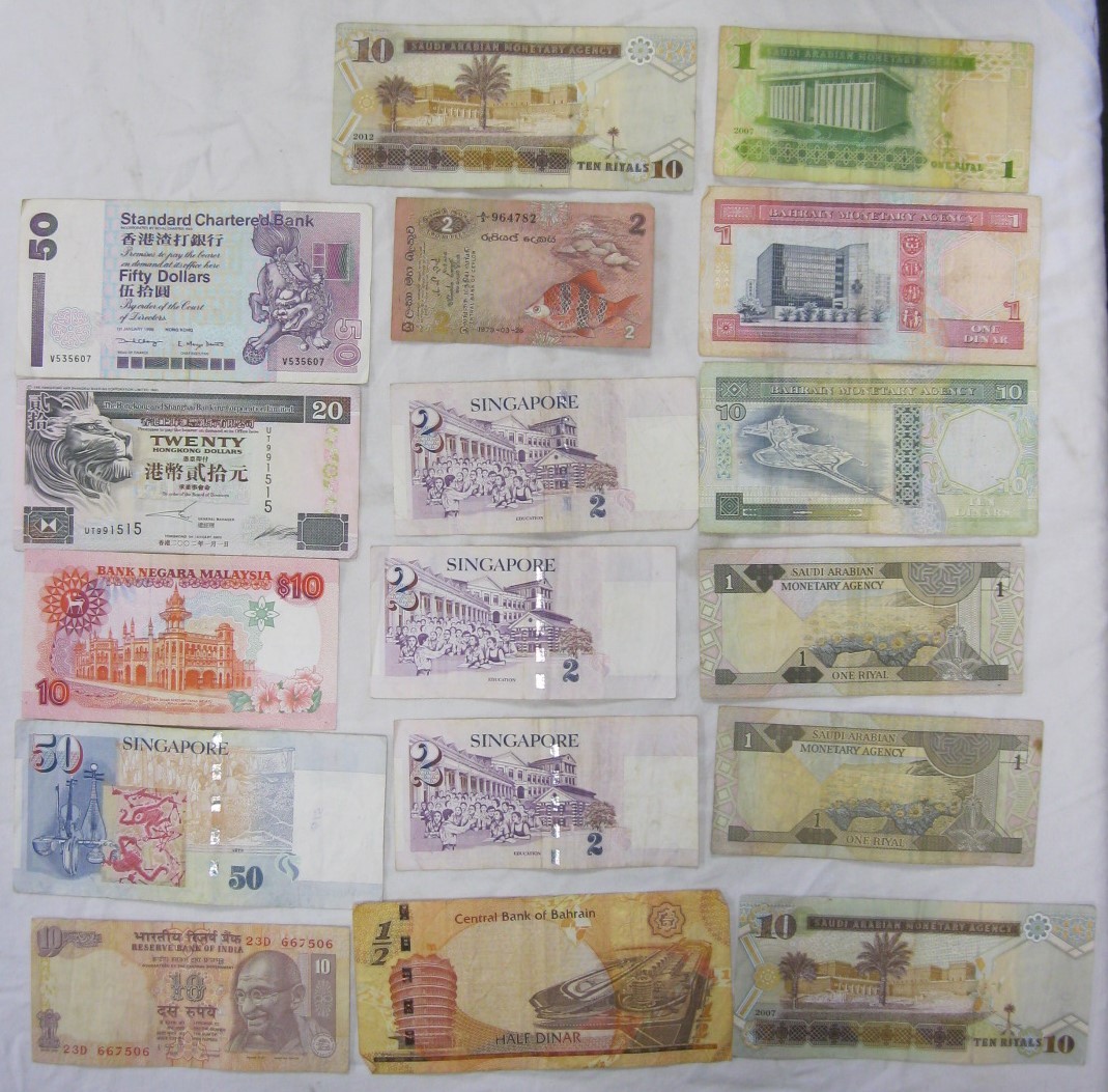 Approx 28 bank notes, middle east and far east, in circulated condition. Includes Qatar, Saudi Arabia, Bahrain, Singapore, Ceylon, and Hong Kong
