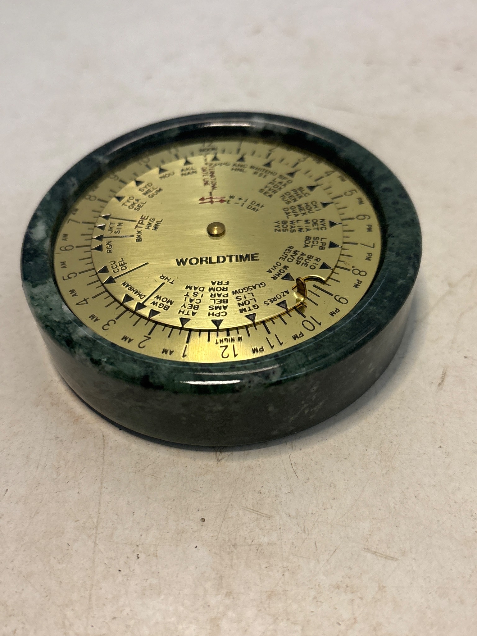 Brass and stone desk clock displaying world time. Functional.