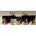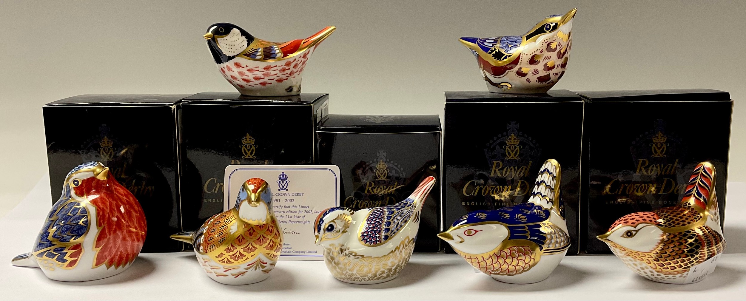 A Royal Crown Derby paperweight, Linnet, limited edition, 21st anniversary gold stopper, certificate, boxed; others, Wren, Robin, Goldcrest, Derby Wren, gold stoppers, each boxed; Nuthatch and Coal Tit, gold stoppers, no boxes (7)