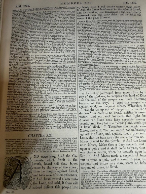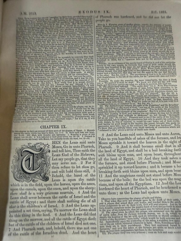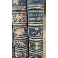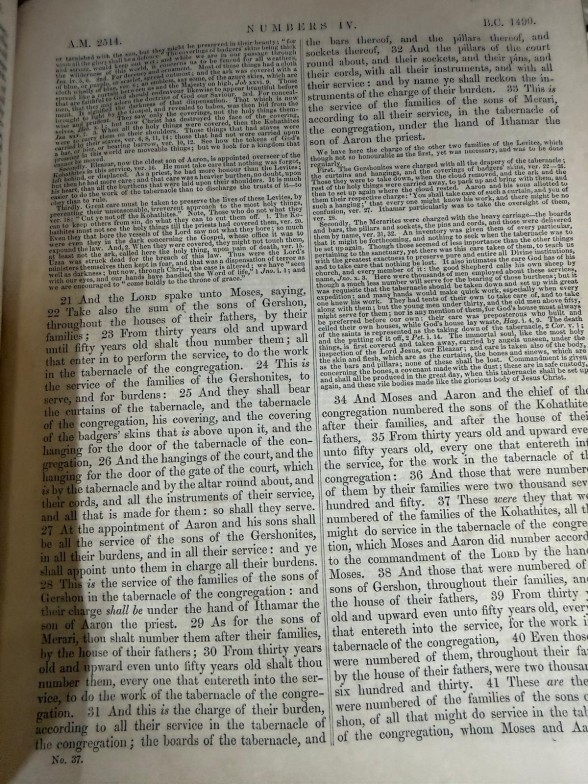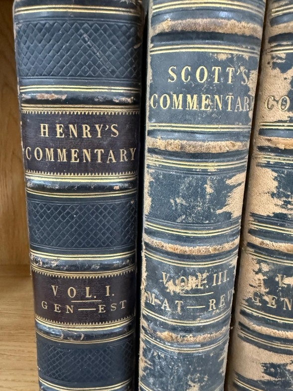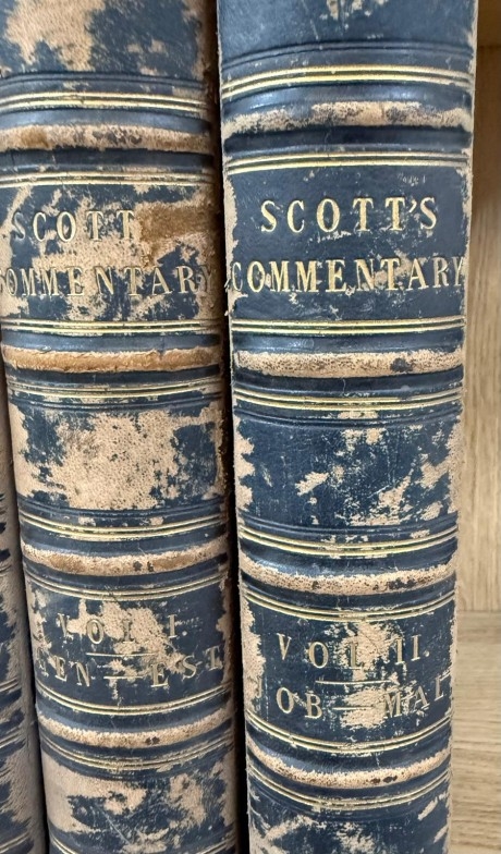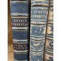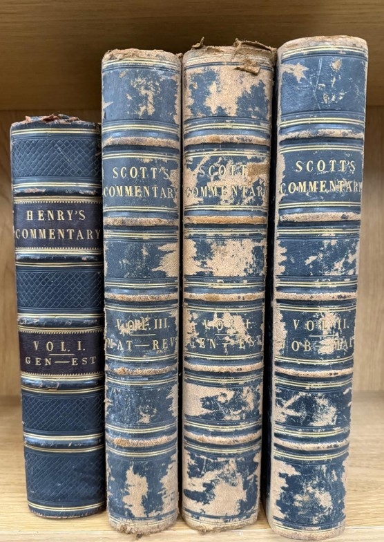 Three volumes of Scotts Commentary 1-3 and Henry's Commentary Volume 1 leather bound commentaries on various parts of the Bible and Scriptures.