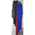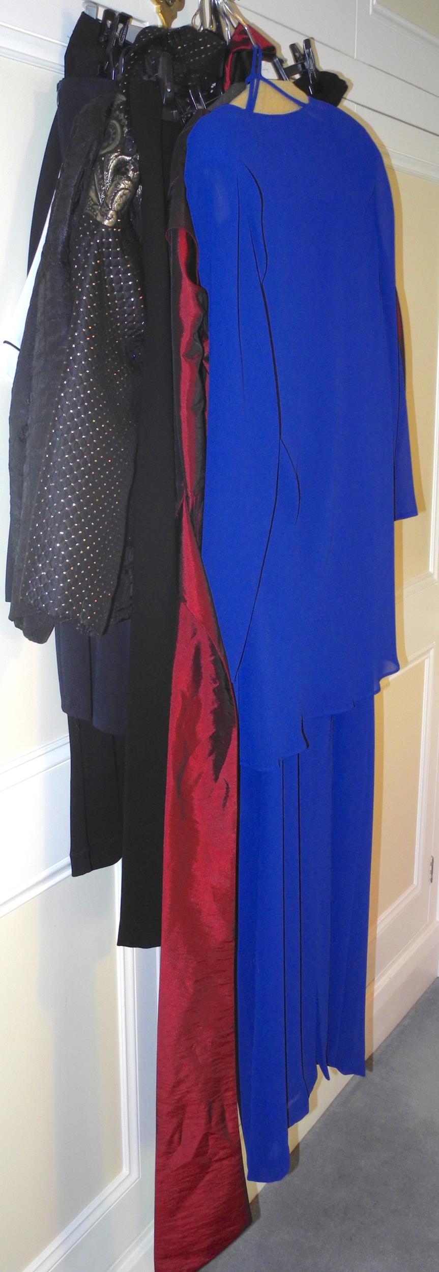 A Simon Ellis blue blue polyester and sequin evening dress, size 16; an Artigiano red evening jacket, size 18; a similar black skirt; Fink evening jacket, size 40; others Oska, Frank Usher, etc