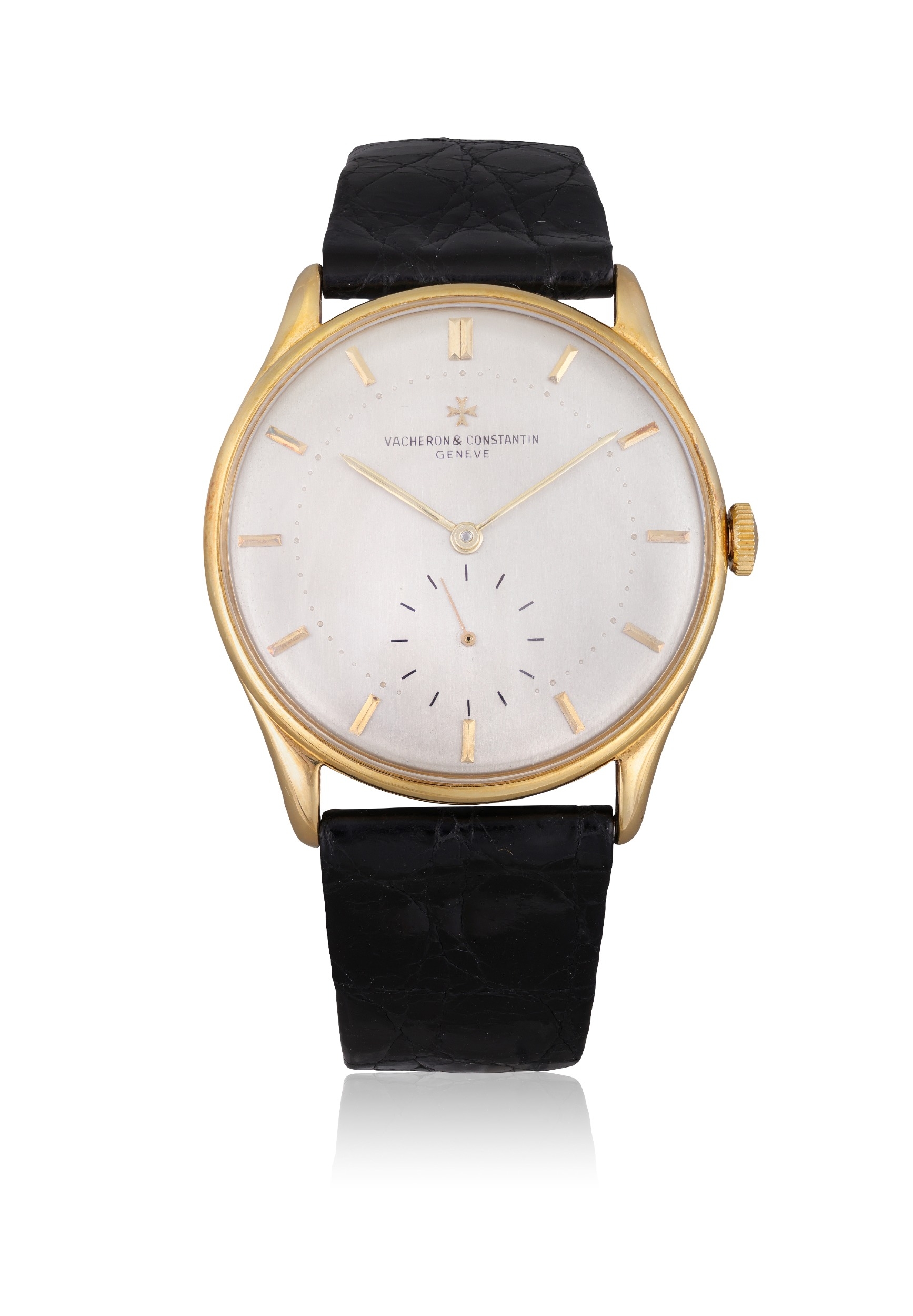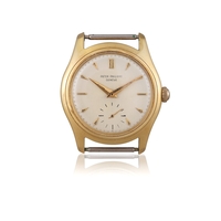 VACHERON CONSTANTIN DRESS WATCH, 18K YELLOW GOLD An rare and well preserved 18K yellow gold manual-wind wristwatch with small seconds. Year: Circa 1950s Dial: Silvered dial with applied gold baton indexes and subsidiary seconds Calibre: Manual-wind cal. Vacheron Constantin, No. 443526 Case: 18K yellow gold, numbered 282220 Dimensions: 35 mm Gross Weight: 41.55 g approx. Bracelet/Strap: Vacheron Constantin black leather strap with original Vacheron Constantin 18K pin buckle Signature: Dial and movement signed