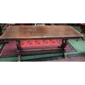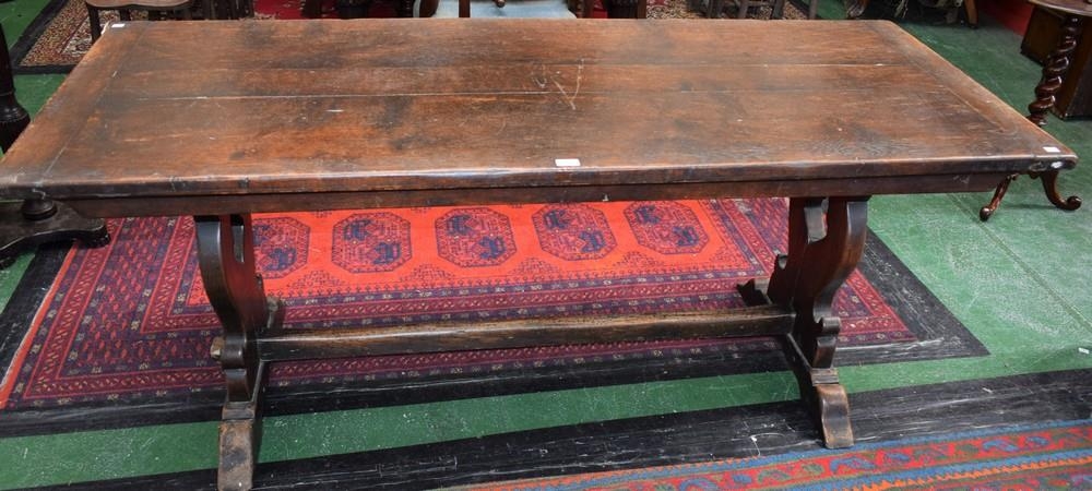 An 18th century oak refectory style, trestle type dining table, rectangular top, vasular end supports, rectangular stretcher, 183cm long