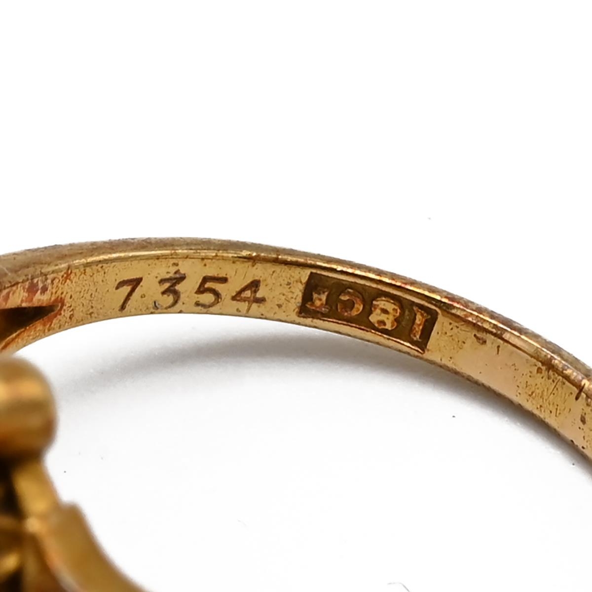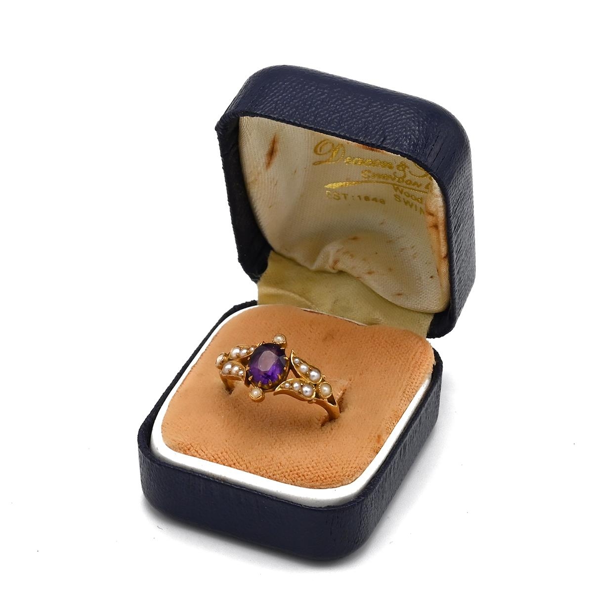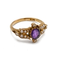 An 18ct yellow gold amethyst and seed pearl ring, ring size M, total gross weight approximately 3.9g. (J)