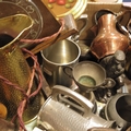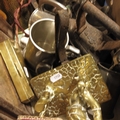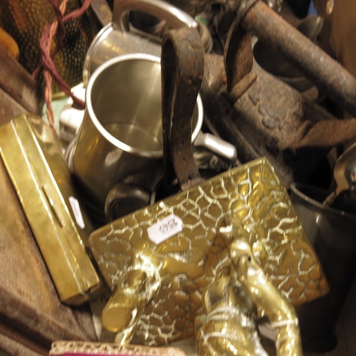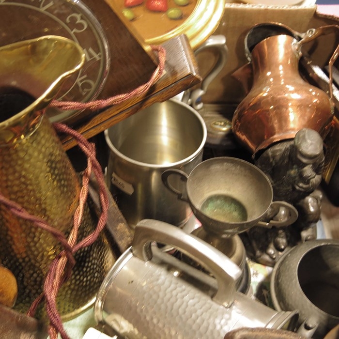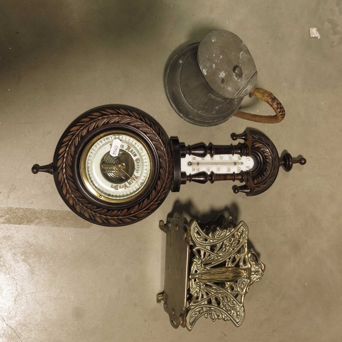 A three piece Civic pewter tea set, oak cased aneroid barometer, brass letter rack, lead cattle weights, and sundry items. (tray)
