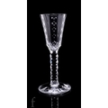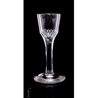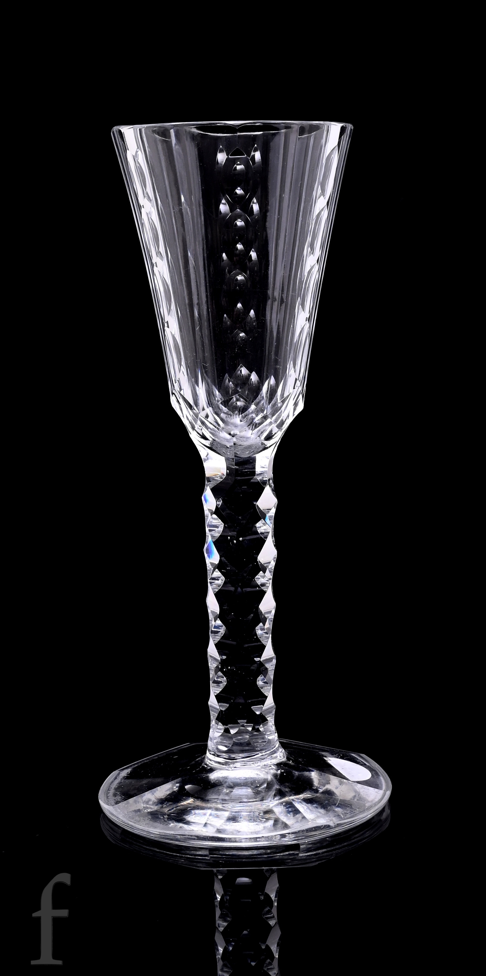 An 18th Century drinking glass circa 1770, the tall round funnel bowl slice cut with vertical bands of printie cuts, above a hollow diamond facet stem, raised to a facet cut conical foot, height 18cm.