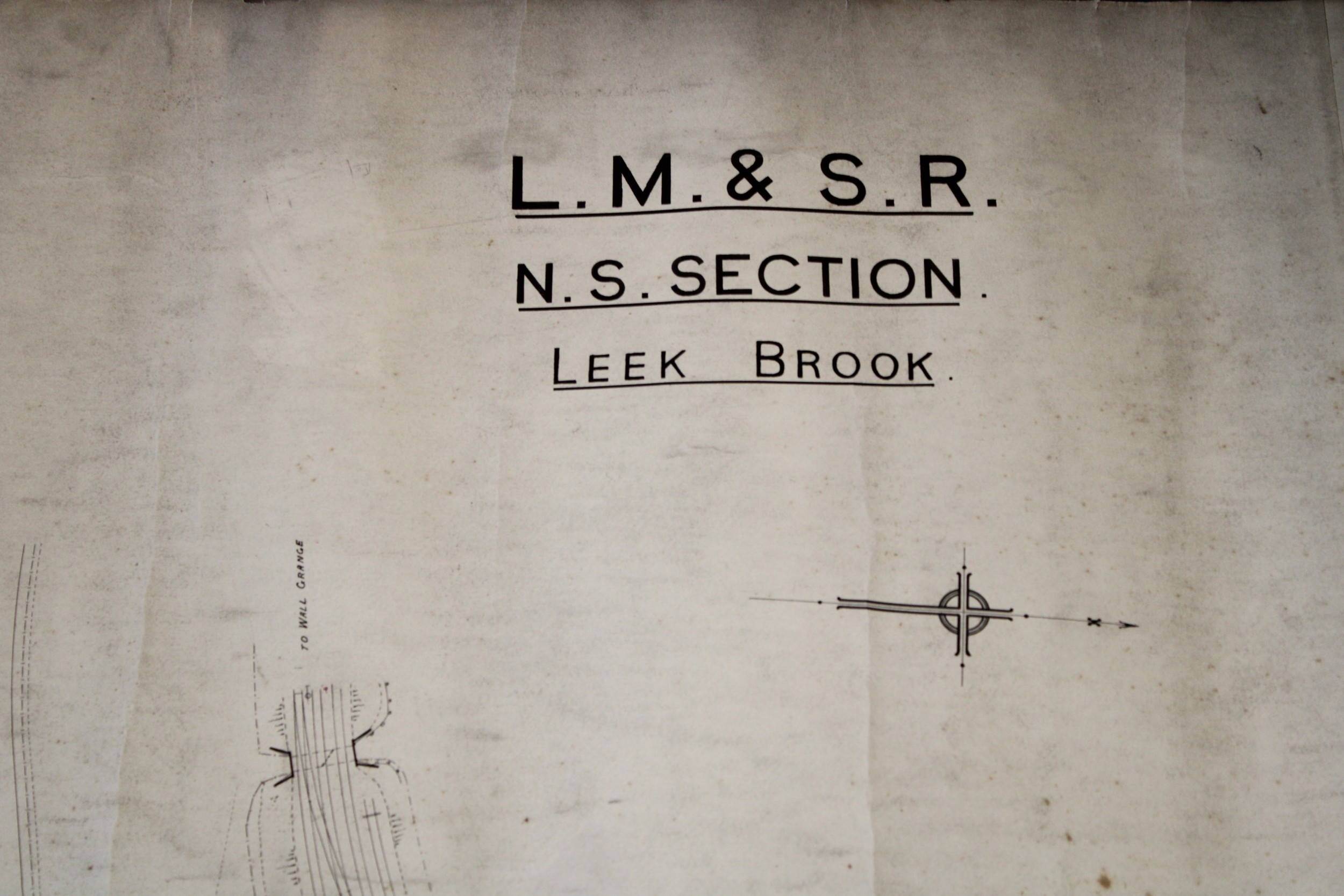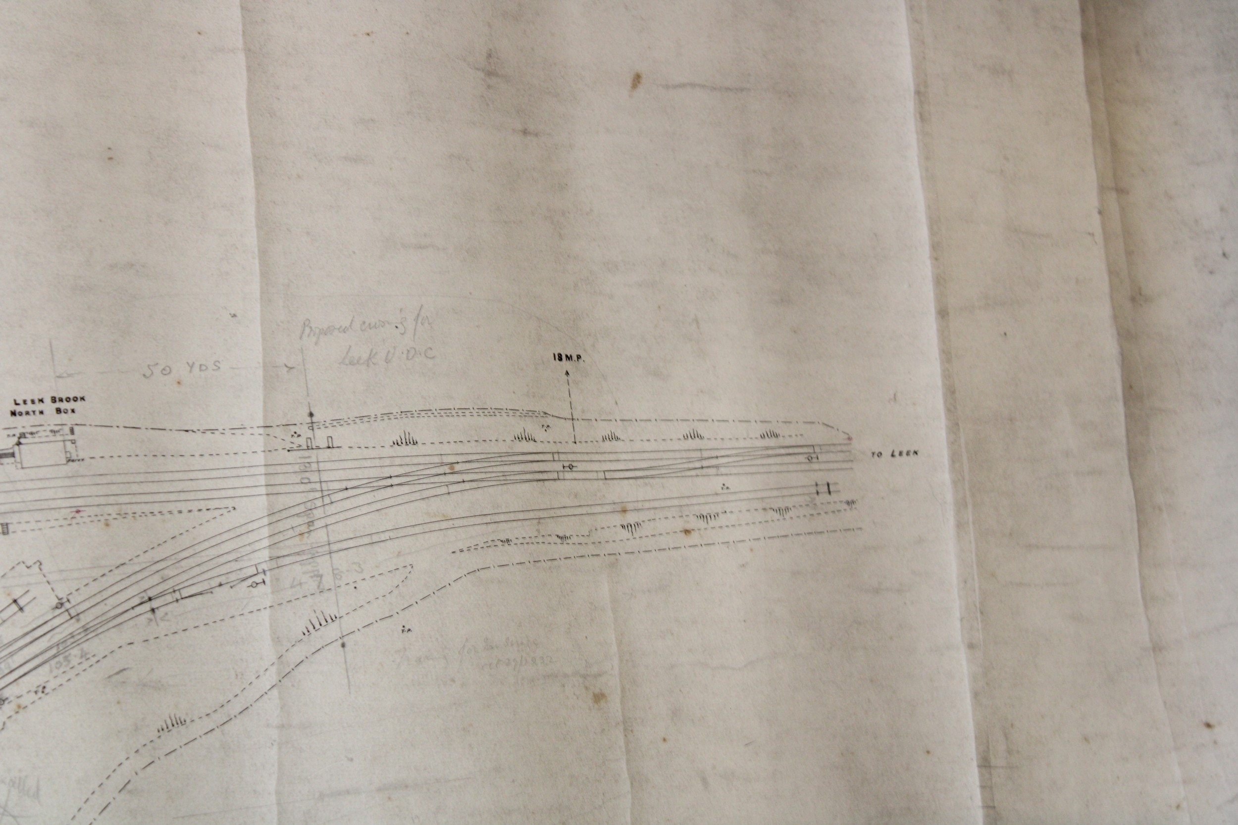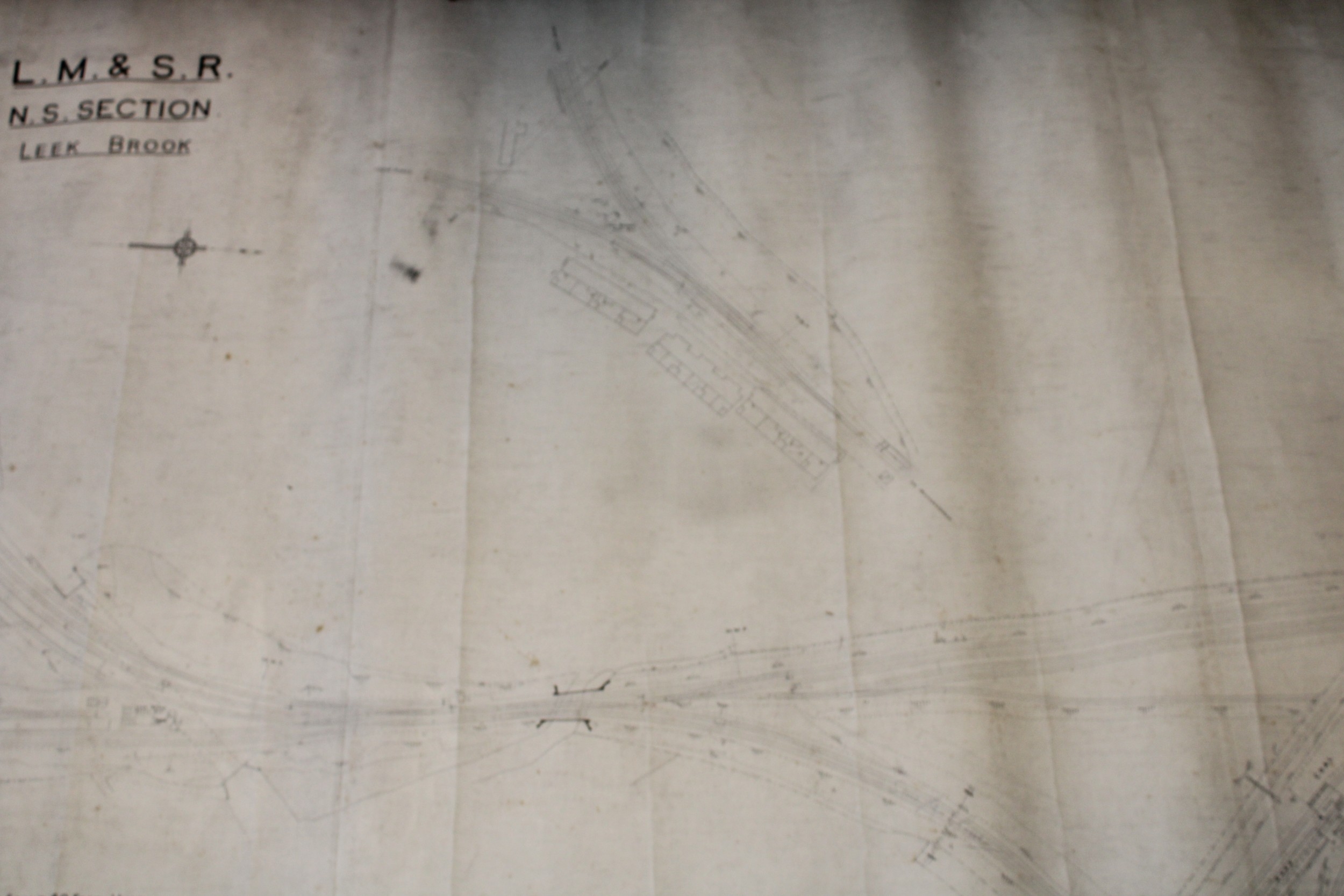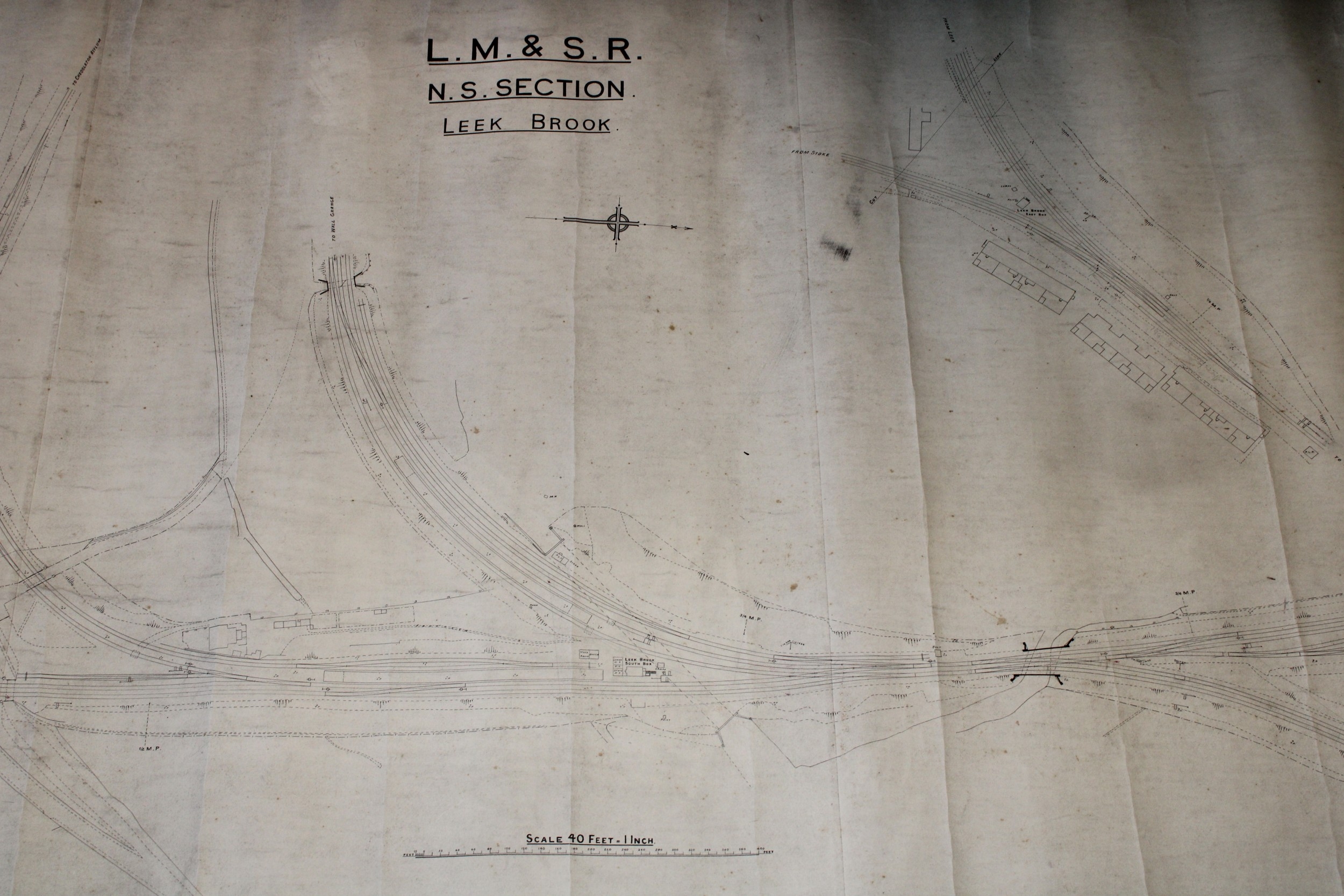 Antique railway map, London, Midland and Scottish Railway, 40ft survey, North Stafforshire section, Leekbrook, Cheddleton branch, Wall Grange, including Cheddleton Asylum, hand drawn map on cloth, 263cm x 99cm.