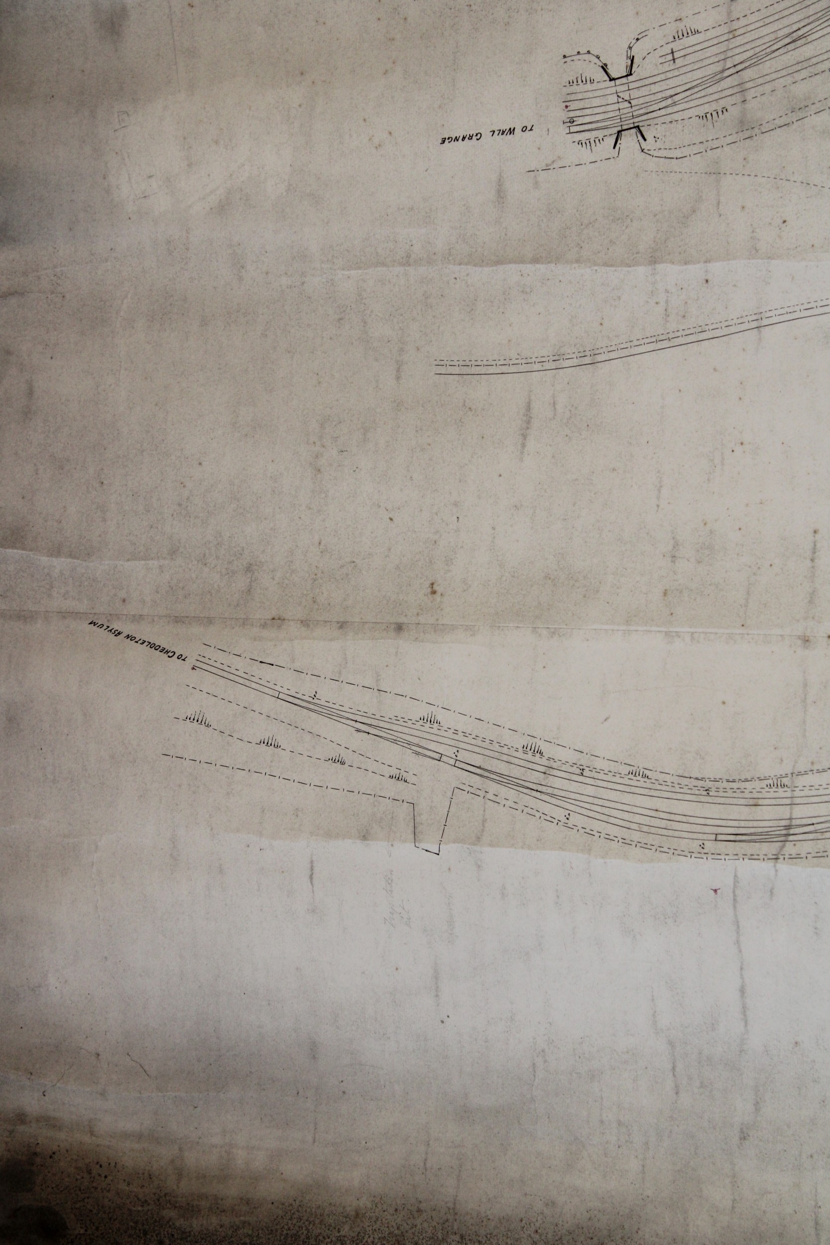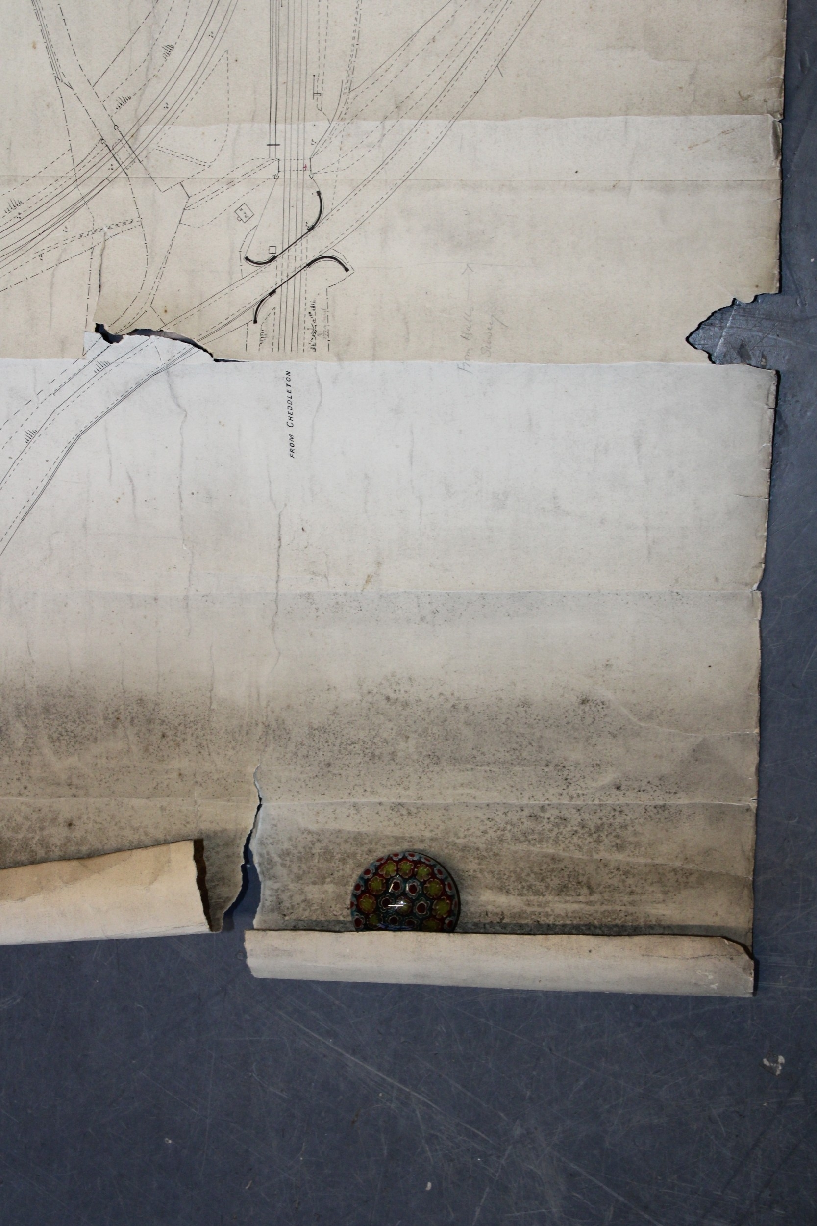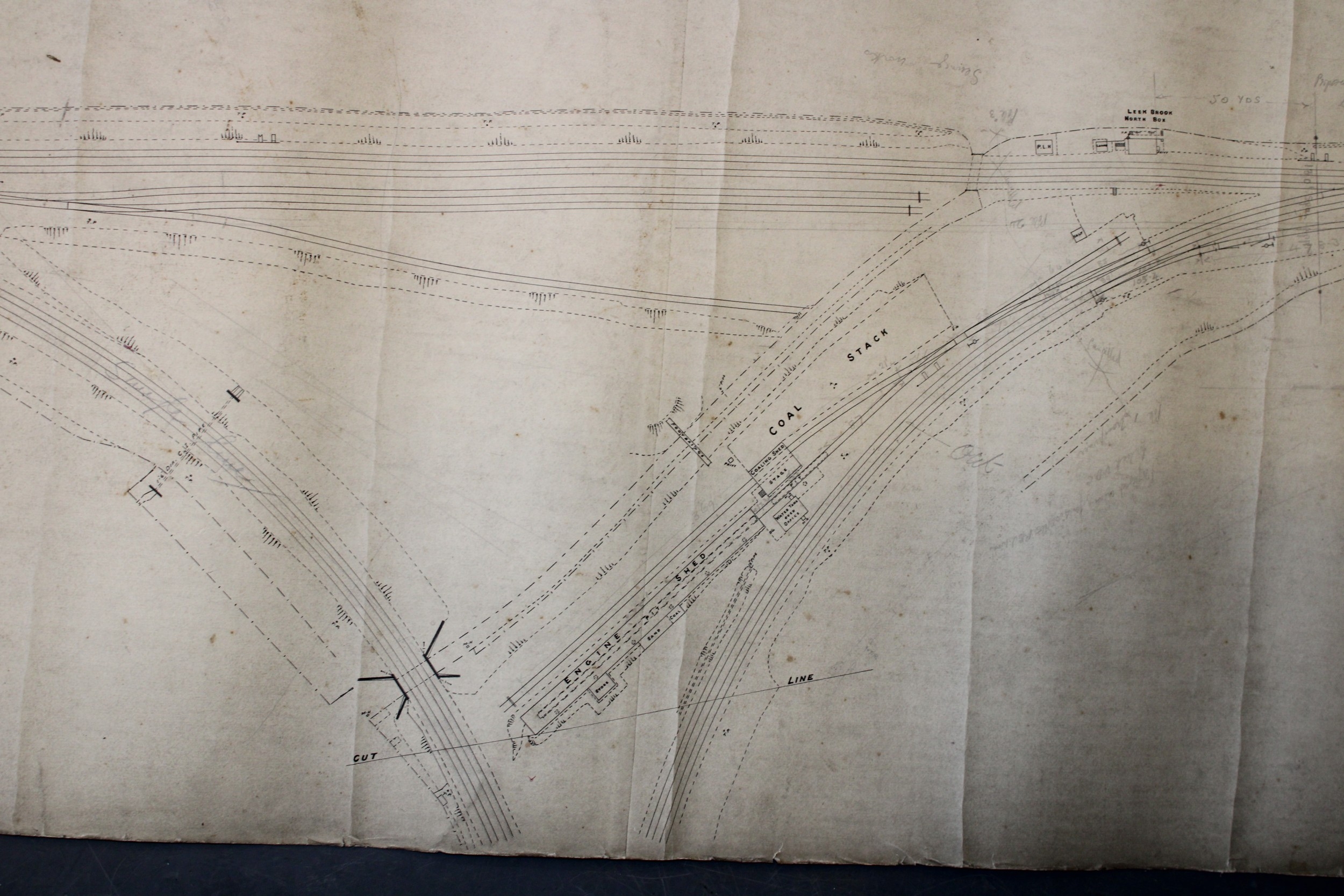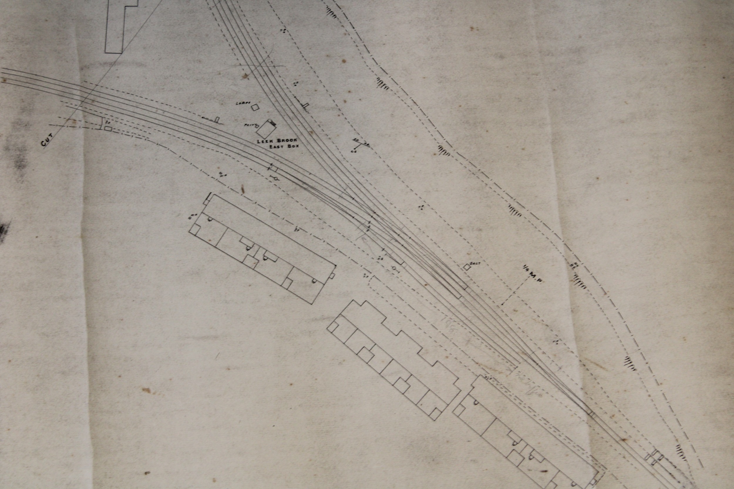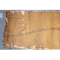 Antique railway map, London, Midland and Scottish Railway, 40ft survey, North Stafforshire section, Leekbrook, Cheddleton branch, Wall Grange, including Cheddleton Asylum, hand drawn map on cloth, 263cm x 99cm.
