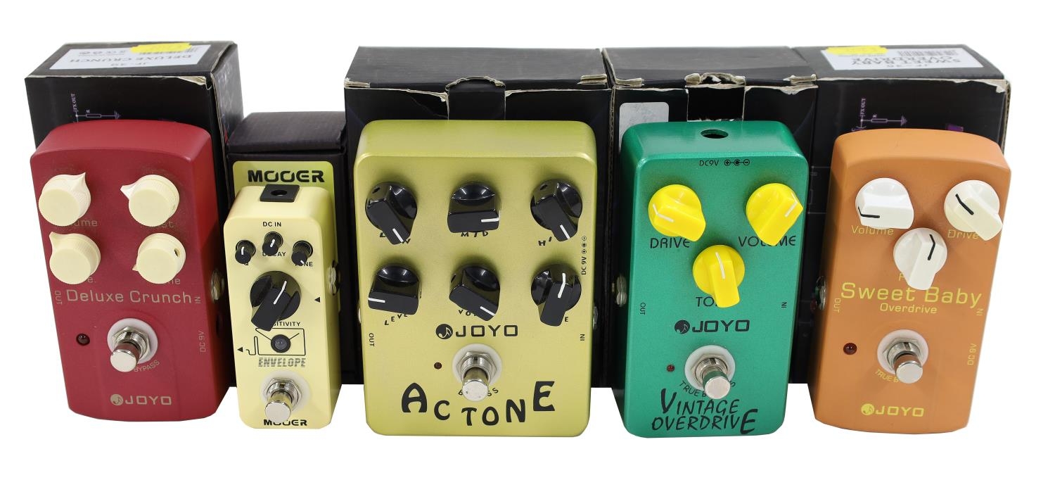 Four Joyo guitar pedals to include an Actone, JF-01 Vintage Overdrive, JF-36 Sweet Baby Overdrive, JF-39 Deluxe Crunch, all boxed; together with a Mooer Micro Series Envelope analogue auto-wah pedal, boxed (5)