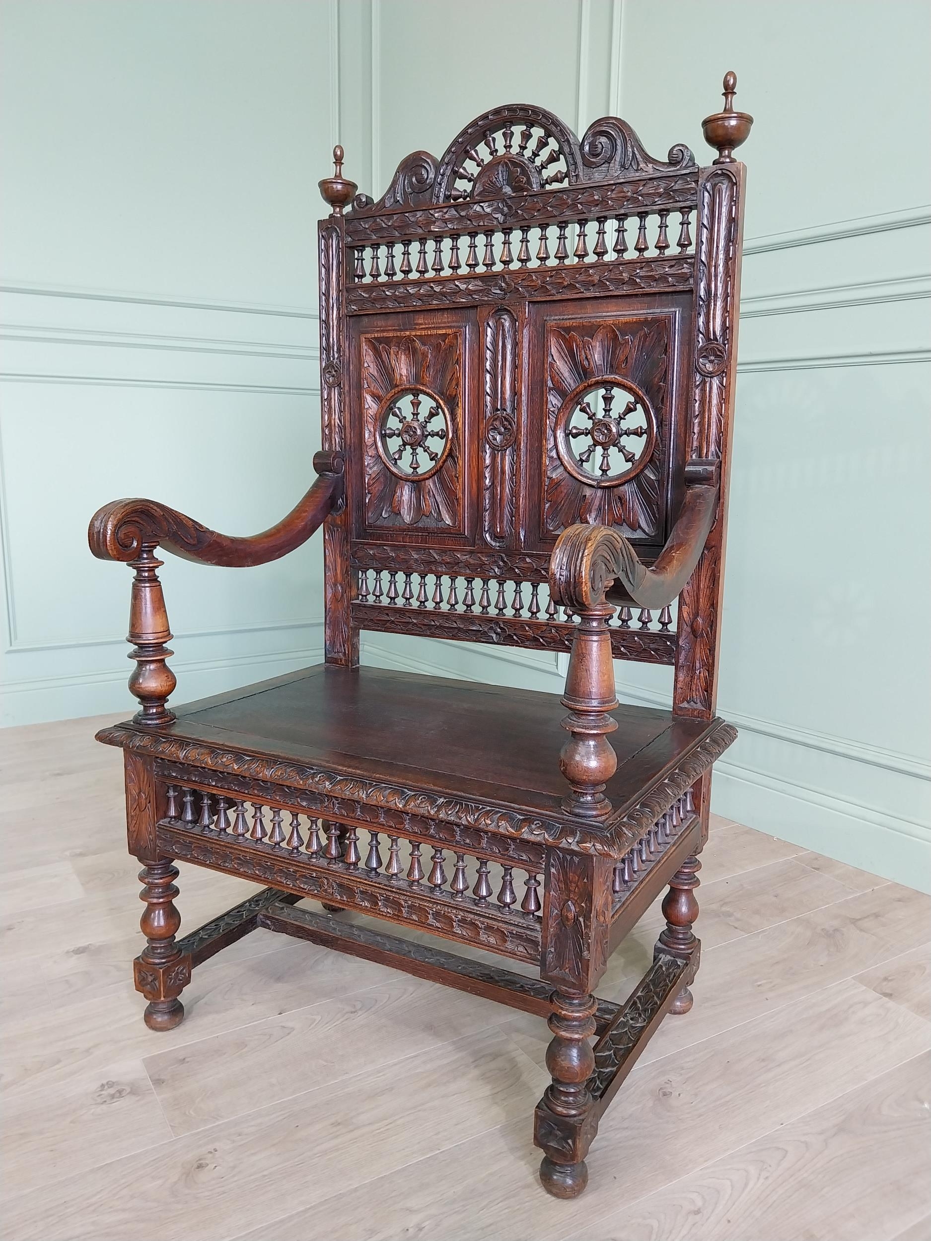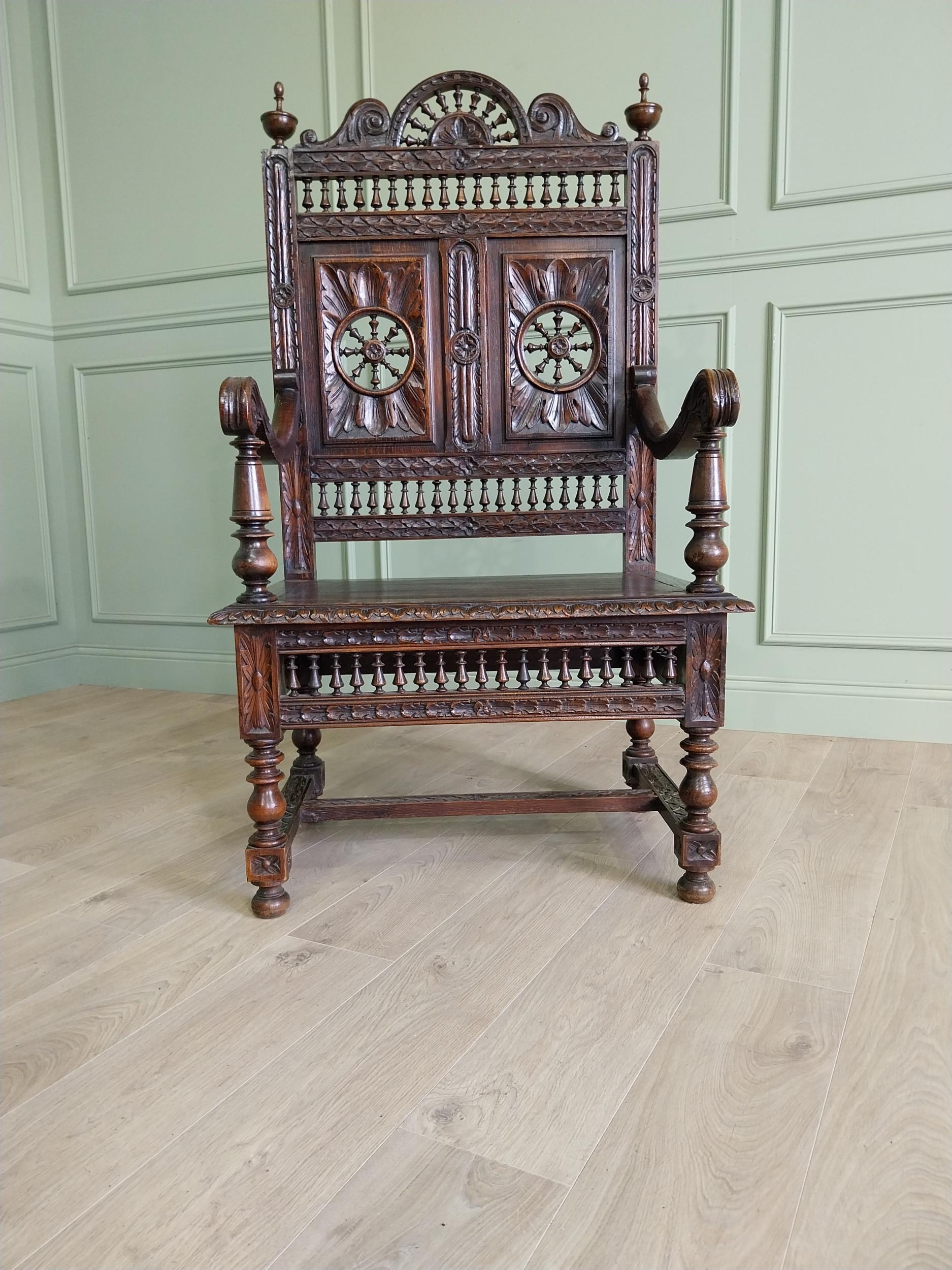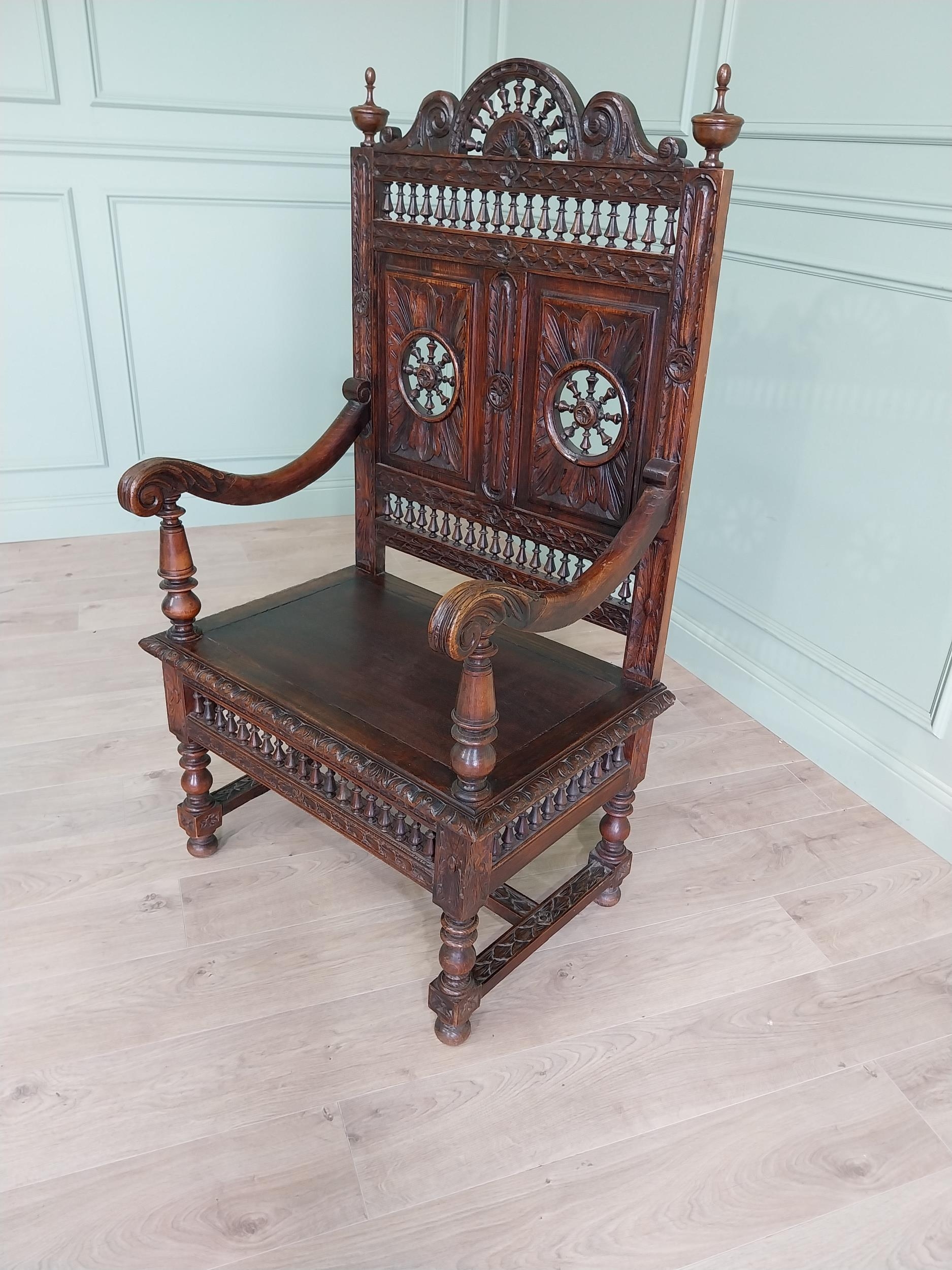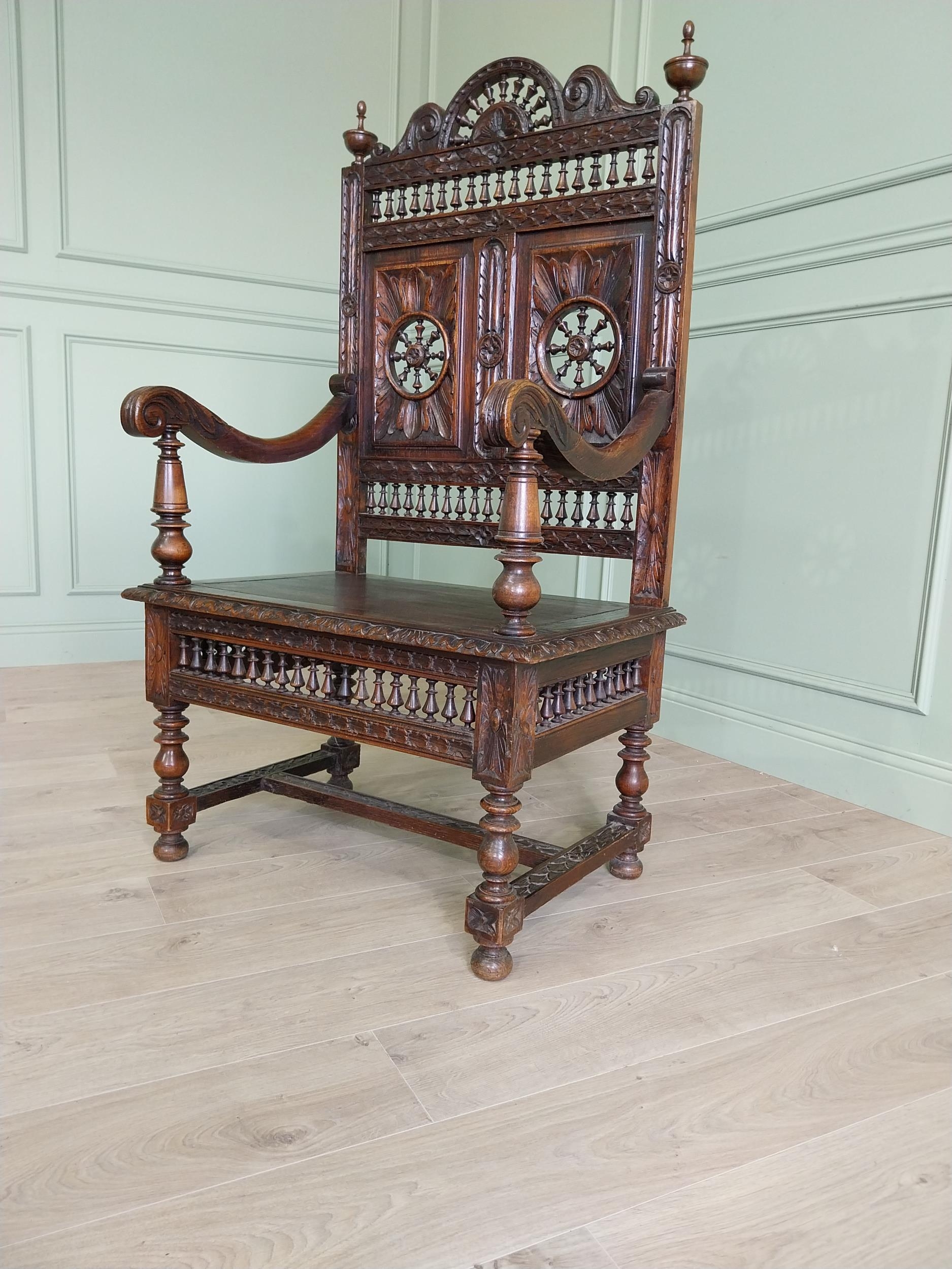 19th C. carved oak throne chair in the Tudor style {140 cm H x 80 cm W x 52 cm D}.