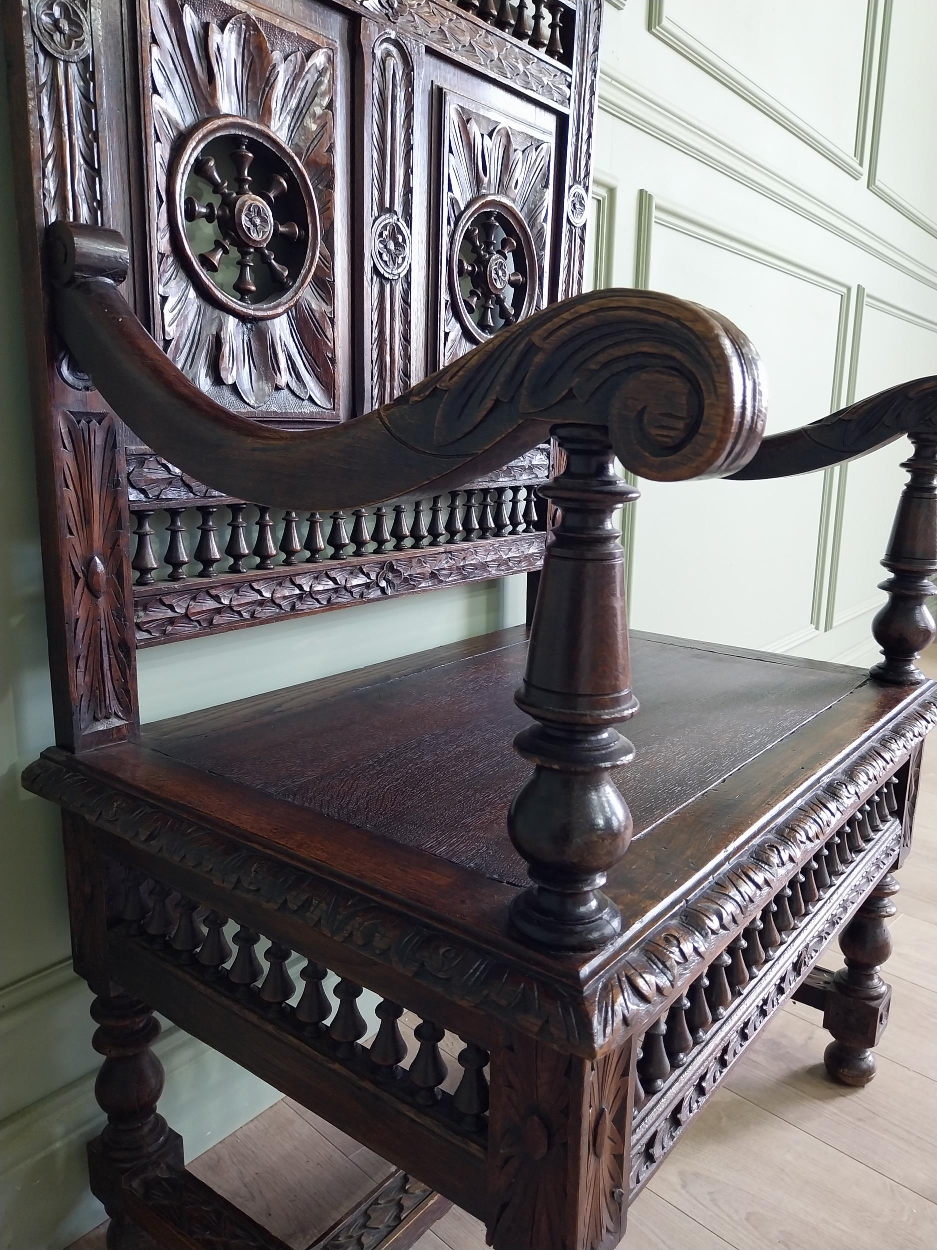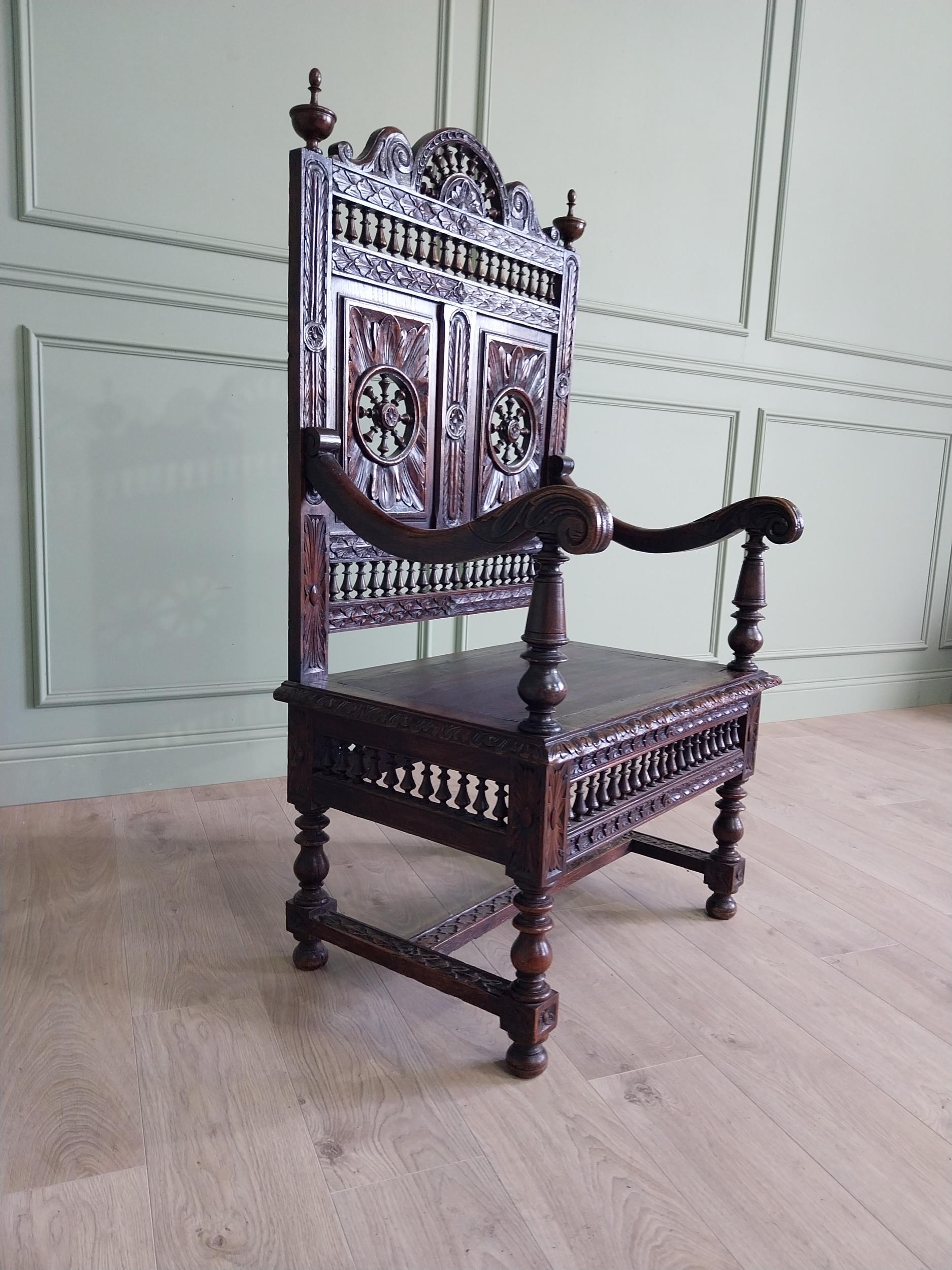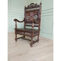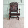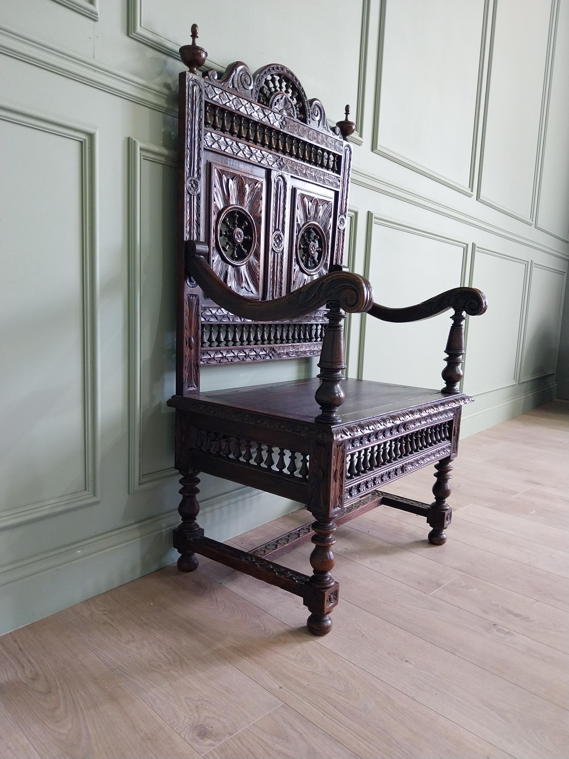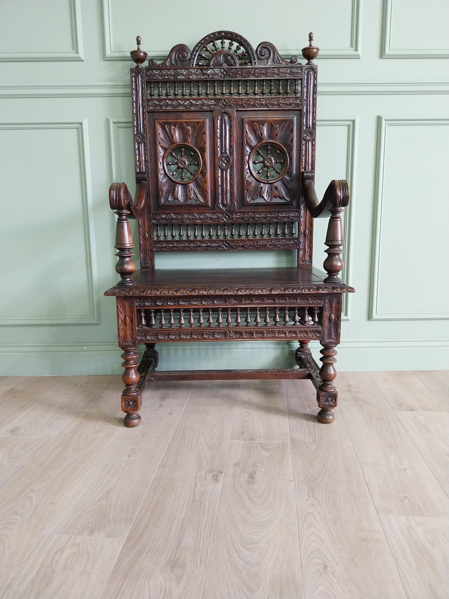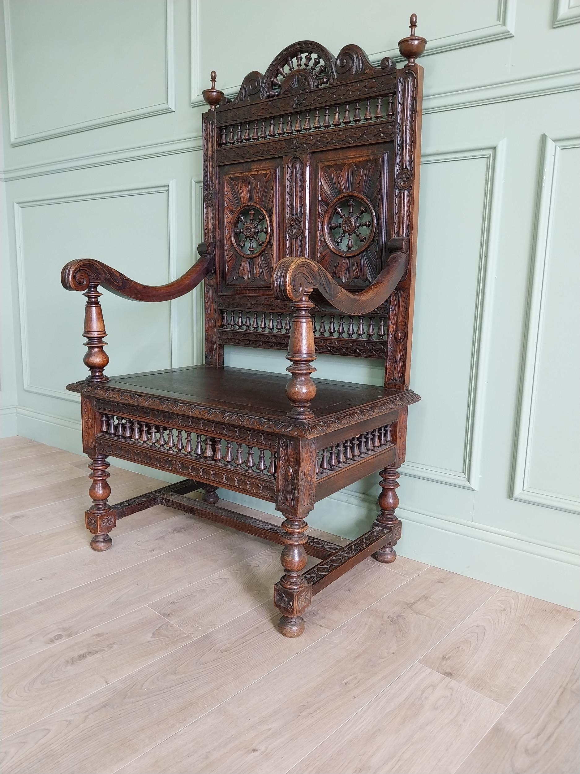 19th C. carved oak throne chair in the Tudor style {140 cm H x 80 cm W x 52 cm D}.
