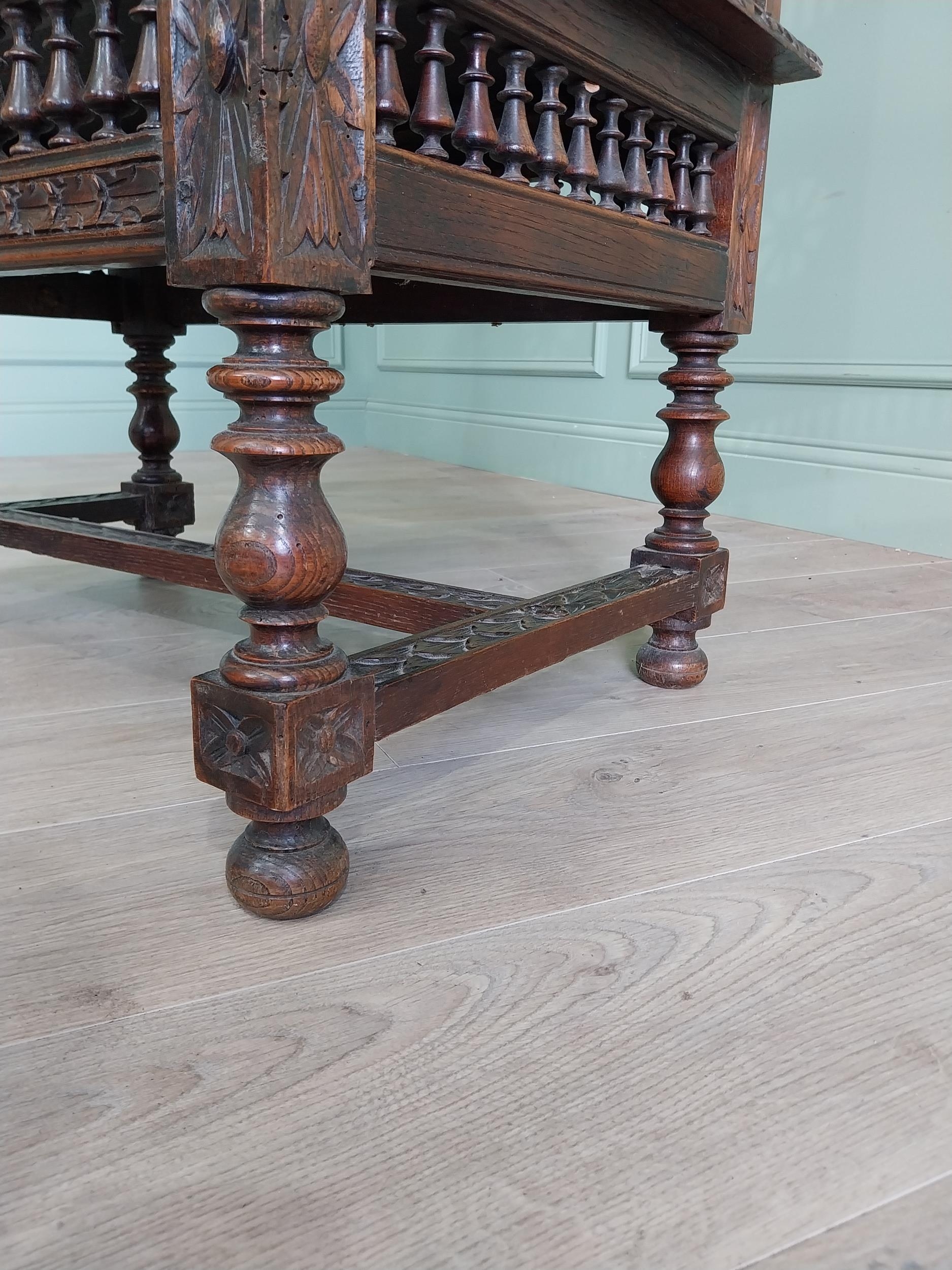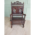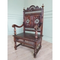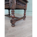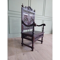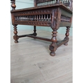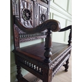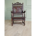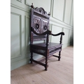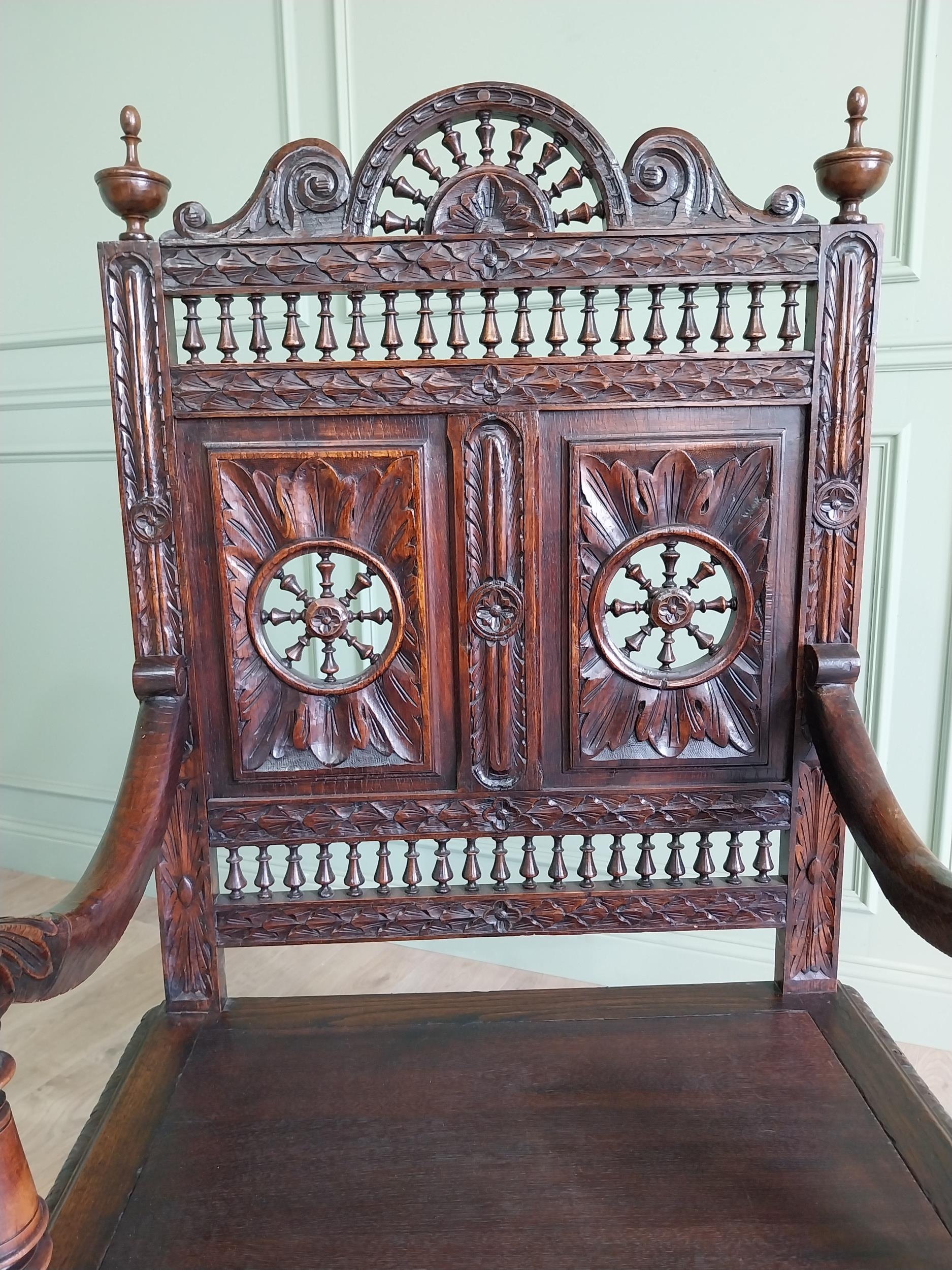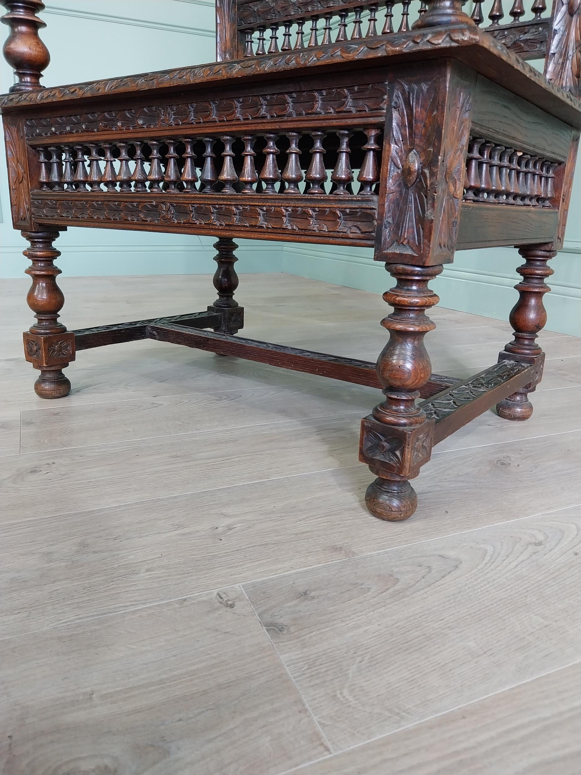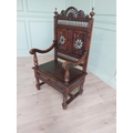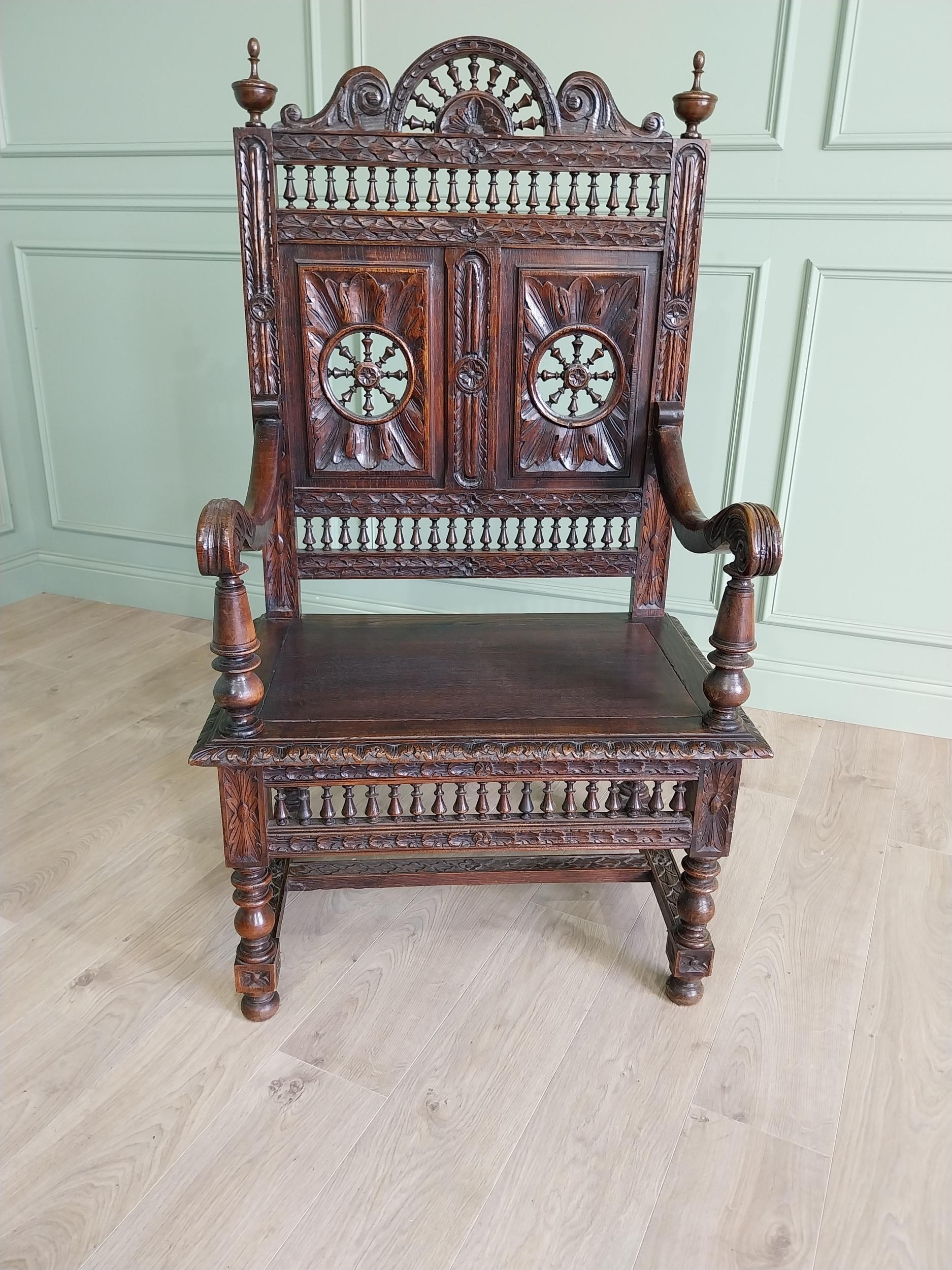 19th C. carved oak throne chair in the Tudor style {140 cm H x 80 cm W x 52 cm D}.