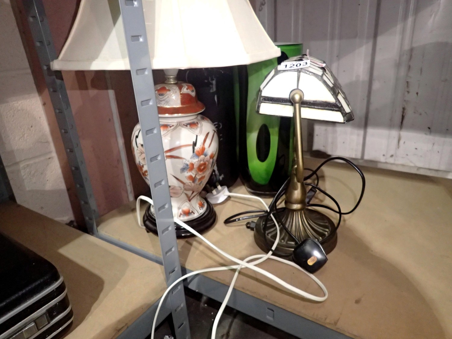 Two large vases and two lamps including a Tiffany style bankers lamp. Not available for in-house P&P