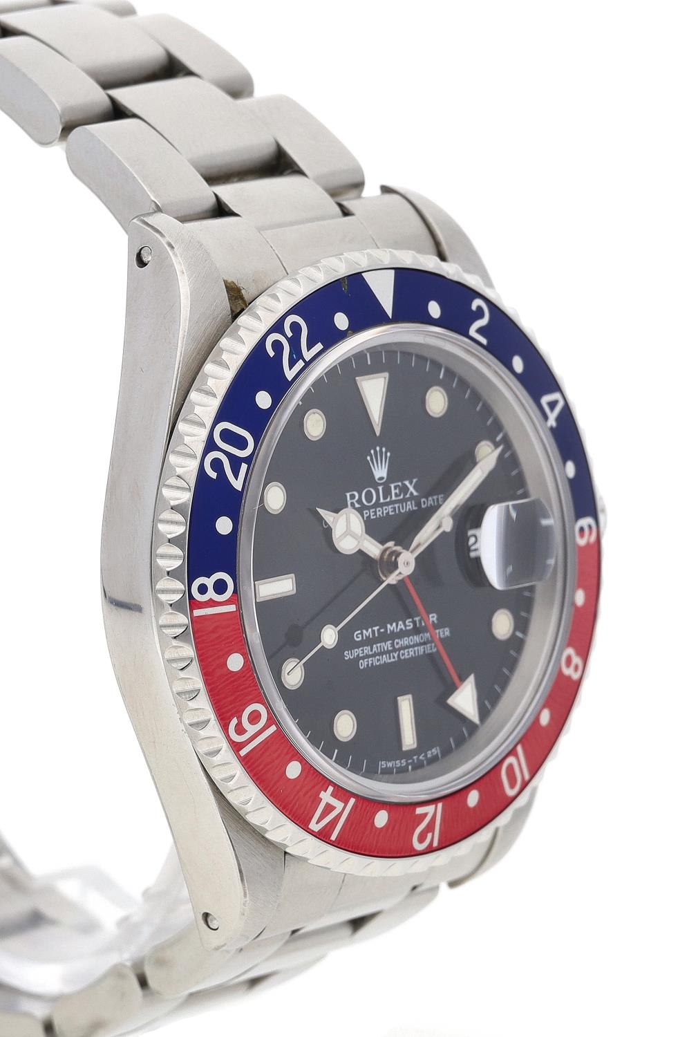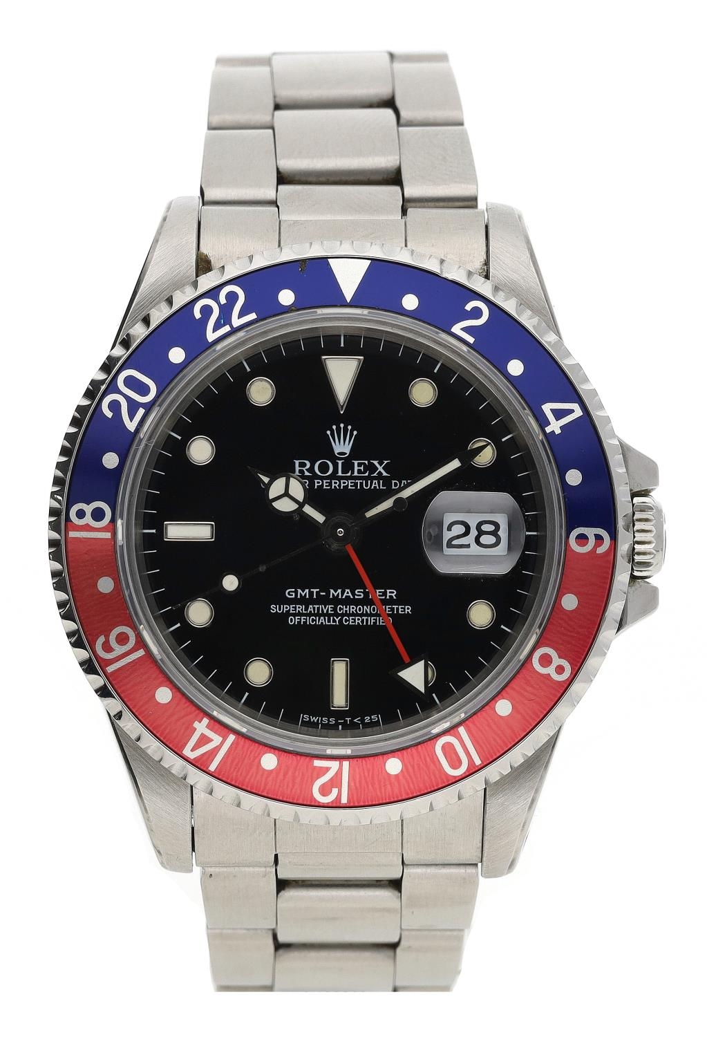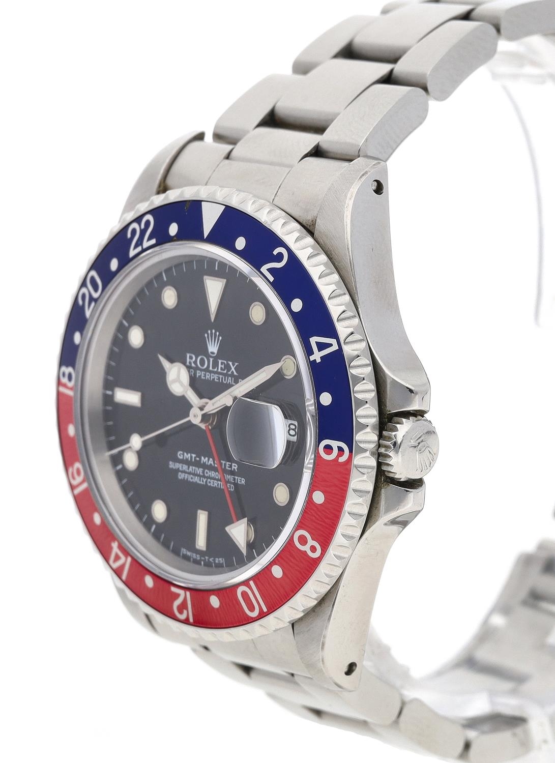 Rolex Oyster Perpetual Date GMT-Master stainless steel gentleman's wristwatch, reference no. 16700, serial no. S560xxx, circa 1993, black dial, bi-directional rotating bezel with PEPSI insert, Oyster bracelet, reference 78360, with 501B end links, 40mm bezel (ref: 448)