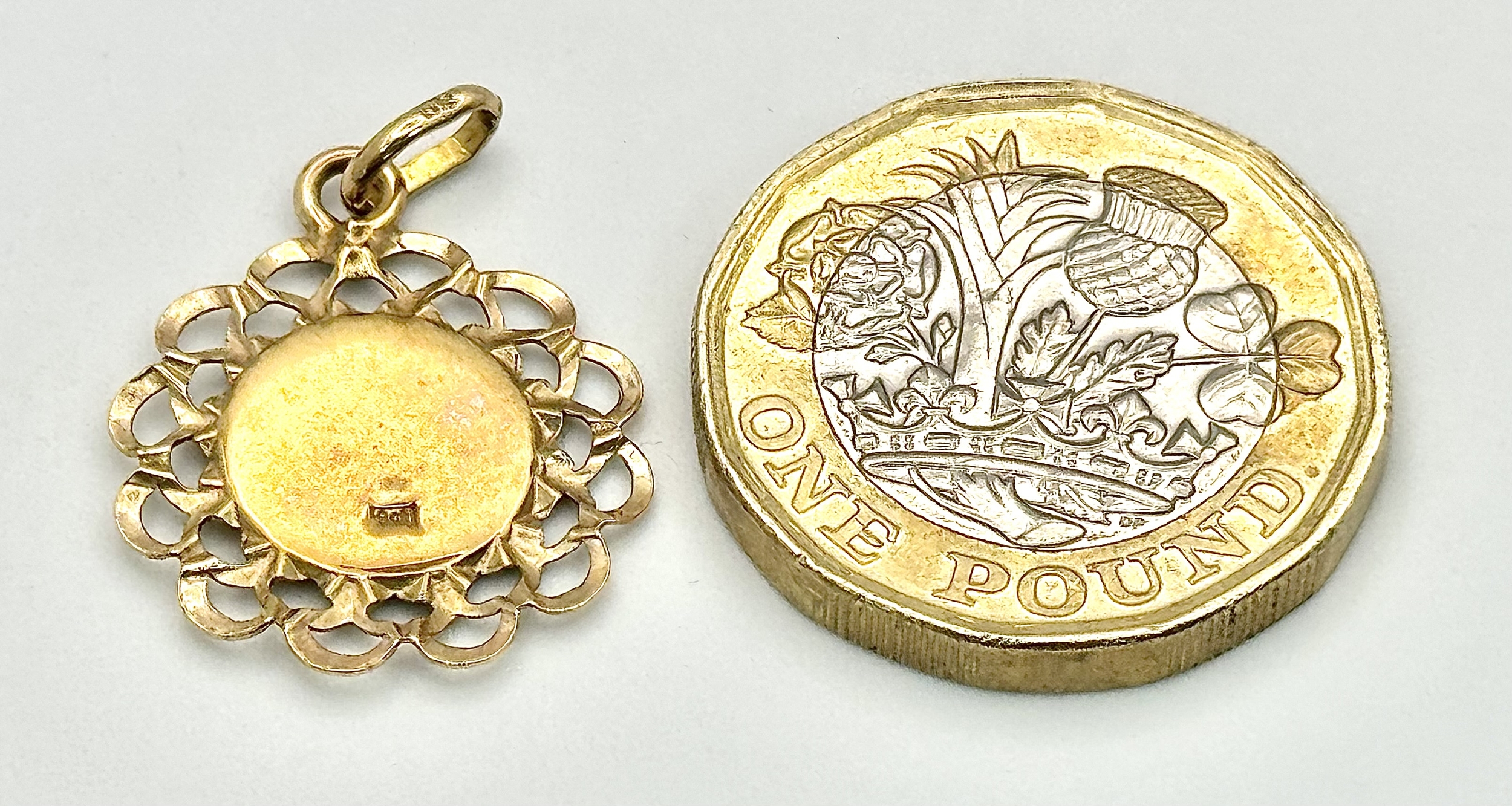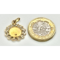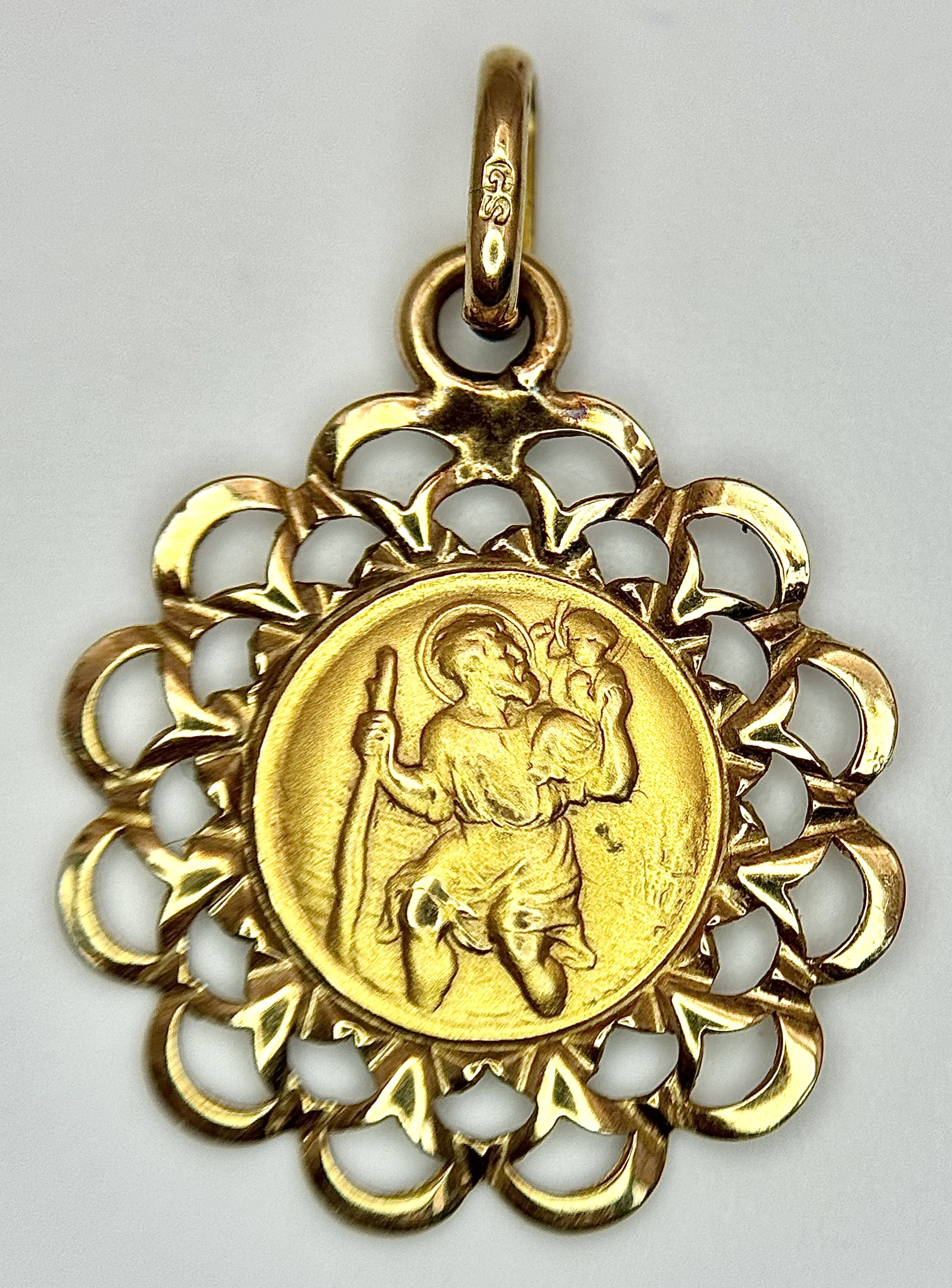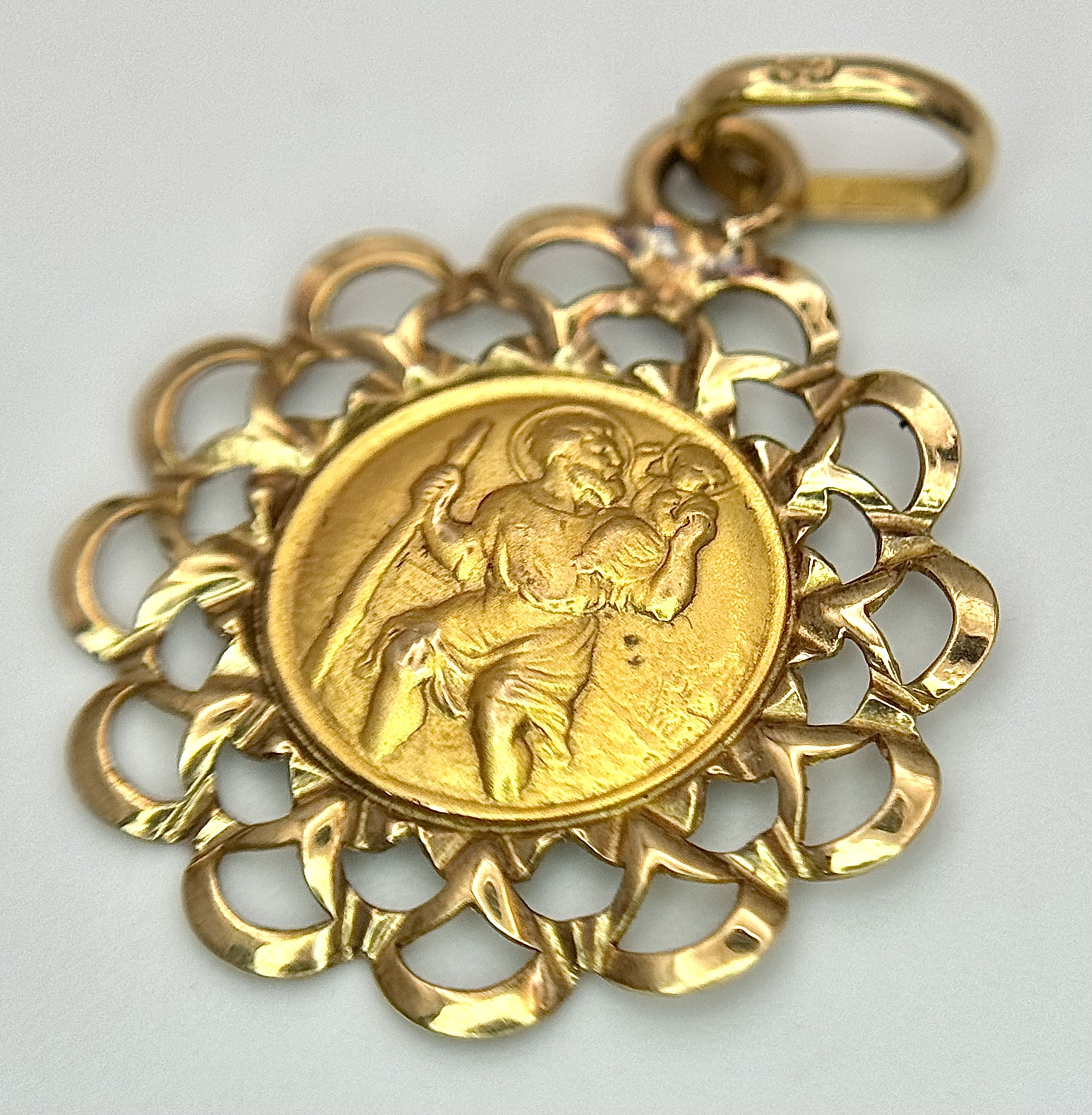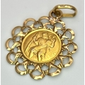 Beautiful 9 CARAT GOLD SAINT CHRISTOPHER CHARM/PENDANT. Having attractive double looped surround. 1.07 grams. 2.5 cm drop.