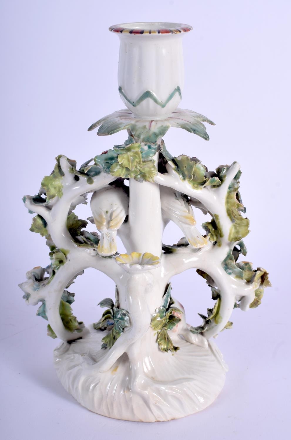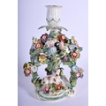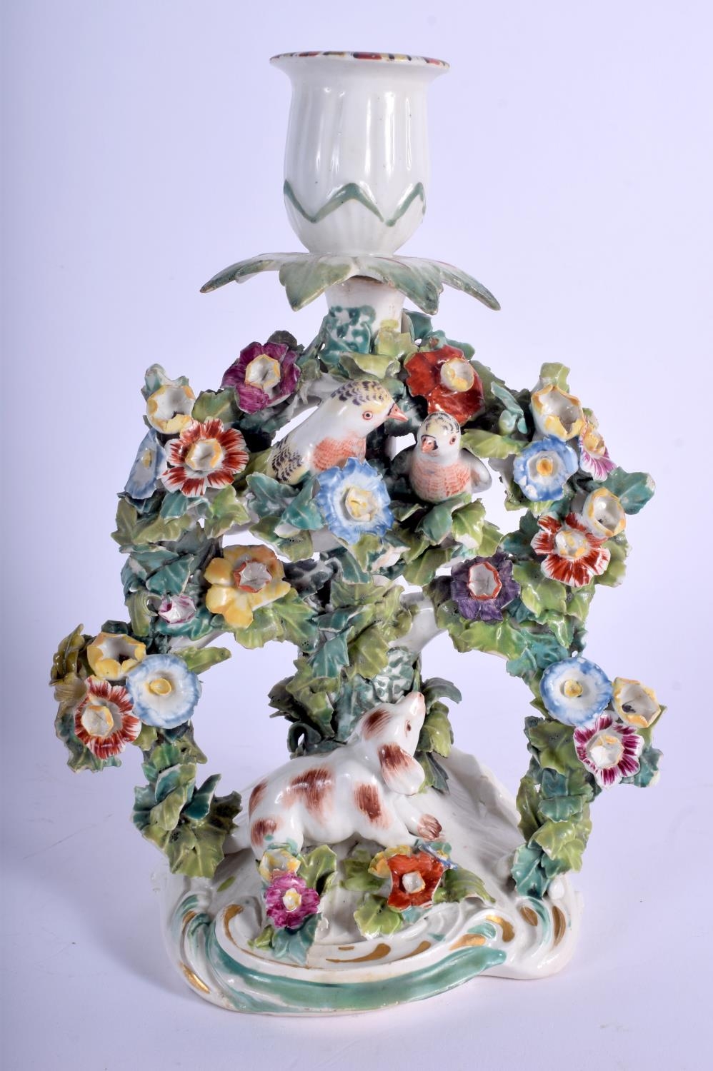 Derby candlestick figure group a dog seated beneath a flowering arbour with two birds perched among the branches. 21.5 cm high.