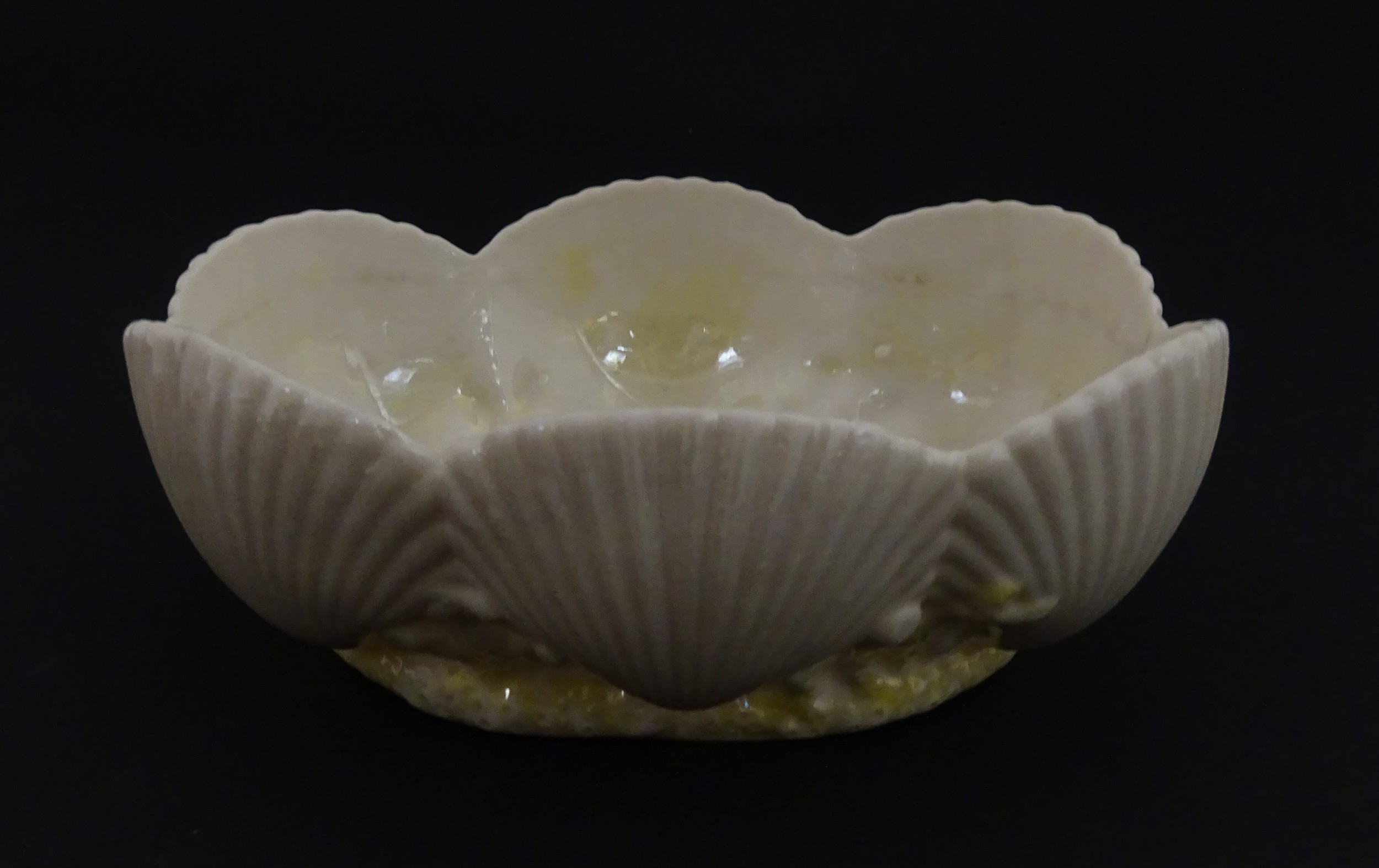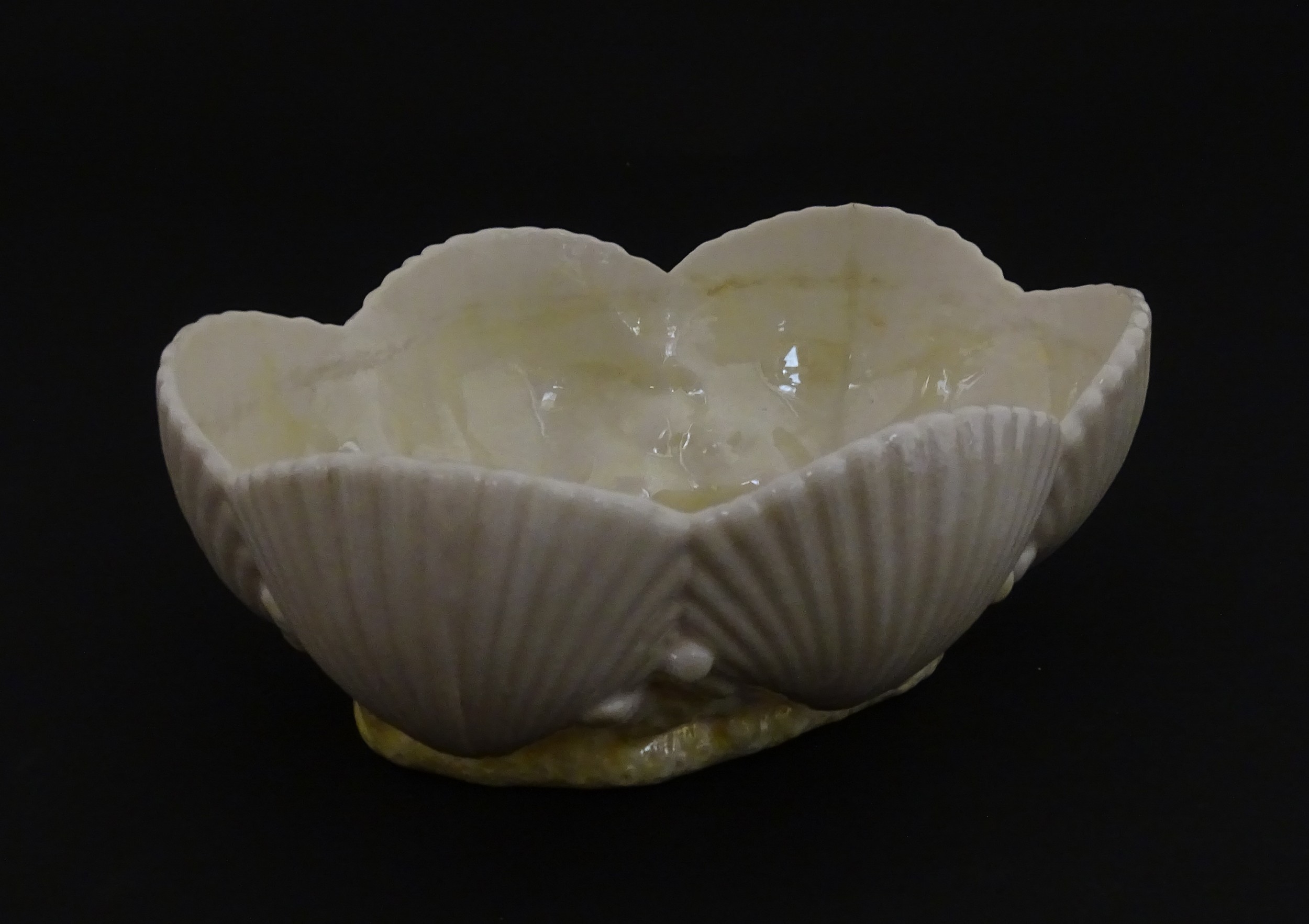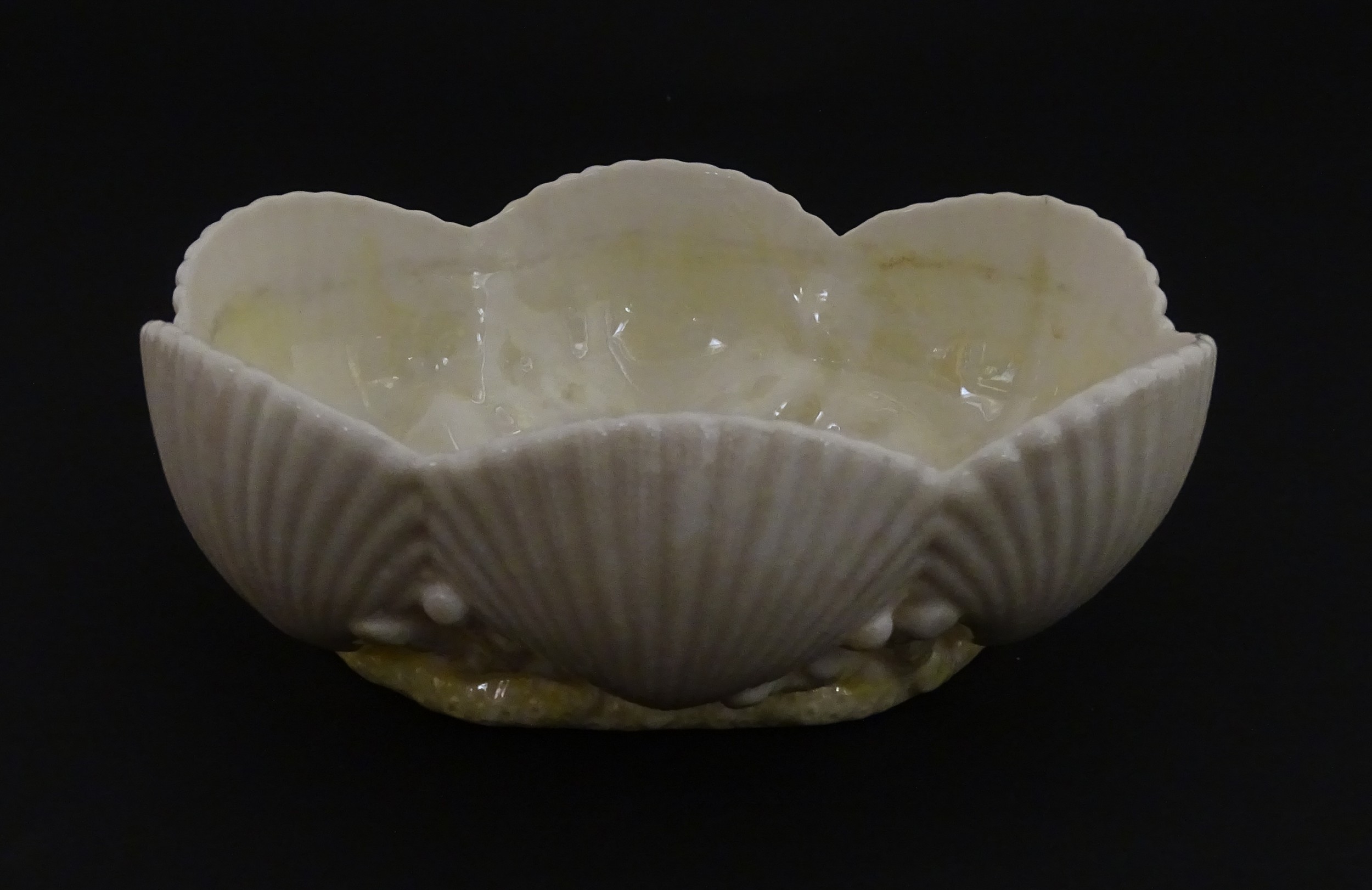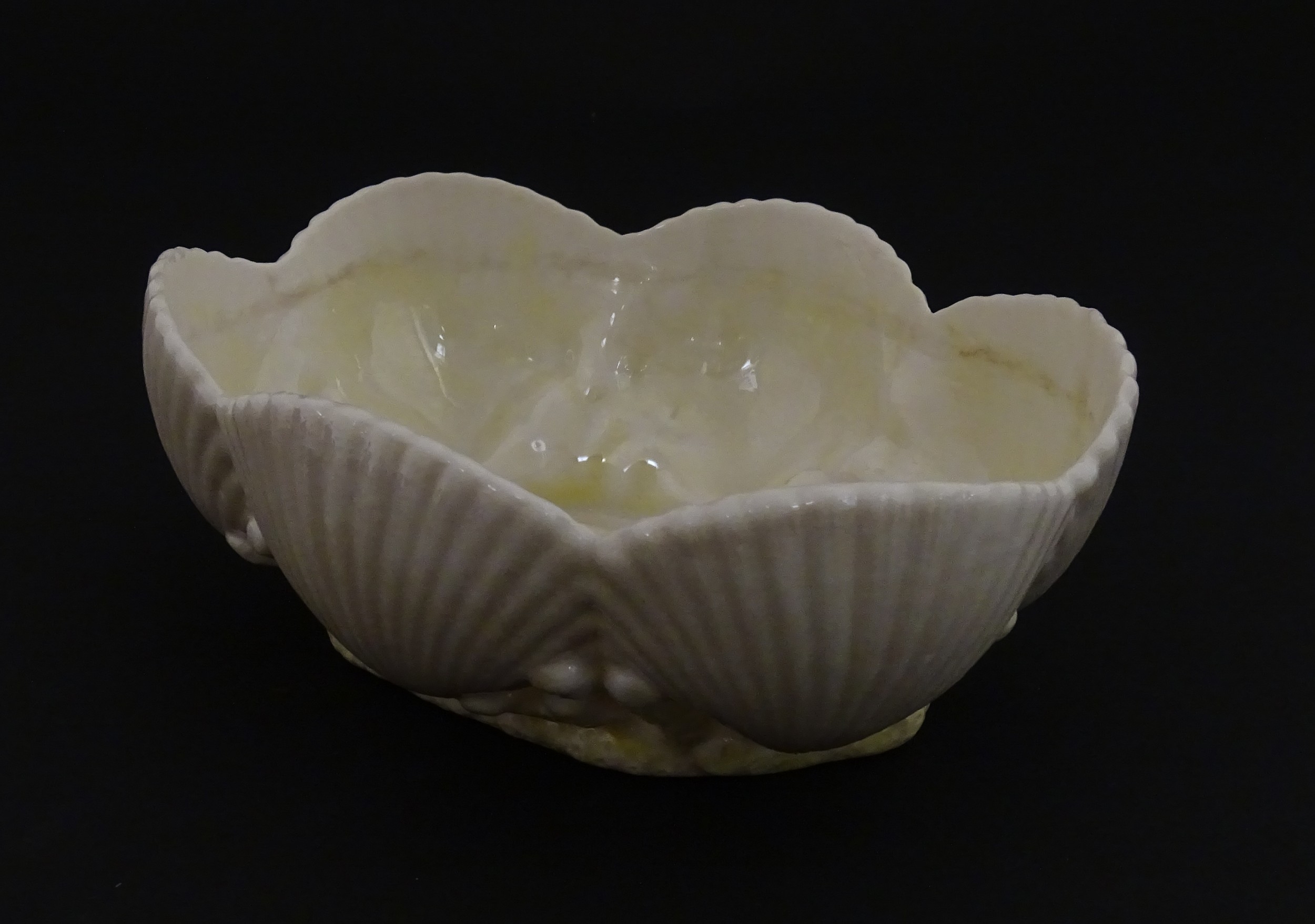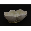 A Belleek dish with shell decoration and lustre highlights. Marked with First Period mark under. Approx. 5" wide