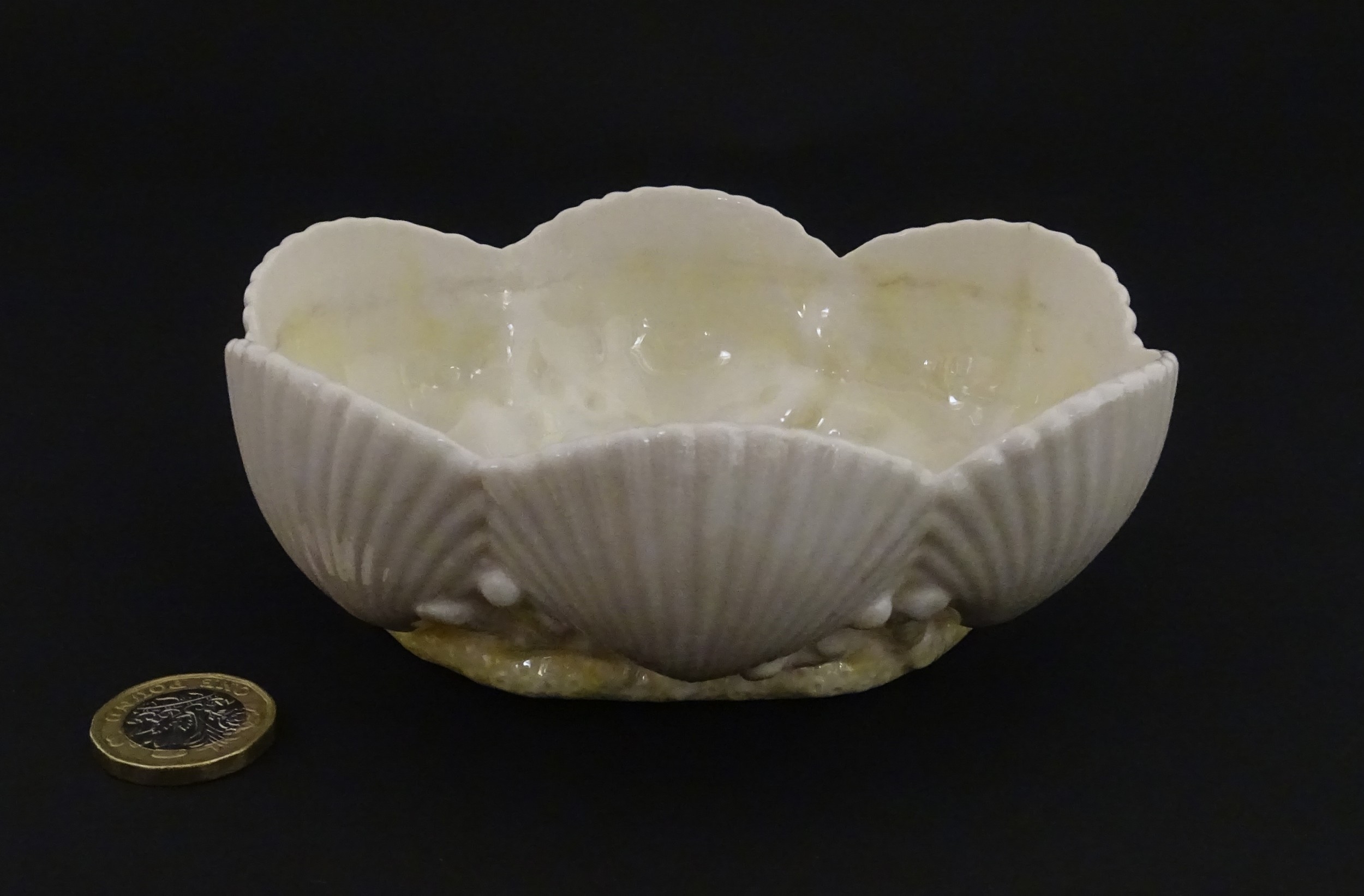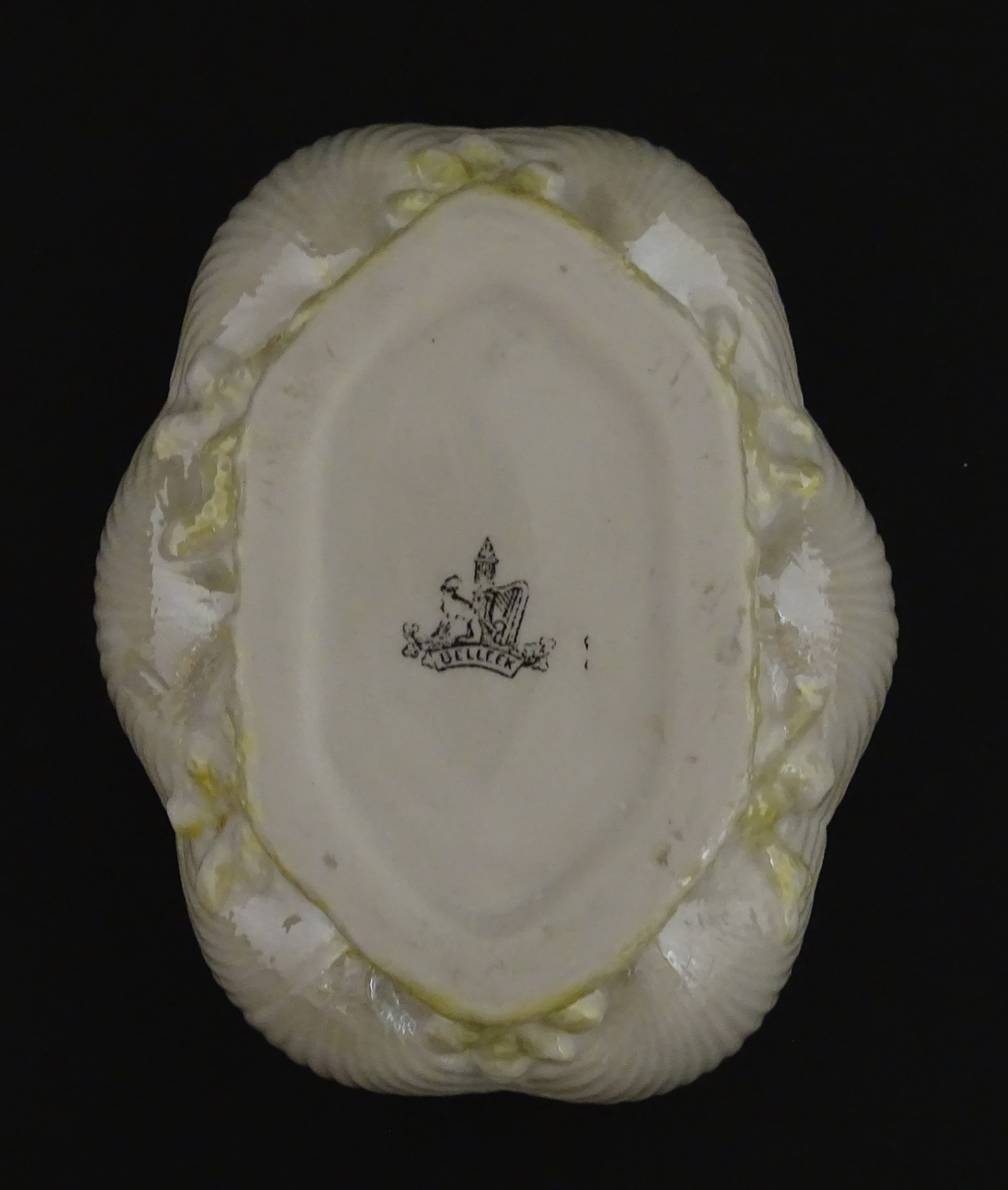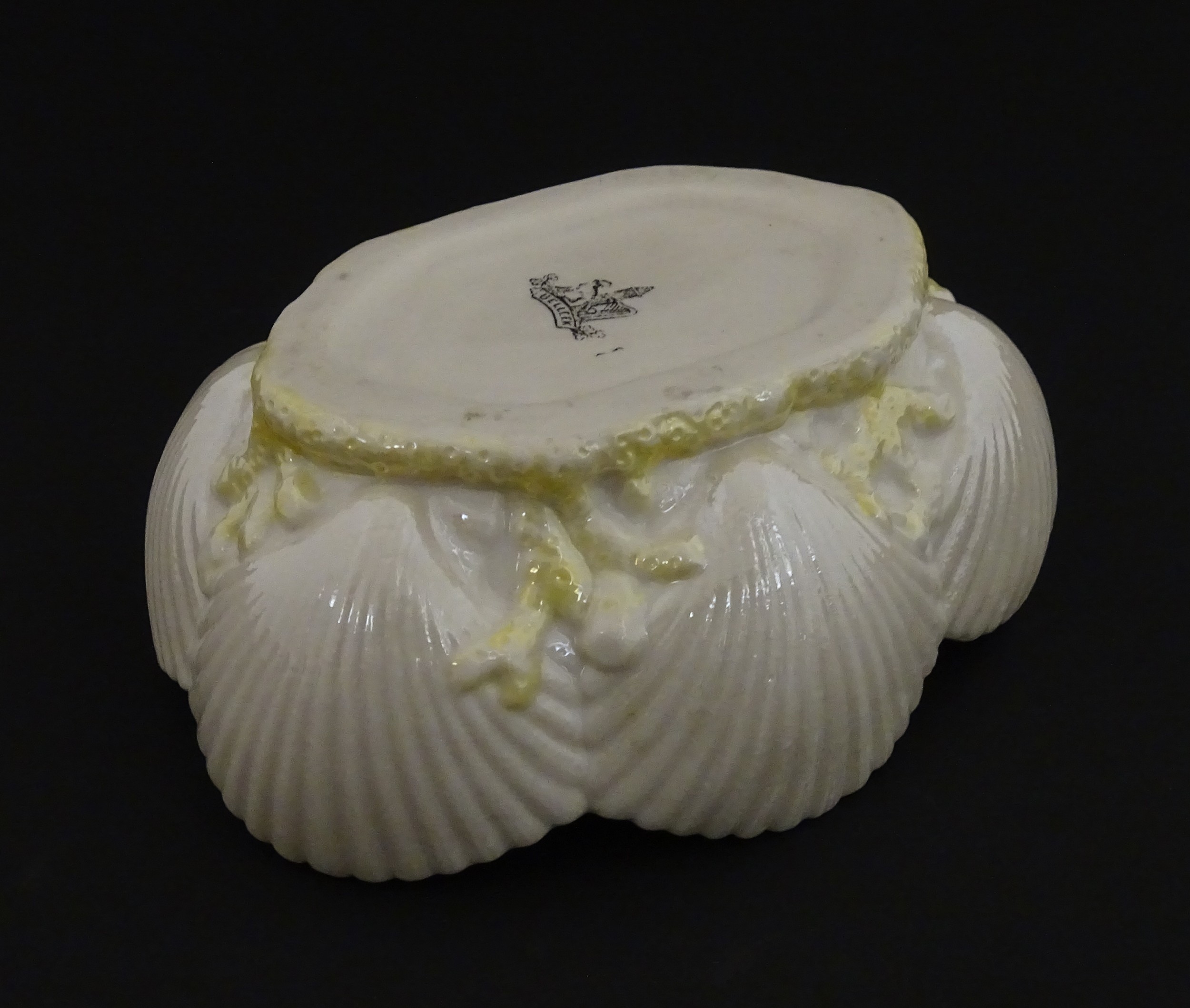 A Belleek dish with shell decoration and lustre highlights. Marked with First Period mark under. Approx. 5" wide