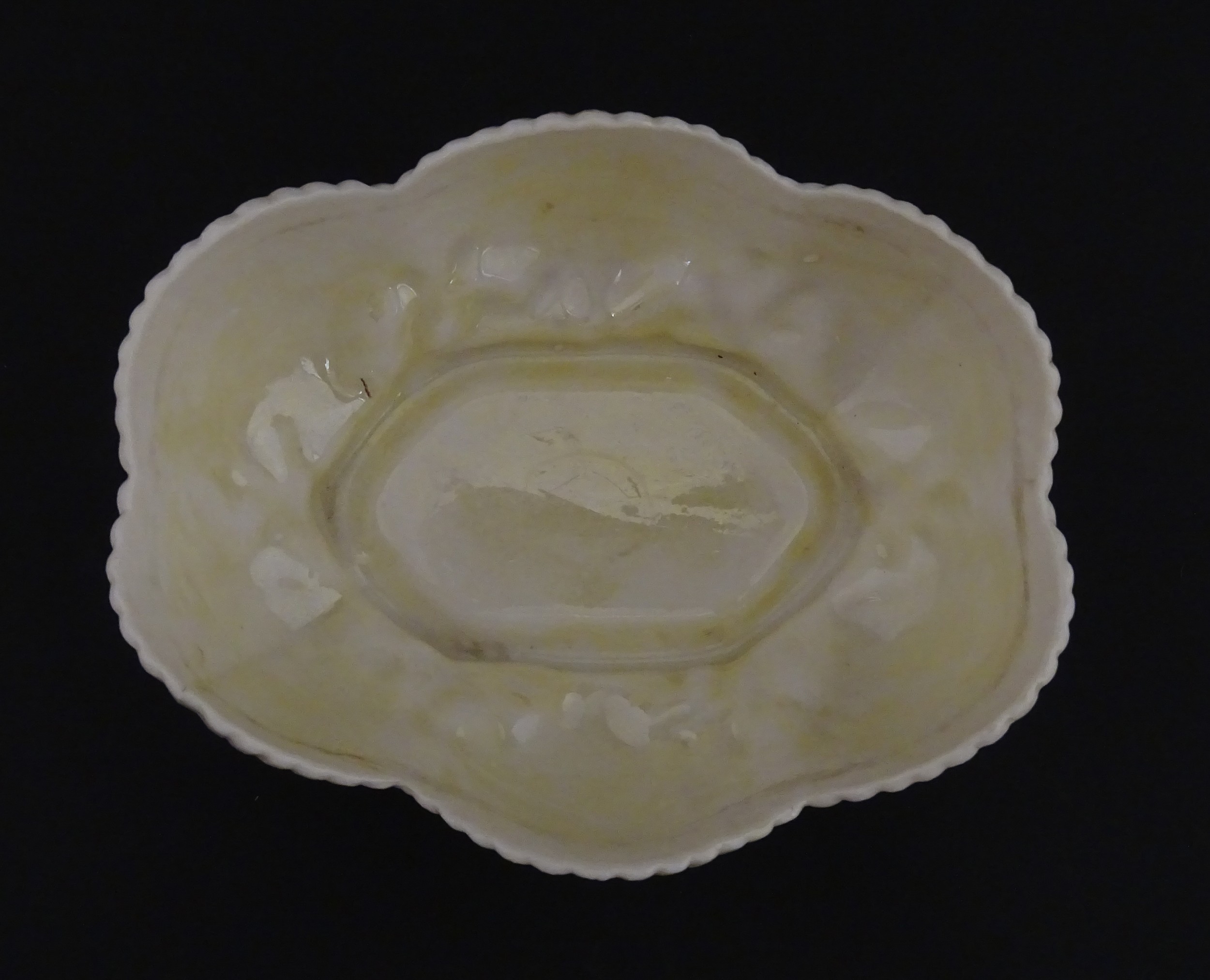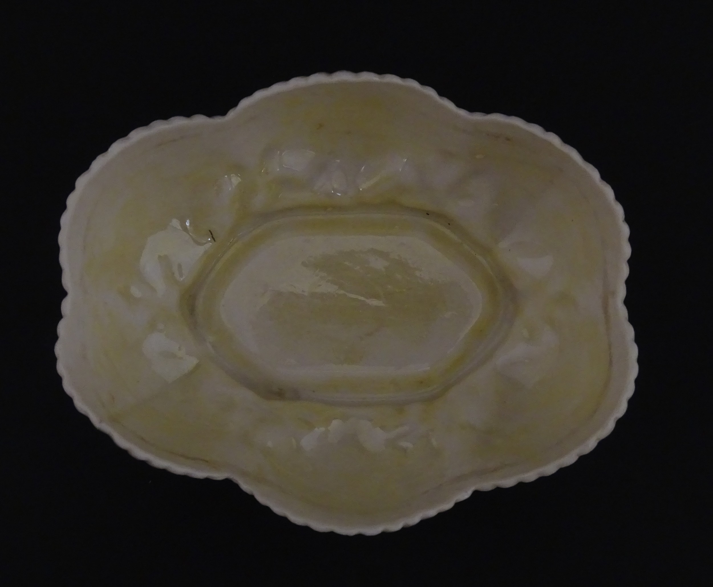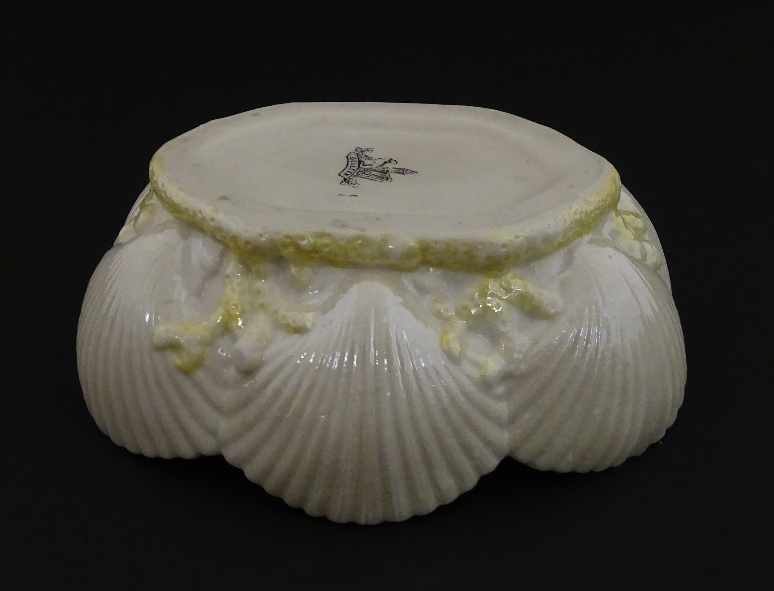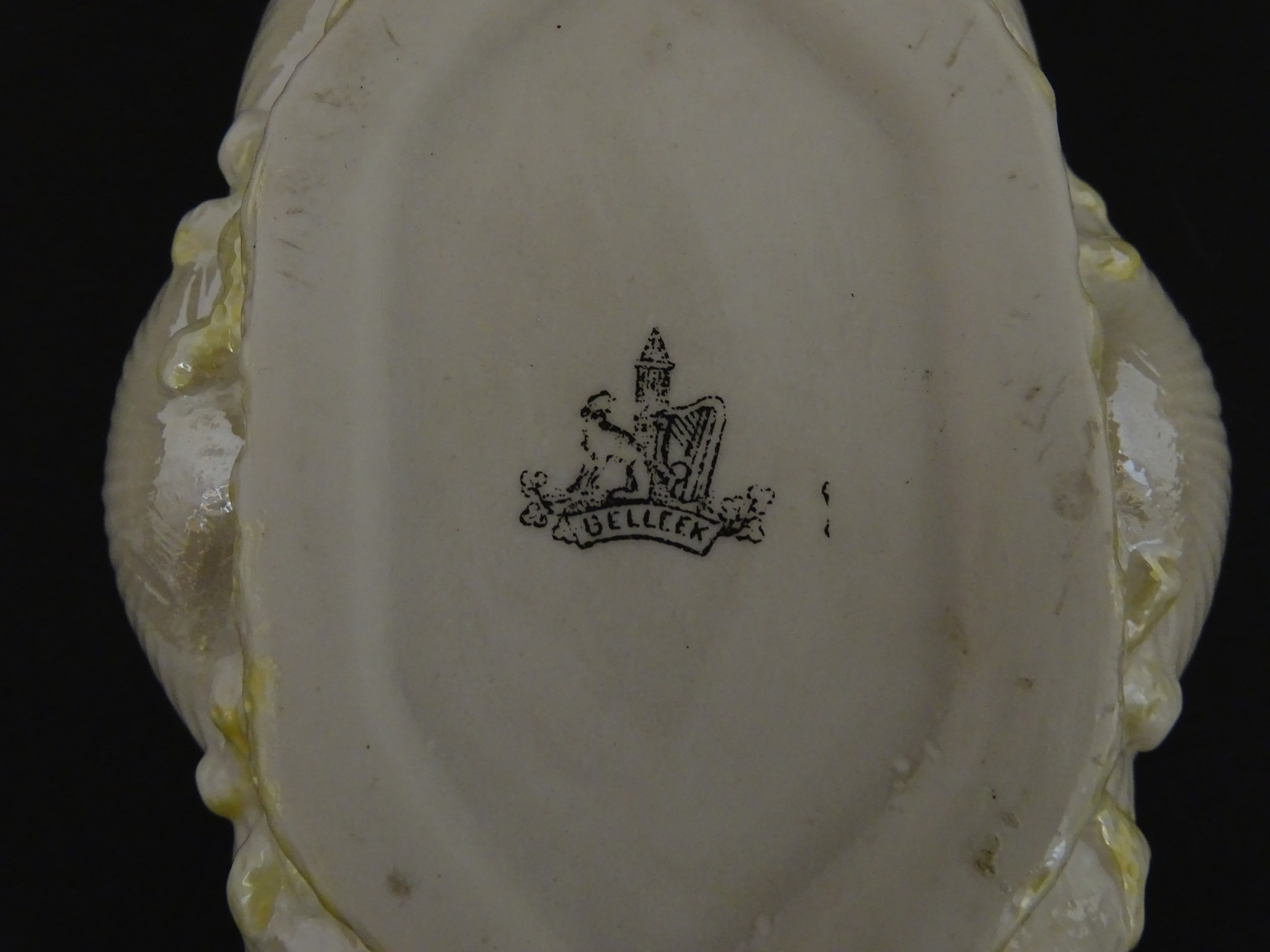 A Belleek dish with shell decoration and lustre highlights. Marked with First Period mark under. Approx. 5" wide