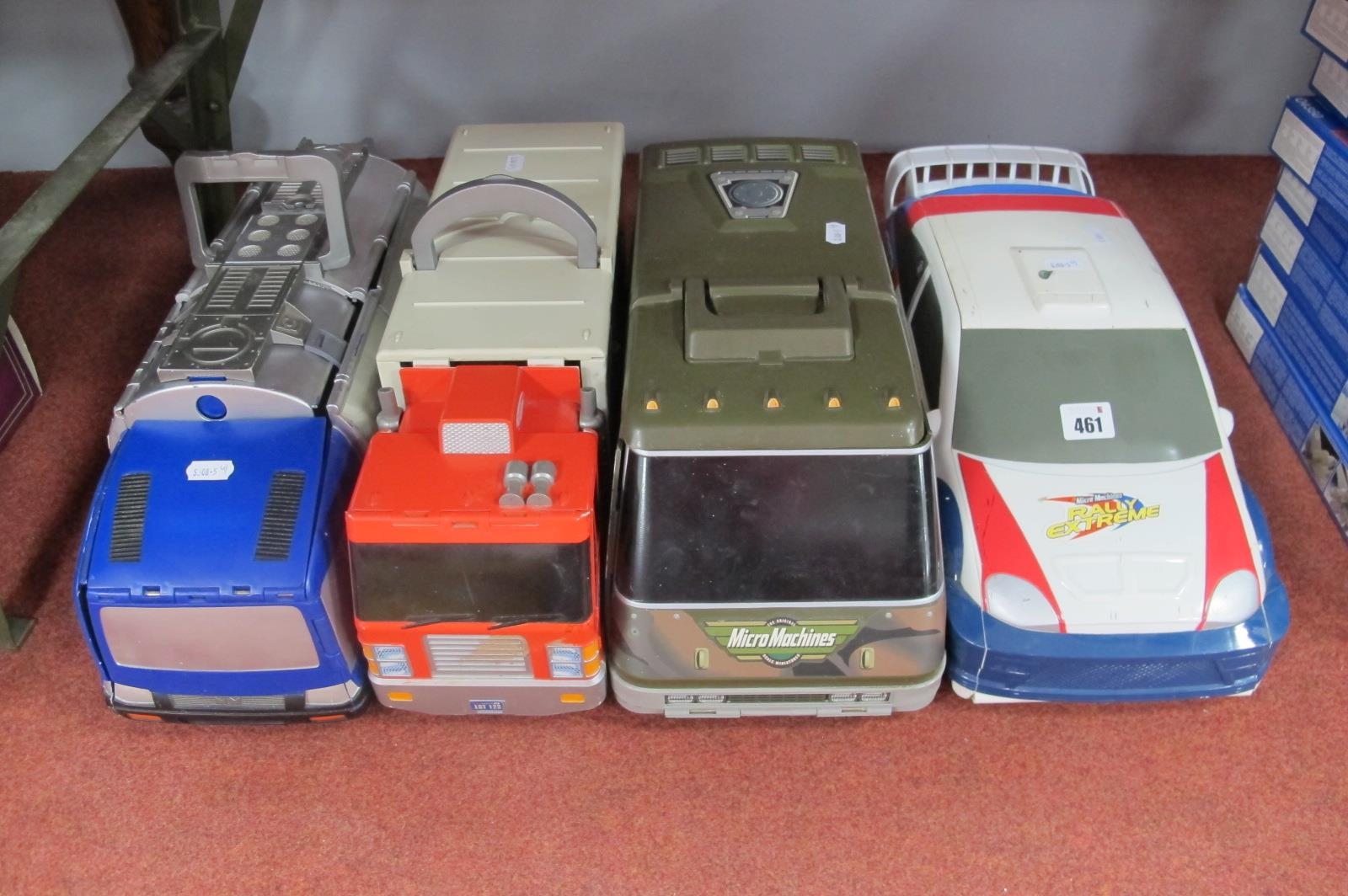 Four Micromachines Playsets/Carry Cases, to include Otto's Big City Truck, Army Vehicle, Hasbro Extreme Rally Car, Super Stunt City Tanker Lorry, together with a quantity of micro machines plastic vehicles.