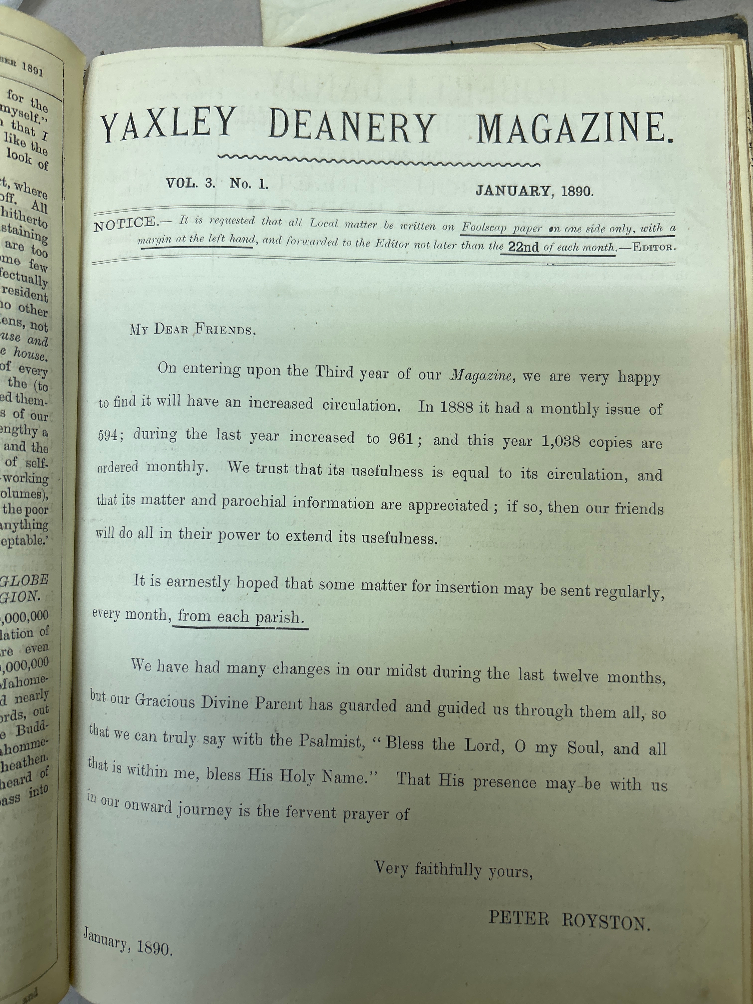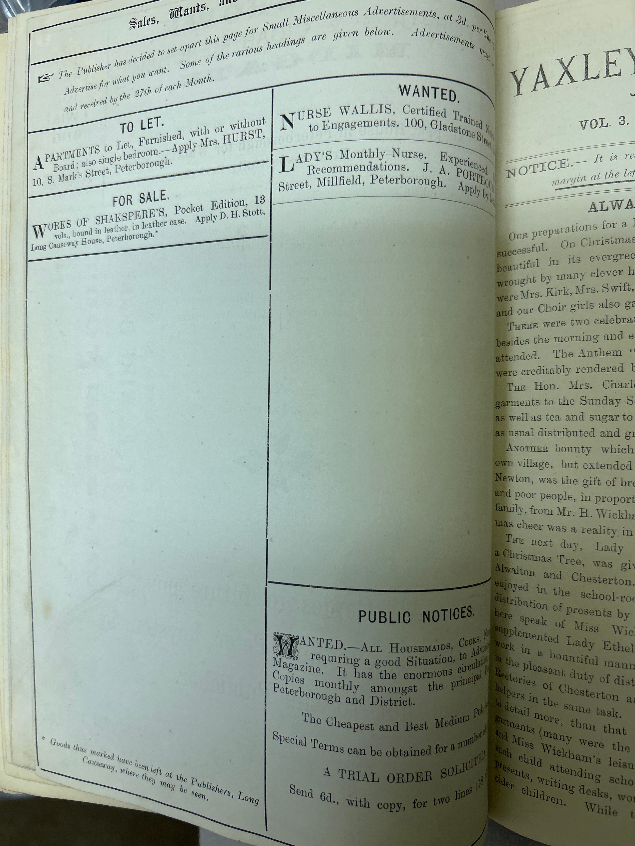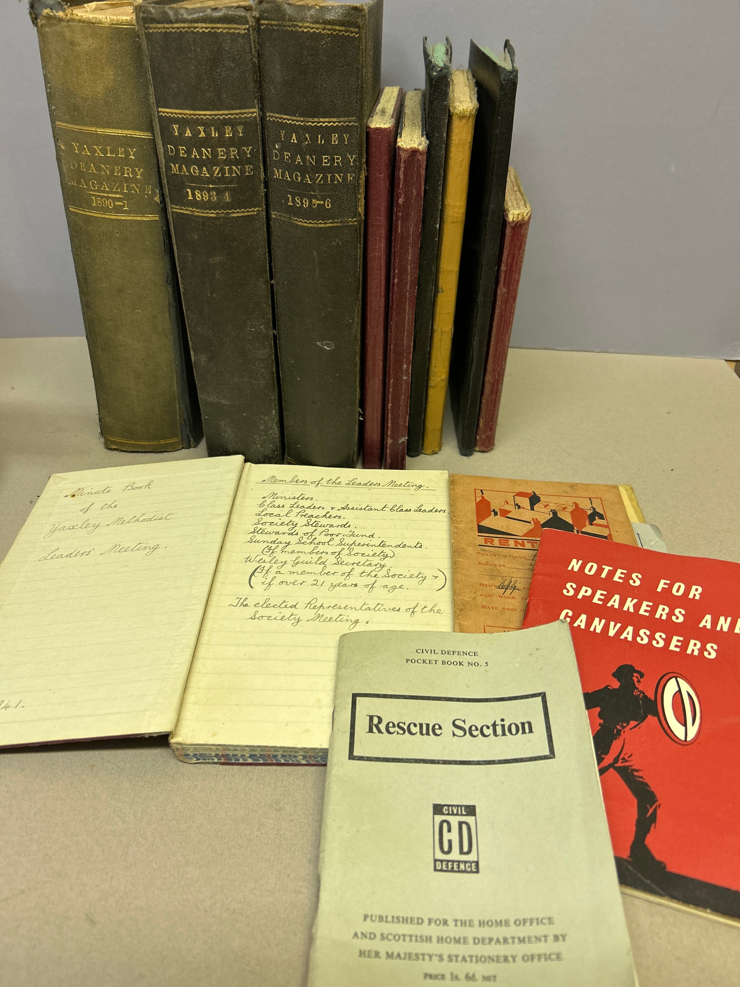 Yaxley (near Peterborough) Hunts & Cambs counties. Local history & social history interest. Includes 3 volumes of Yaxley Deanery Magazine 1890 to 1895, minute book of the Yaxley Methodist Leaders meeting 1941 and six journals of household income expenses for Yaxley family from 1933 to circa 1960. These include WW2 period and mention evacuees expenses. Also includes rent books for the same family and Civil Defence pamphlets
