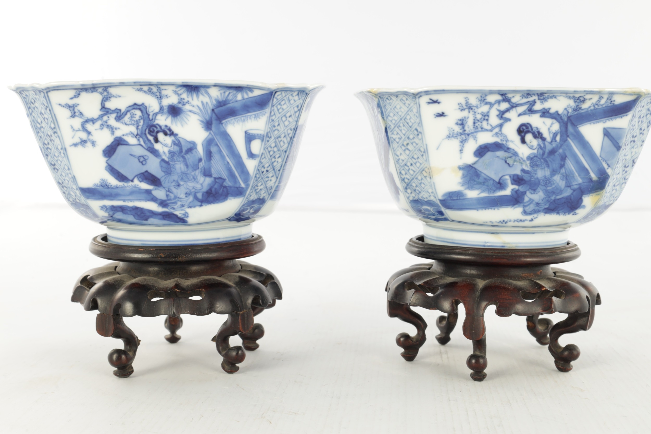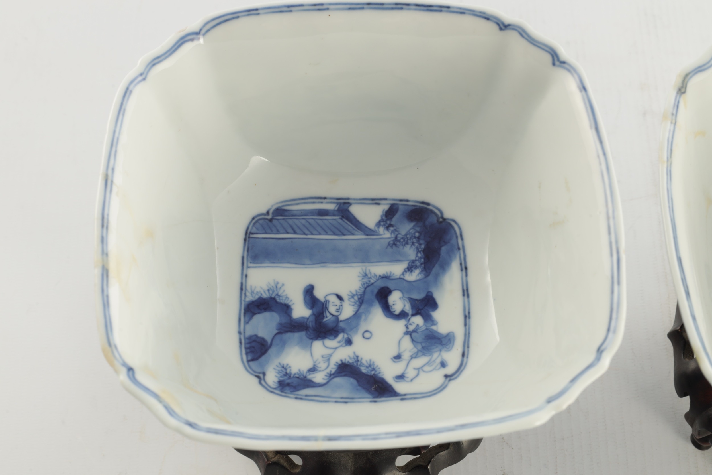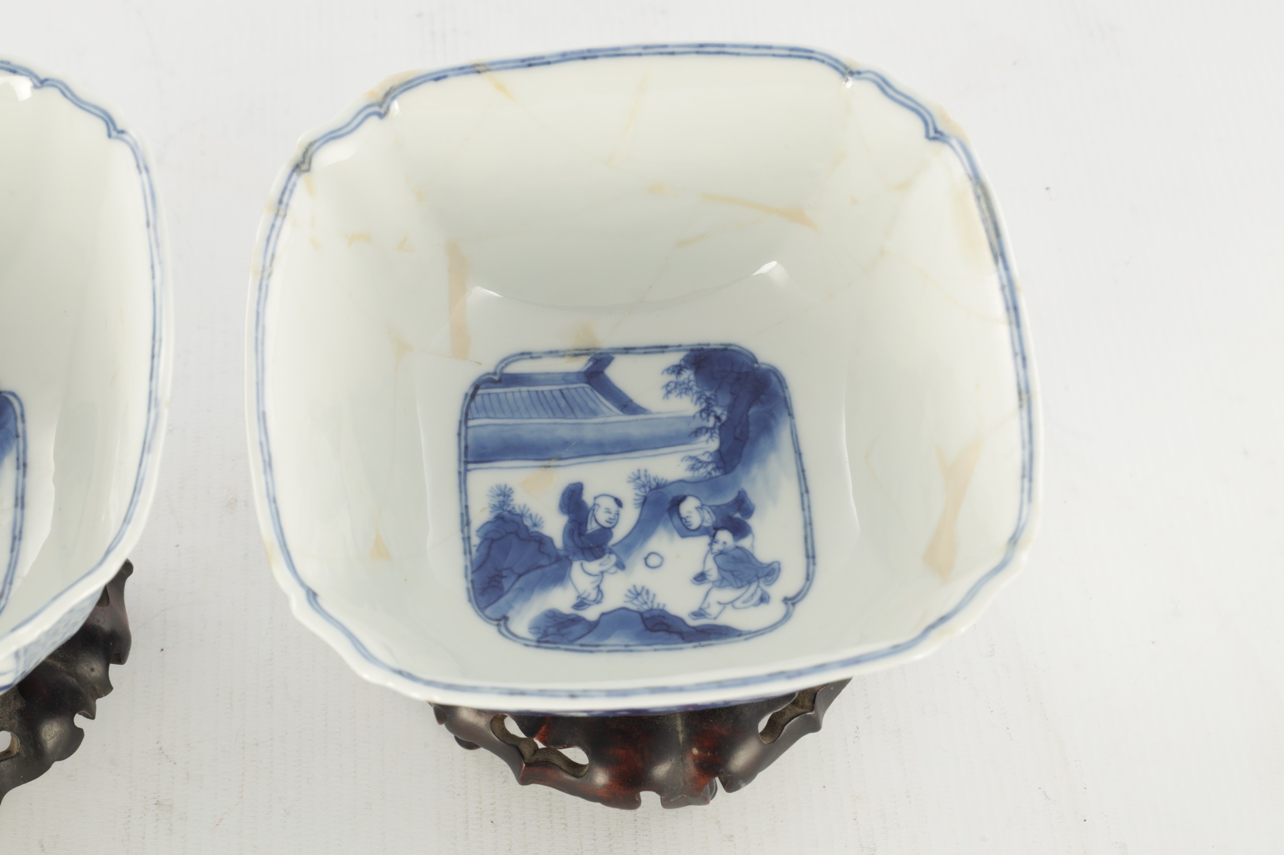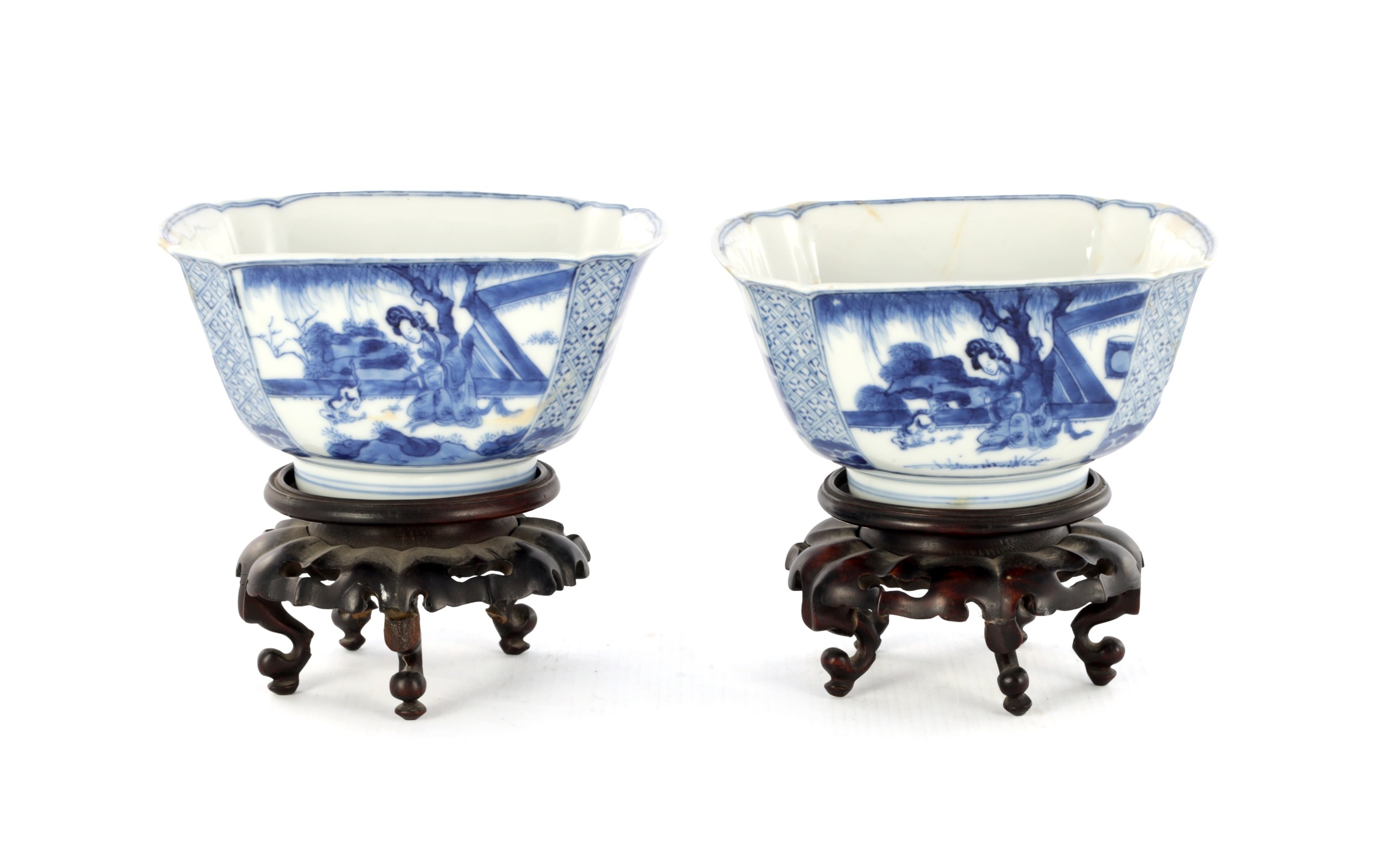 A PAIR OF CHINESE KANGXI BLUE AND WHITE BOWLS ON STANDS of square tapering footed form with shaped clipped corners decorated with panels of young ladies in garden settings, the centres with children playing ball games; on circular carved and pierced hardwood stands - six cypher marks beneath and of the date and period - both with old restorations (14.5cm square 8cm high)