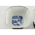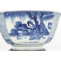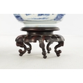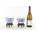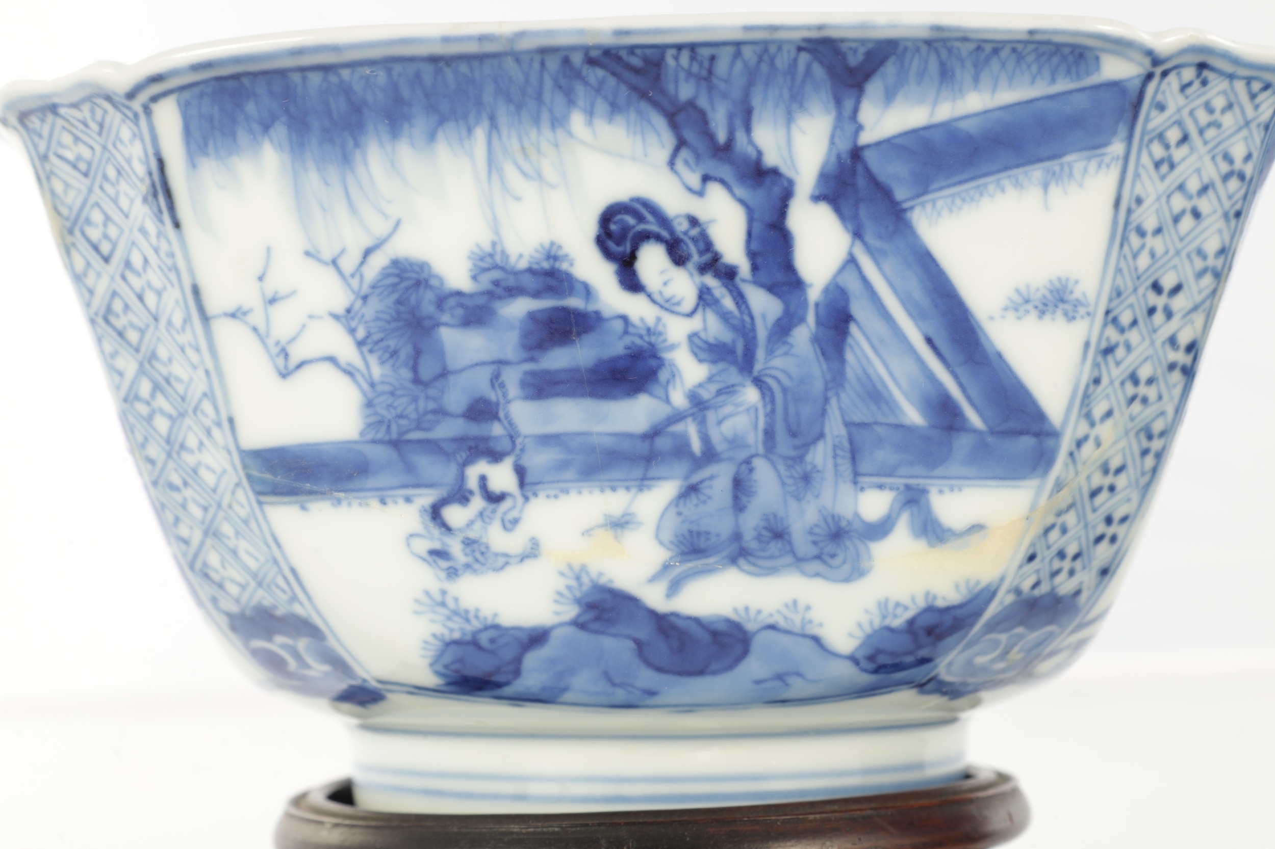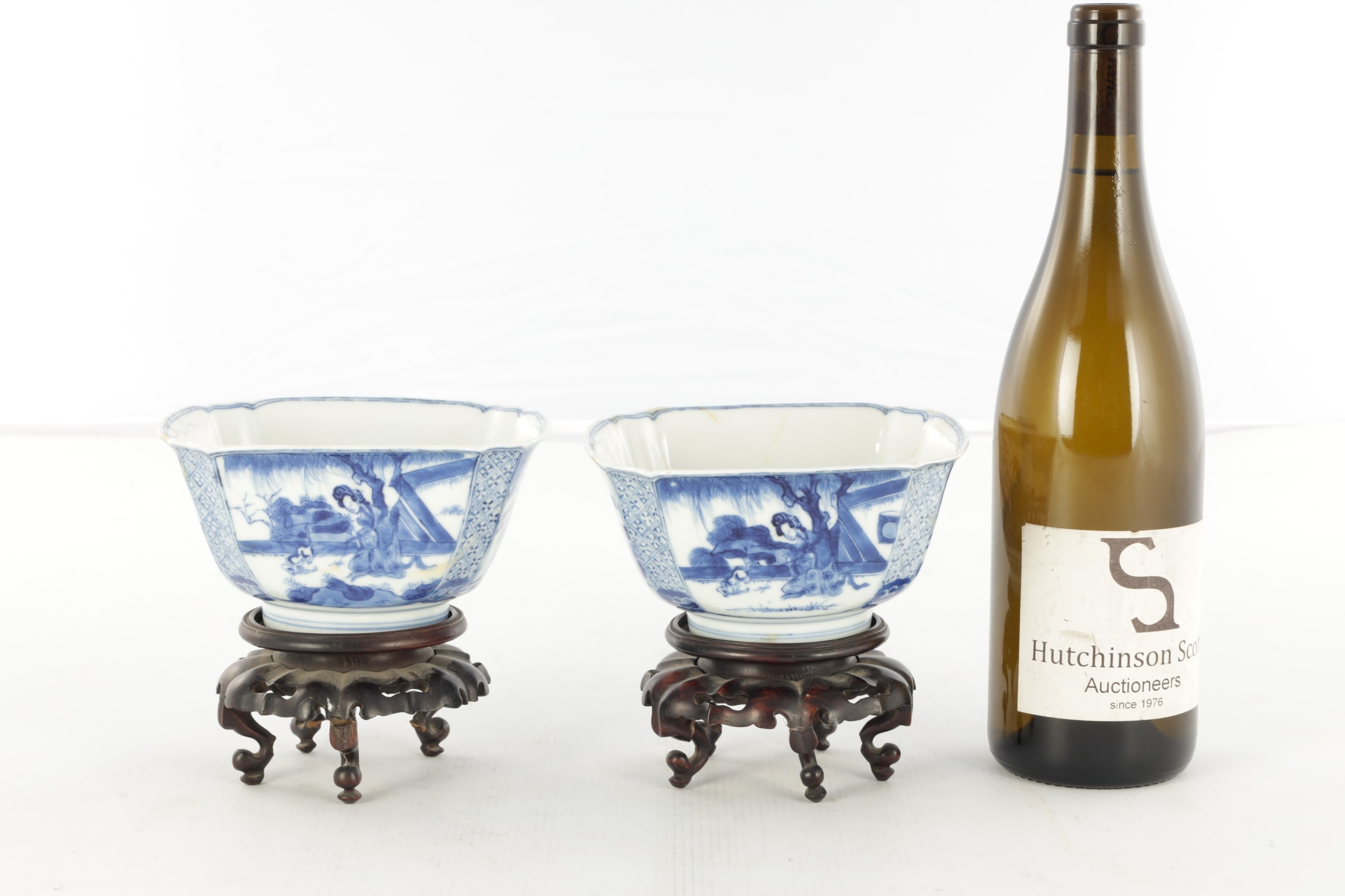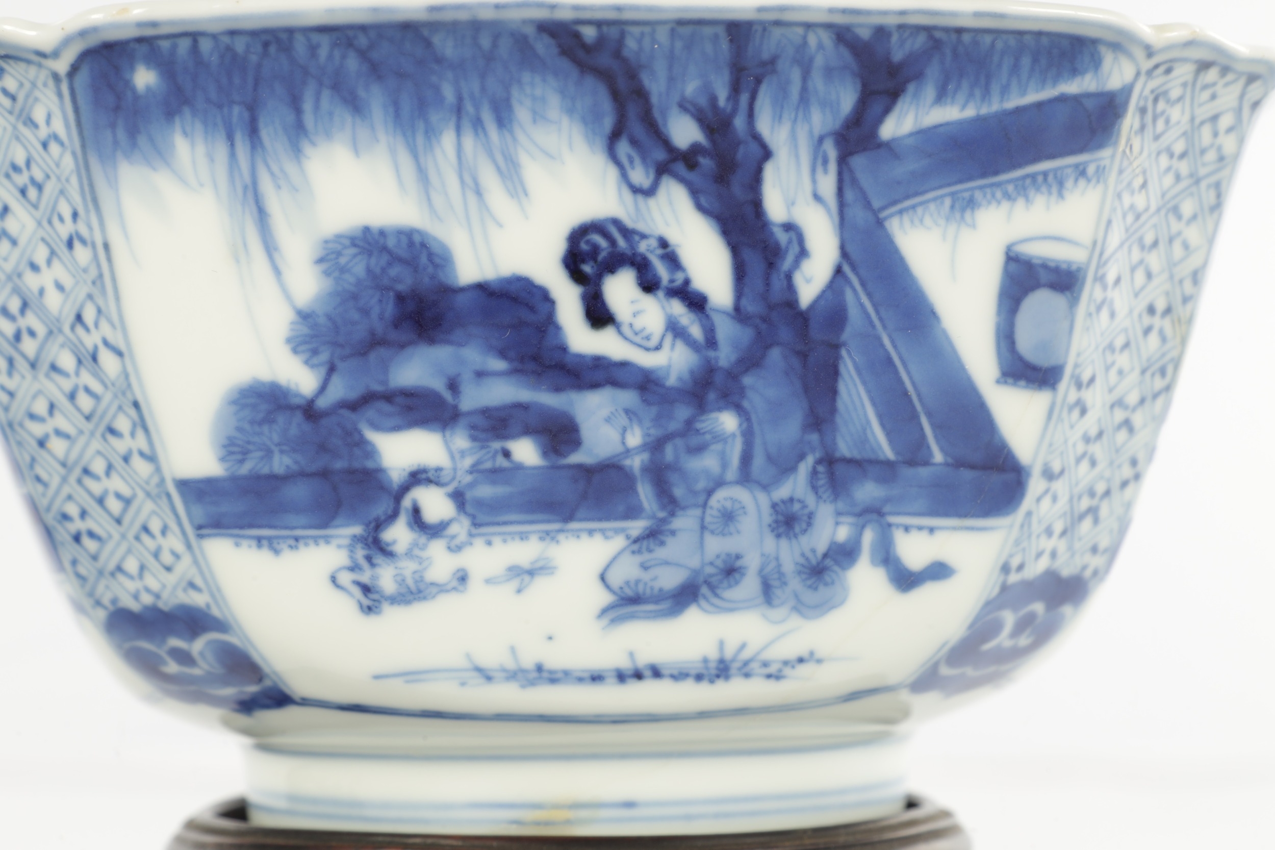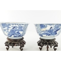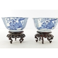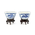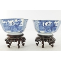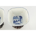 A PAIR OF CHINESE KANGXI BLUE AND WHITE BOWLS ON STANDS of square tapering footed form with shaped clipped corners decorated with panels of young ladies in garden settings, the centres with children playing ball games; on circular carved and pierced hardwood stands - six cypher marks beneath and of the date and period - both with old restorations (14.5cm square 8cm high)