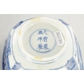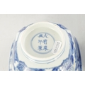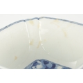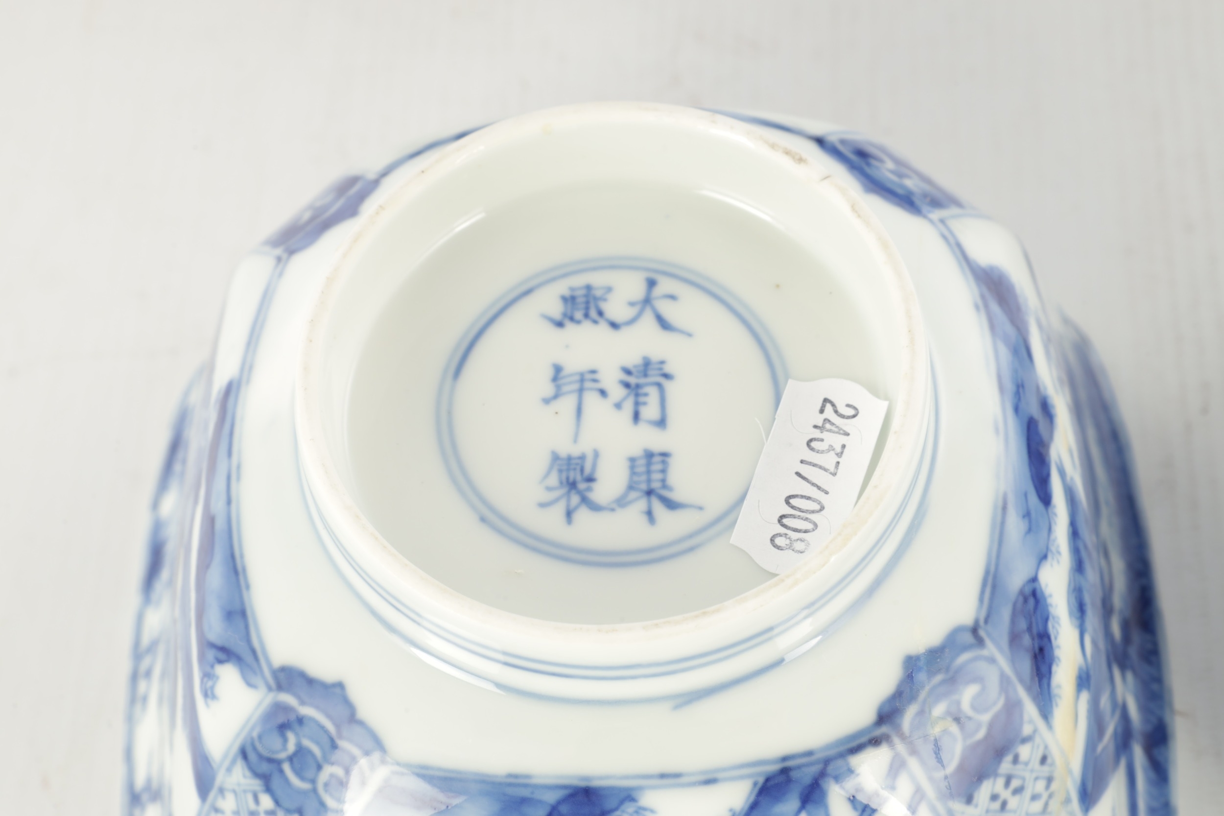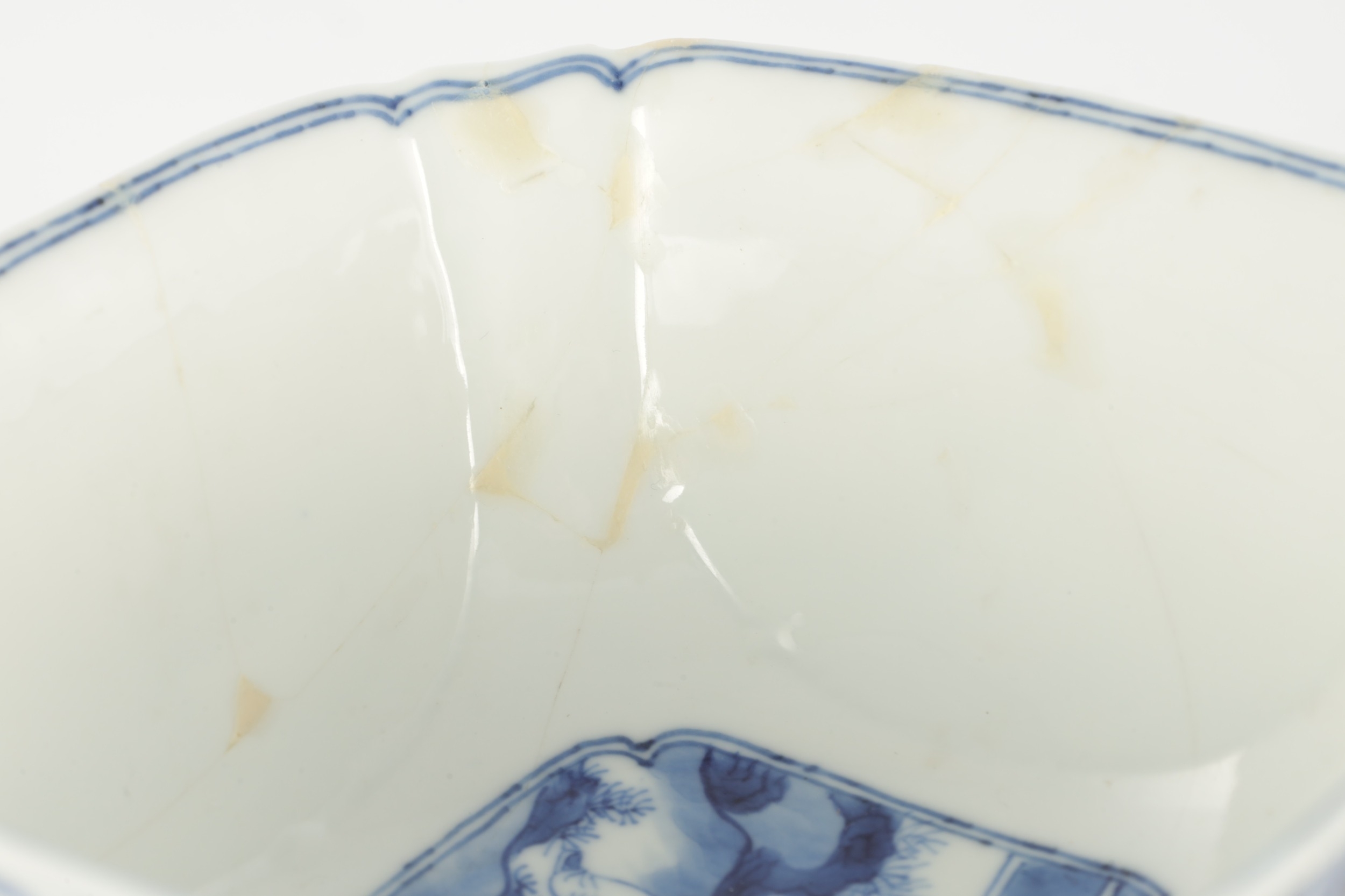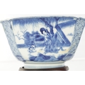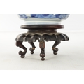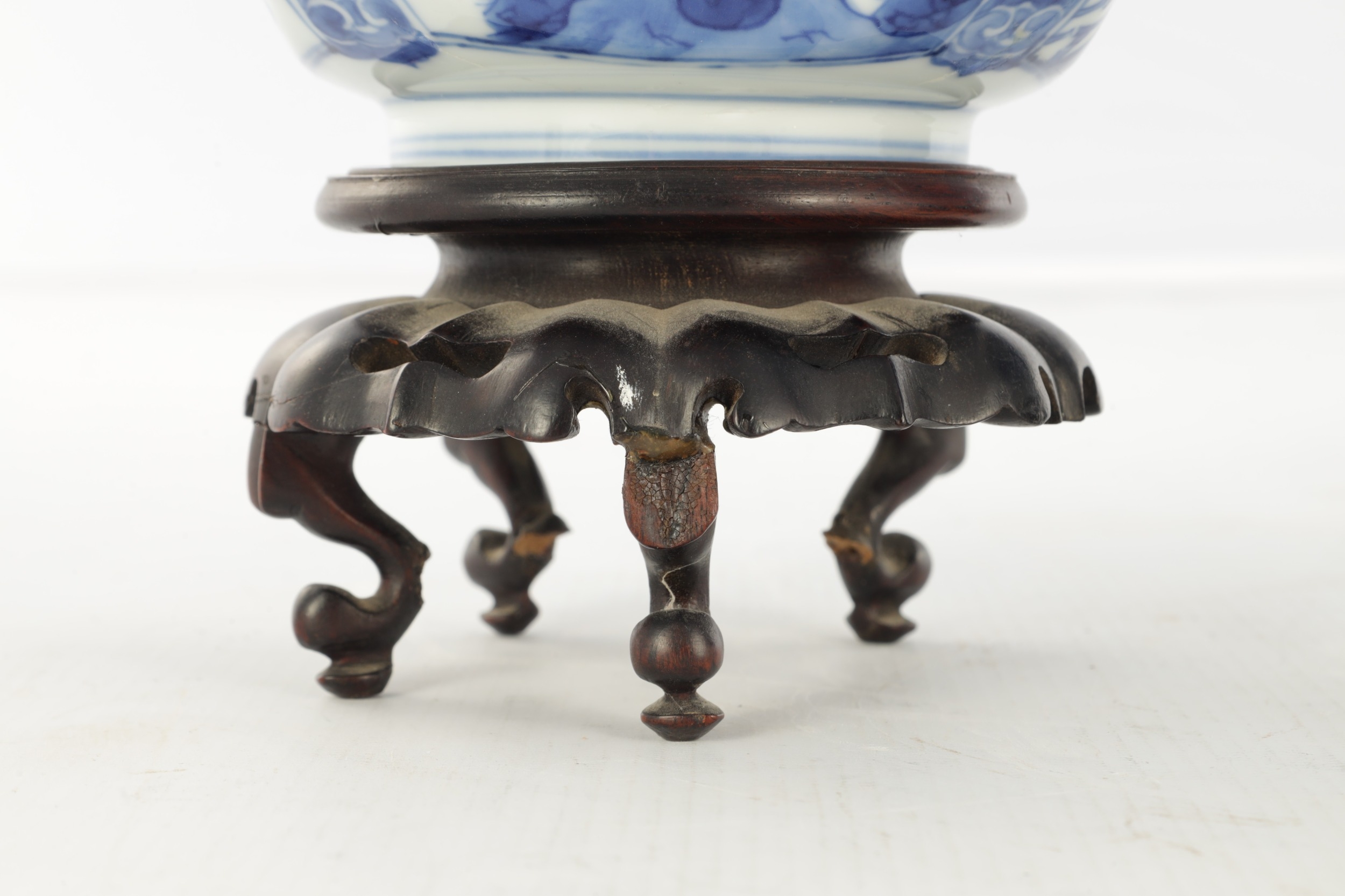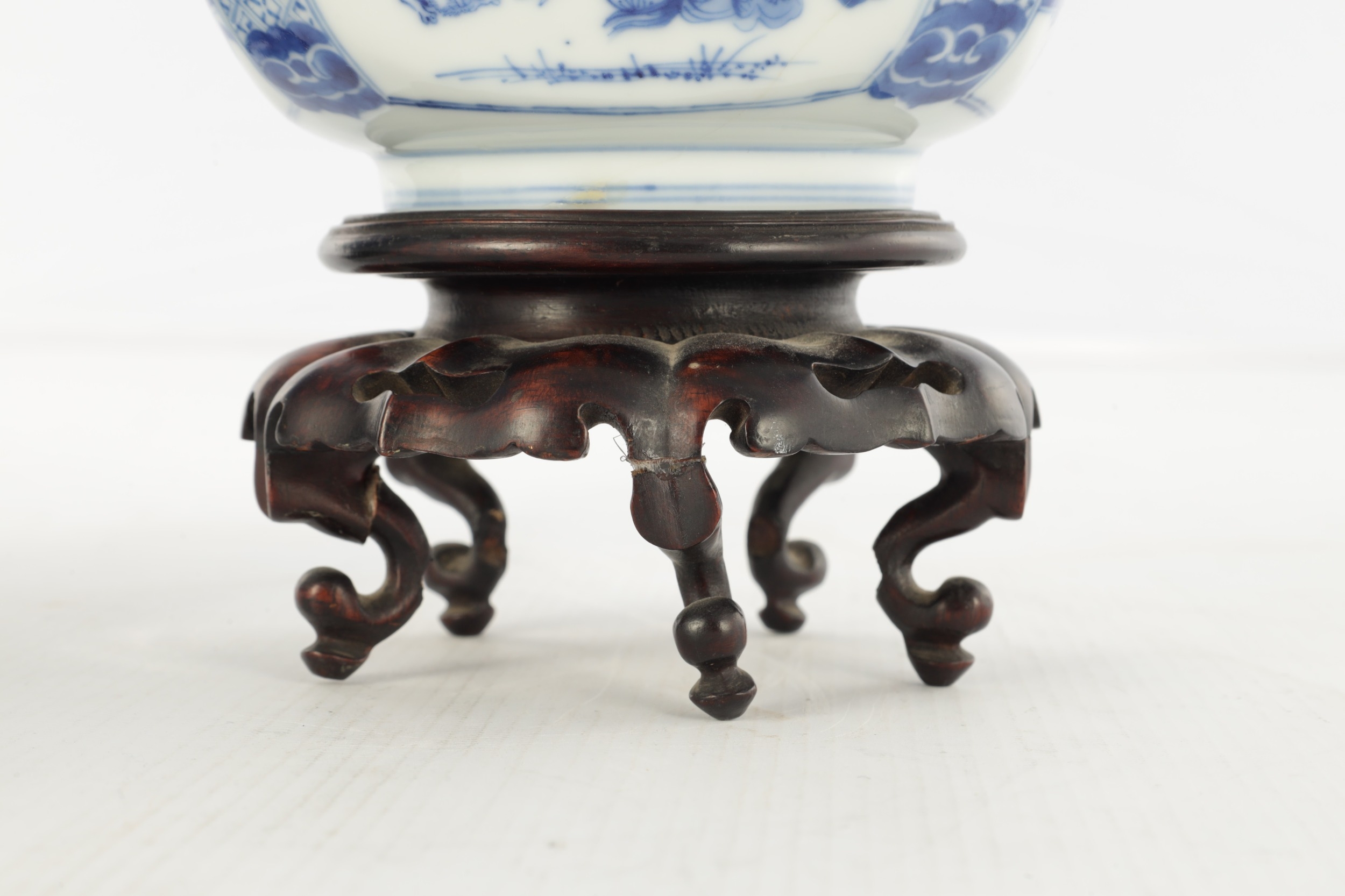 A PAIR OF CHINESE KANGXI BLUE AND WHITE BOWLS ON STANDS of square tapering footed form with shaped clipped corners decorated with panels of young ladies in garden settings, the centres with children playing ball games; on circular carved and pierced hardwood stands - six cypher marks beneath and of the date and period - both with old restorations (14.5cm square 8cm high)