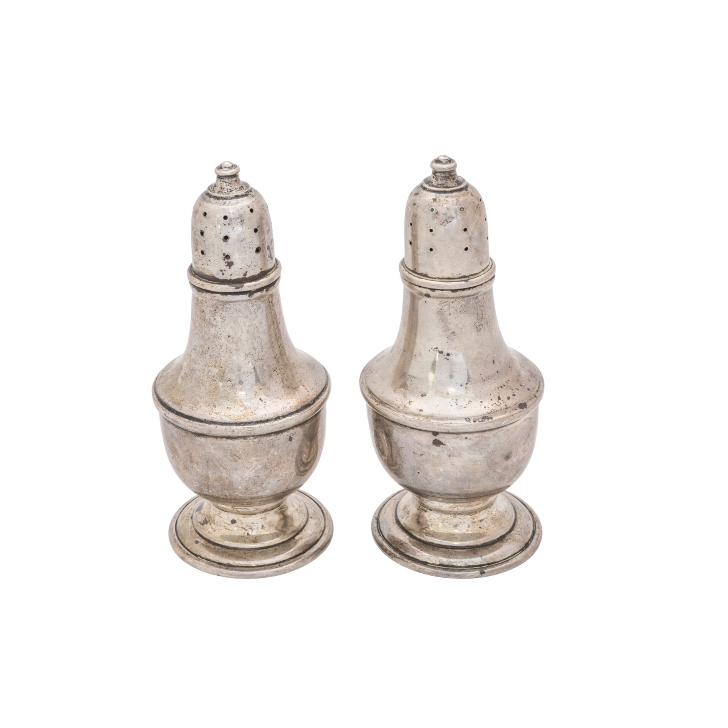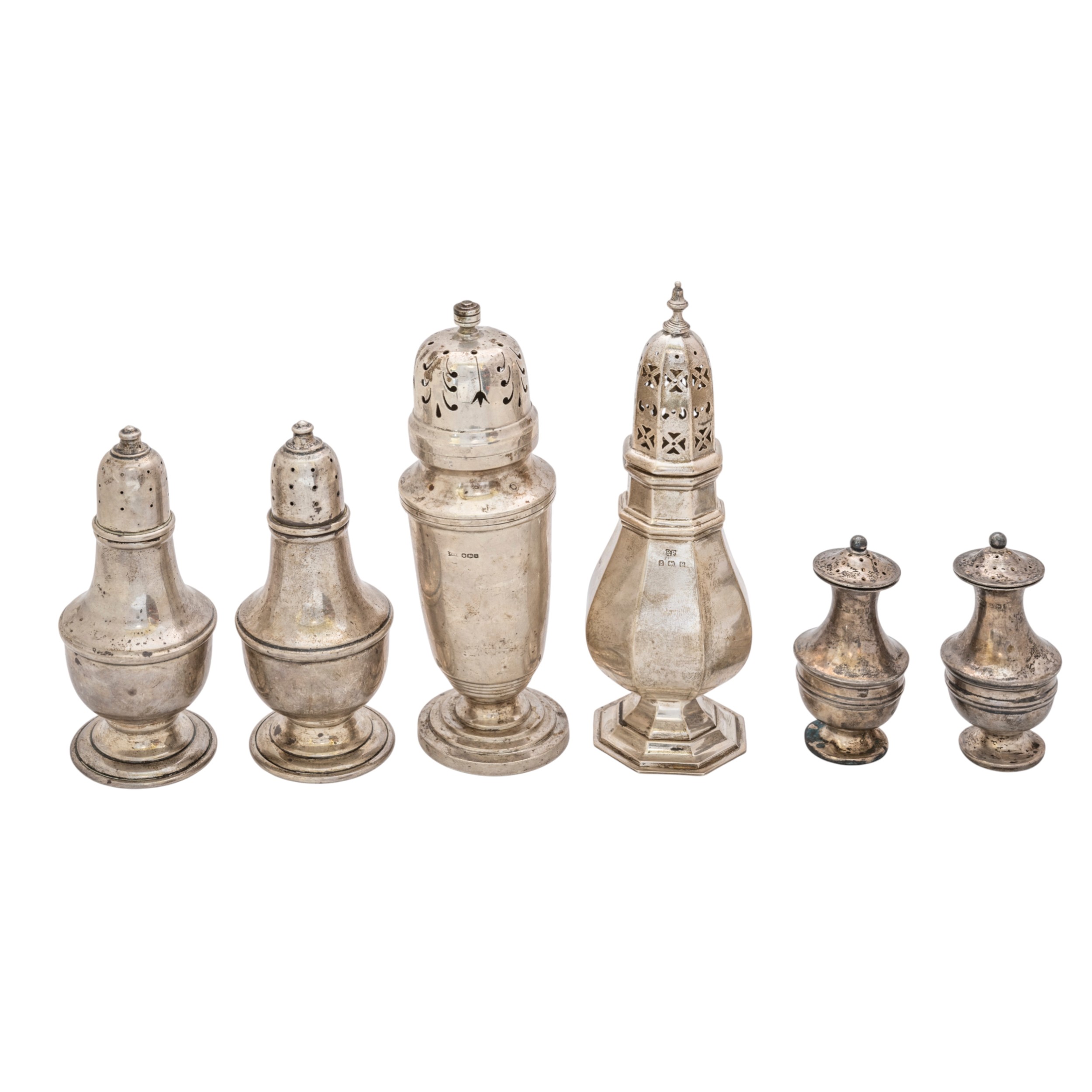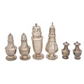 Birmingham, 1914, Robert Pringle and Sons, another silver caster, Sheffield, 1906, a pair of plain baluster Sterling silver casters and a small pair of silver peppers, approx. 406g.