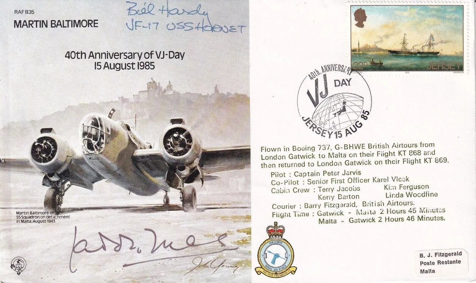 B35c 40th Anniv VJ Day Signed Wg Cdr Laddie Lucas, and Bill Hardy USA Pilot Ace. 40th Anniv VJ - Day Flown in Boeing 737 London Gatwick to Malta and back. 40th Anniv VJ - Day. Personally Signed Wg. Cdr. Laddie Lucas 249 Sqn WW11 ace 1 and 2 shared destroyed 1 Probable, 8 and 1 shared damaged Victories in Spitfire Aircraft. Commander Bill Hardy VF 17 USS Hornet 10 Victories USA Ace. Certified Copy no 0955 of 1200. Very Few Additional Signed Cdr Bill Hardy. Single Vendor RAF cover collection. Good condition. All autographs come with a Certificate of Authenticity. We combine postage on multiple winning lots and can ship worldwide. UK postage from £5.99, EU from £7.99, Rest of World from £9.99