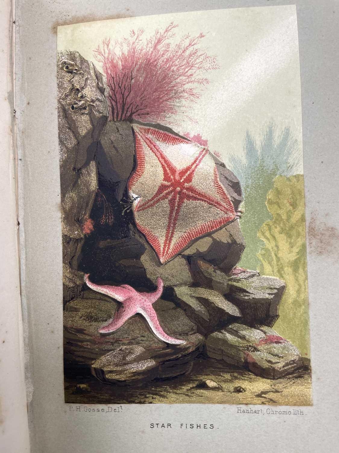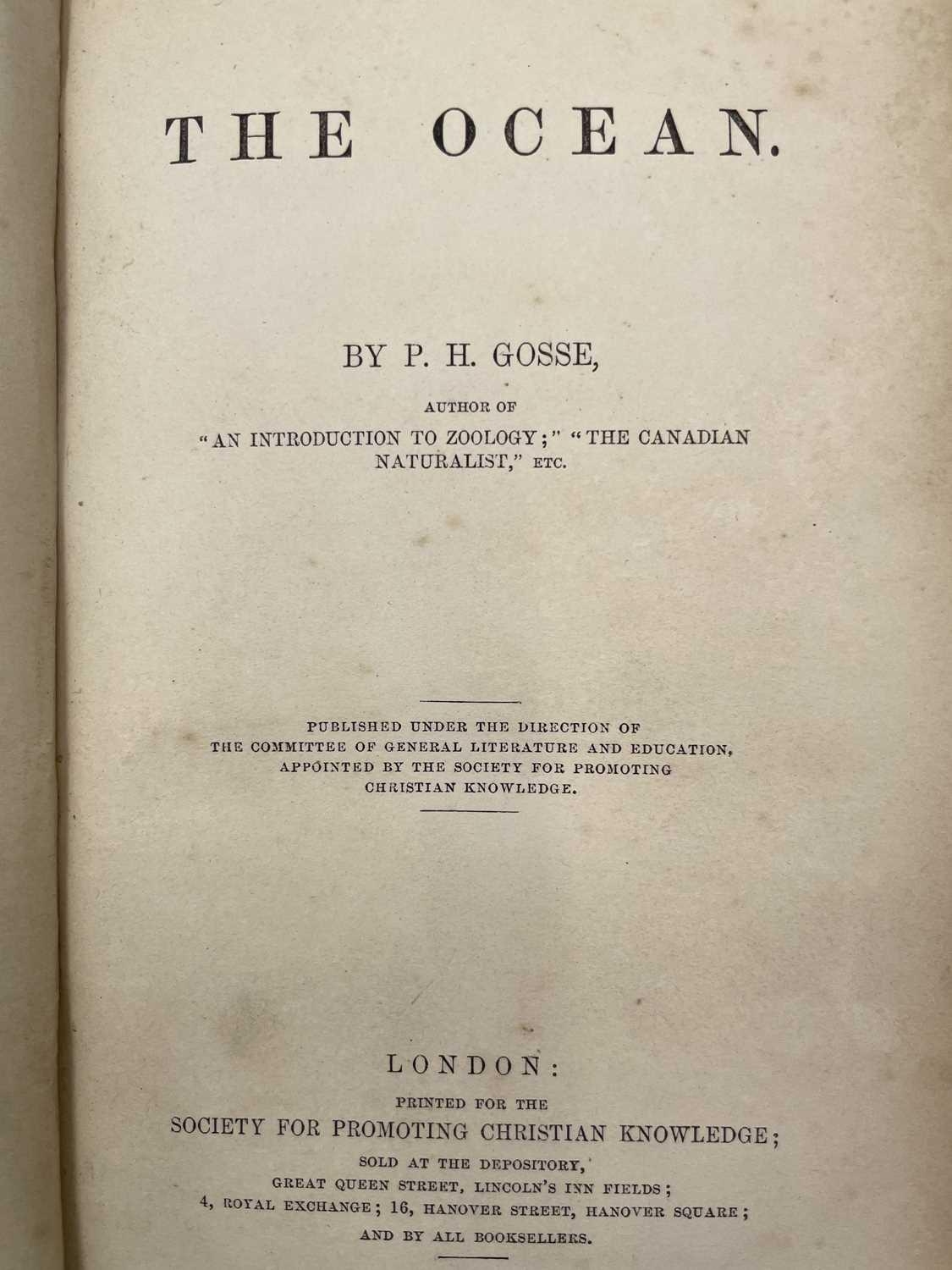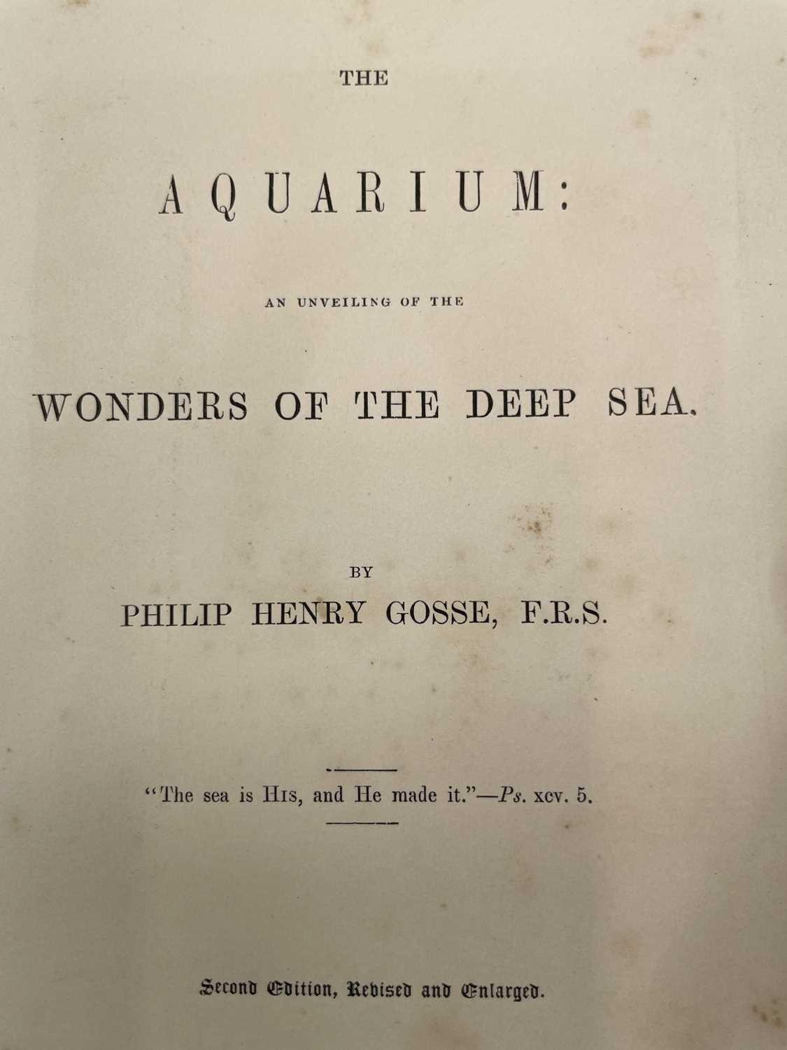 PHILIP HENRY GOSSE. 'The Aquarium: An Unveiling of the Wonders of the Deep Sea,' second edition, original cloth, colour frontis, John Van Voorst, London; 'The Ocean,' rebound, numerous engravings, Society for Promoting Christian Knowledge, London, 1854; W. SWAYSLAND. 'Familiar Wild Birds,' two volumes, half leather, colour frontis, illustrations, Cassell & Co, London, 1883; With fourteen other handsome books on natural history. (18)