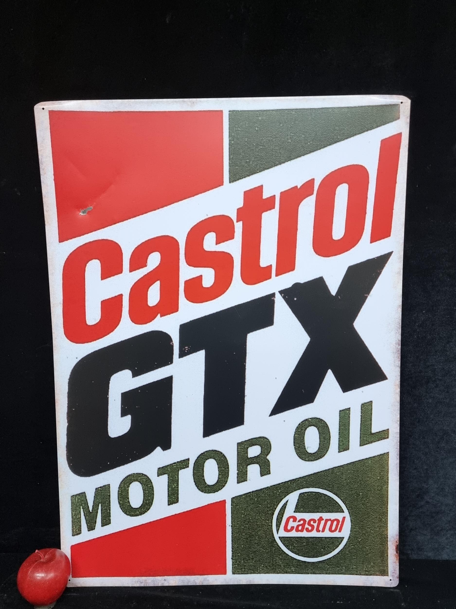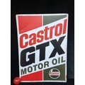 A large metal sign advertising Castrol GTX Motor Oil in the brands trademark shades of red, green and white. H: 70cm X 50cm