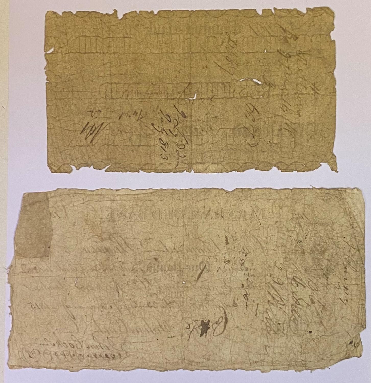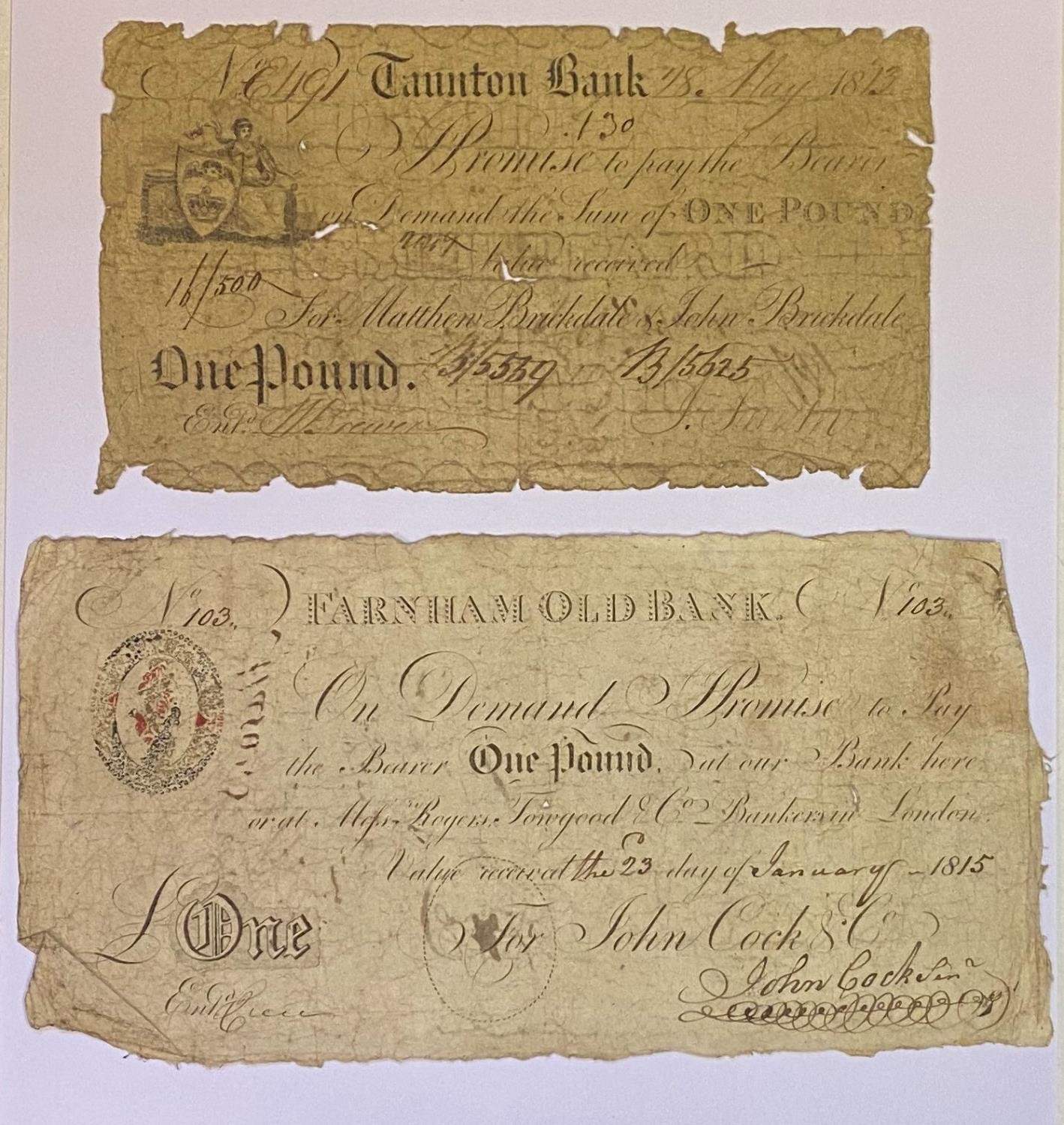 An early 19th century Farnham Old Bank £1 banknote, 1815, and a Taunton Bank banknote, 1813 (2)