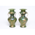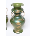 A PAIR OF ART NOUVEAU GLASS VASES of double inverted baluster form with four drawn and applied clear scroll handles, the iridescent matt green ground painted in gilt with poppy heads and leaves, 9 1/2" high (Est. plus 21% premium inc. VAT)