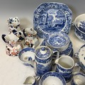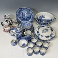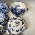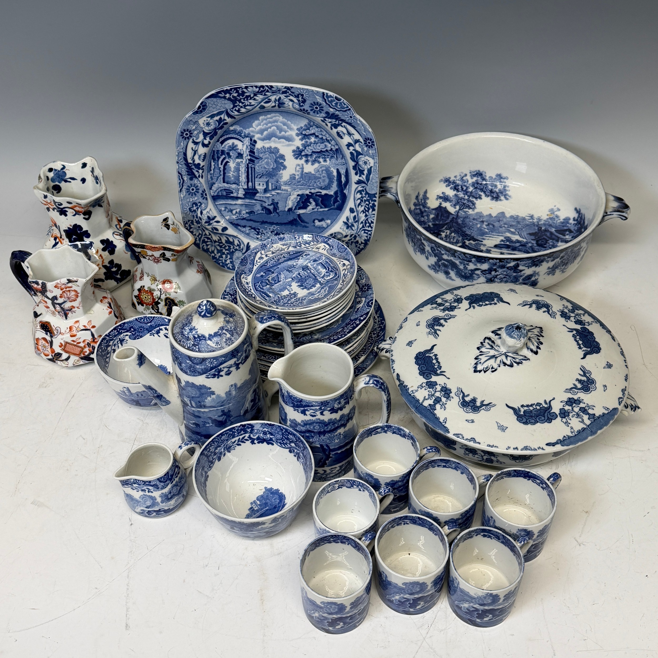Spode's Italian to comprise; seven coffee cups, a tea cup and saucer, teapot, sugar bowl, cream jugs, and a variety of plates, together with a W.M Whiteley 'Hankow' tureen and cover, one similar by Mintons, lacking cover, and three hydra Jugs; one marked 1790, K & Co.B., Late Mayers, with significant damage, one Masons patent ironstone China, and the other indistinct. (a lot)