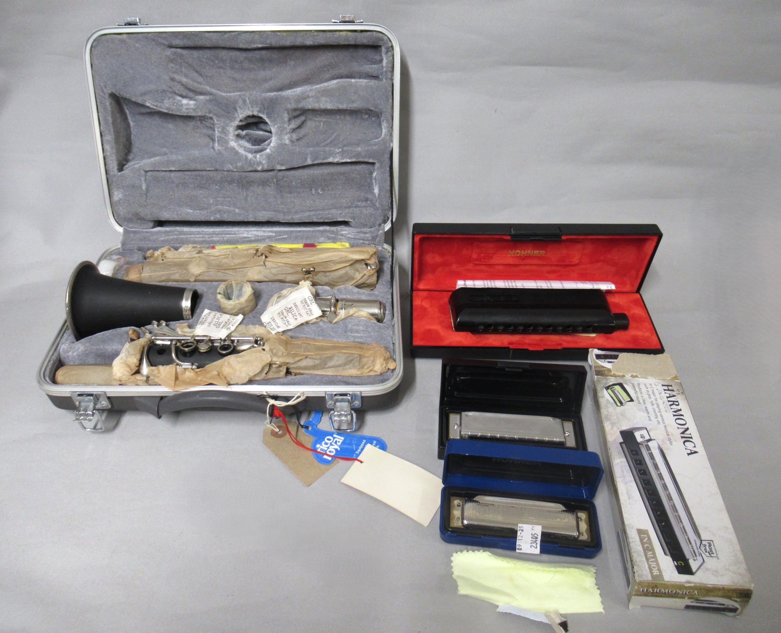 Odyssey clarinet in a fitted case, together with two Hohner harmonicas and another